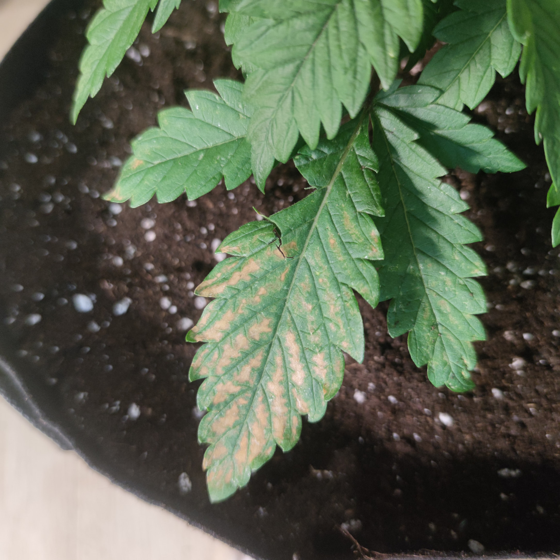 Ich hatte das Wasser erst mit Beginn der Vegetationsphase PH angepasst und letztes Mal das erste Mal 1ml biogrow pro L Wasser dazu gegeben. Nun wirken die Pflanzen in ihren kleinen Töpfen aber so, als ob sie Magnesium Mangel haben was ich mir gedacht hatte anhand der Aufhellung. Nun diese Flecken