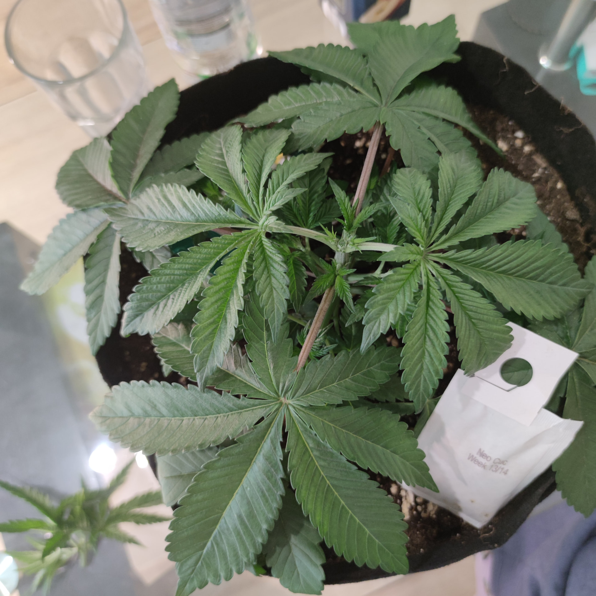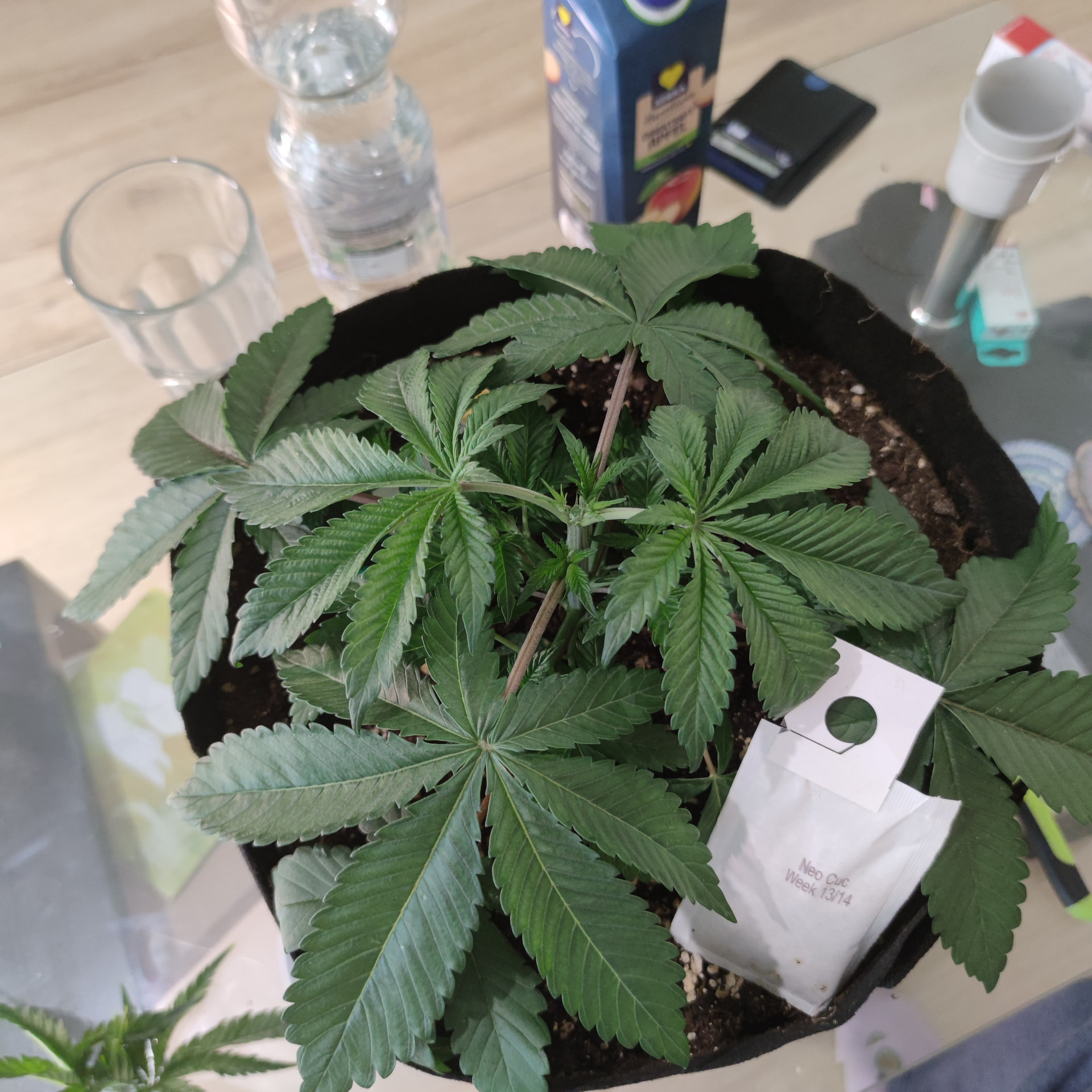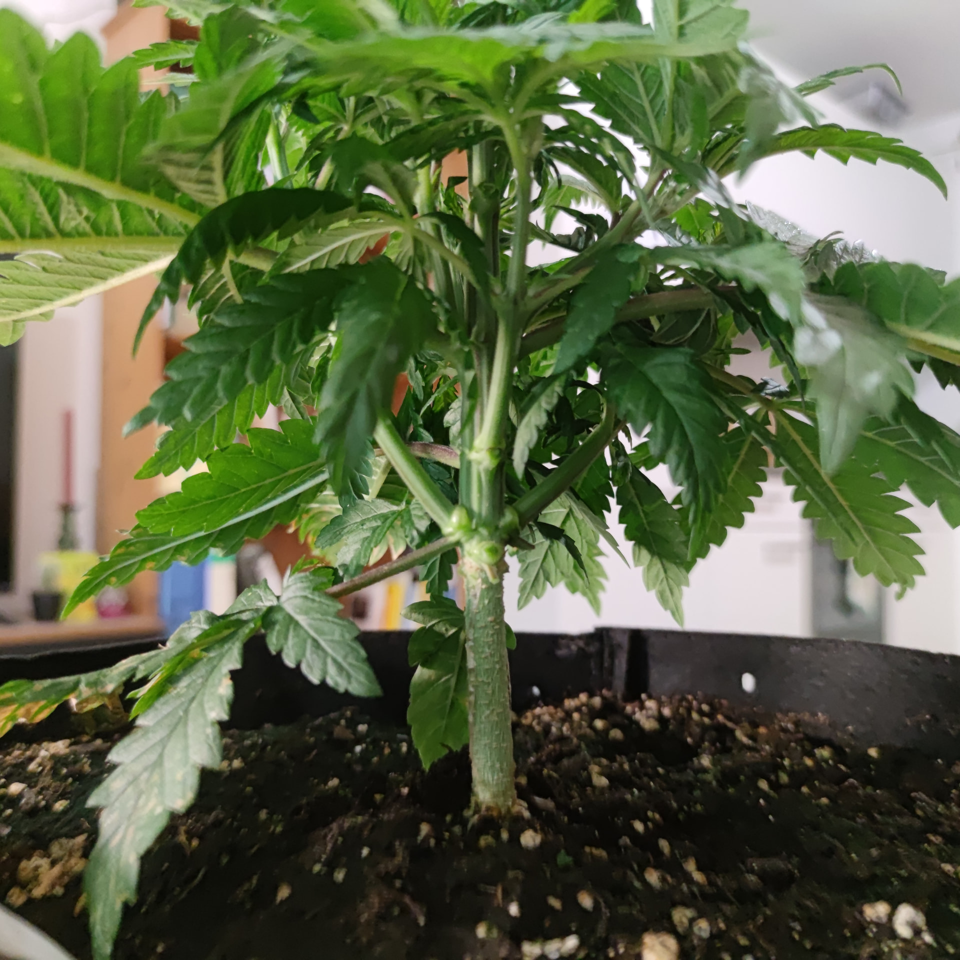 Hab bei der über der 5 Nodie gekappt. Werkzeug desinfiziert und nochmal die Seitenansicht. Bis auf die Blätter mit ihren Spots bin ich eigentlich ganz zufrieden für 2-3 Wochen Vegi bisher.