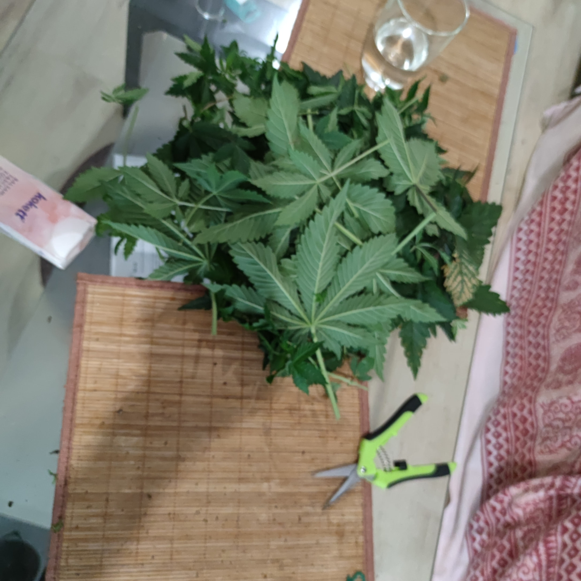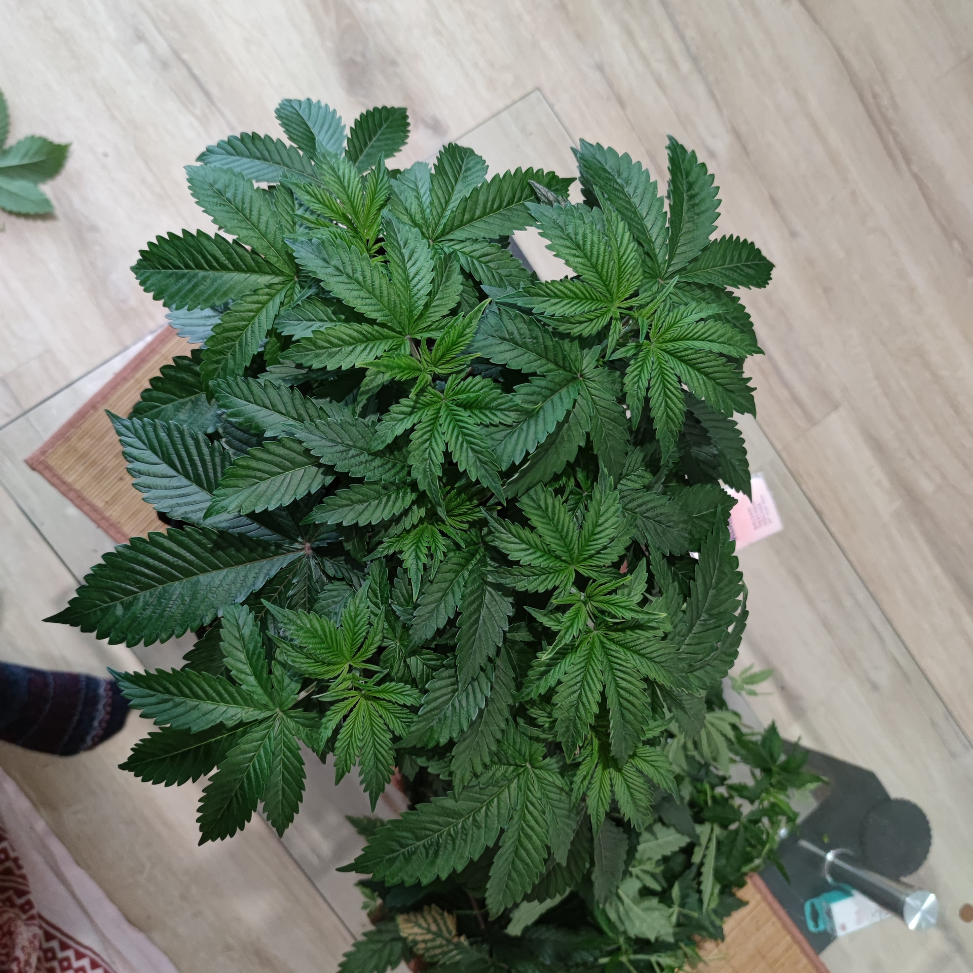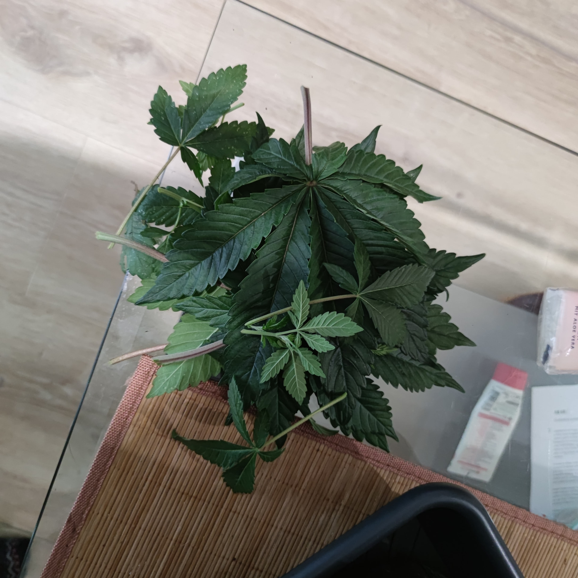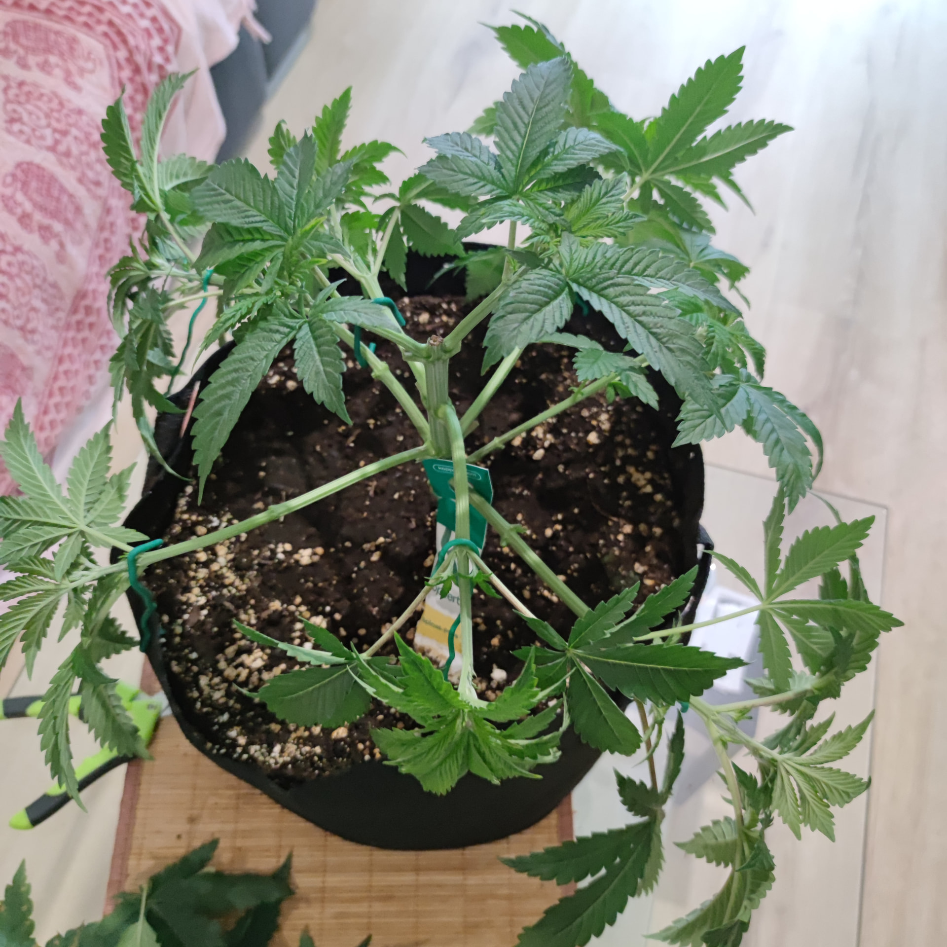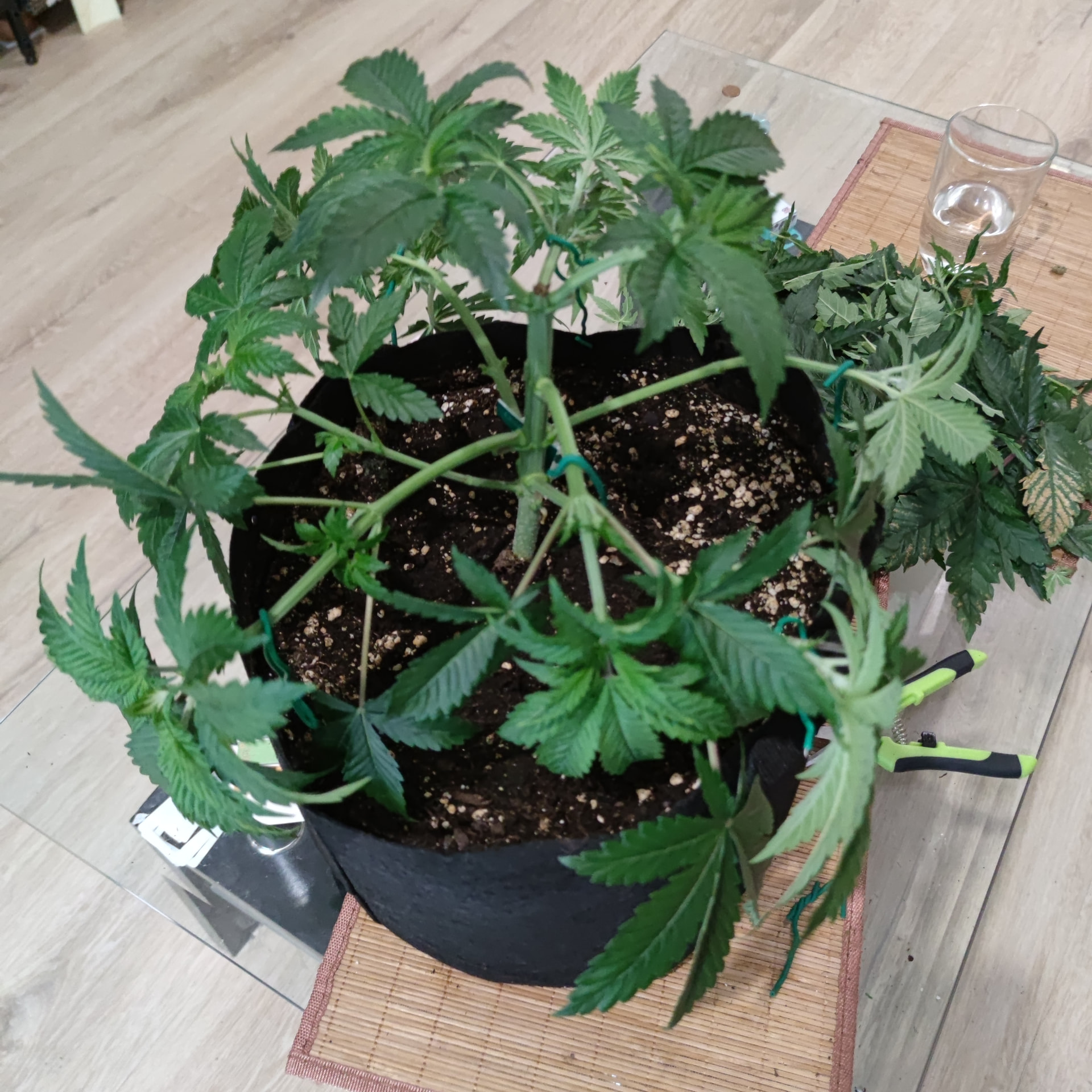 Die Blattmasse der Fächerblätter war echt Heftig. Deswegen wäre mir die Blüteeinleitung noch zu früh, erstmal muss sich das nun alles etwas erholen von dem radikalen Kahlschlag, dann nutze ich das LST um die Lücken im Zelt zu füllen, dann kommt das Netz drüber, dann geht’s in die Blüte. Ich weiß nur noch nicht, ob 8 Triebe pro Pflanze zu wenig sind, daher der Gedanke nochmal zu toppen