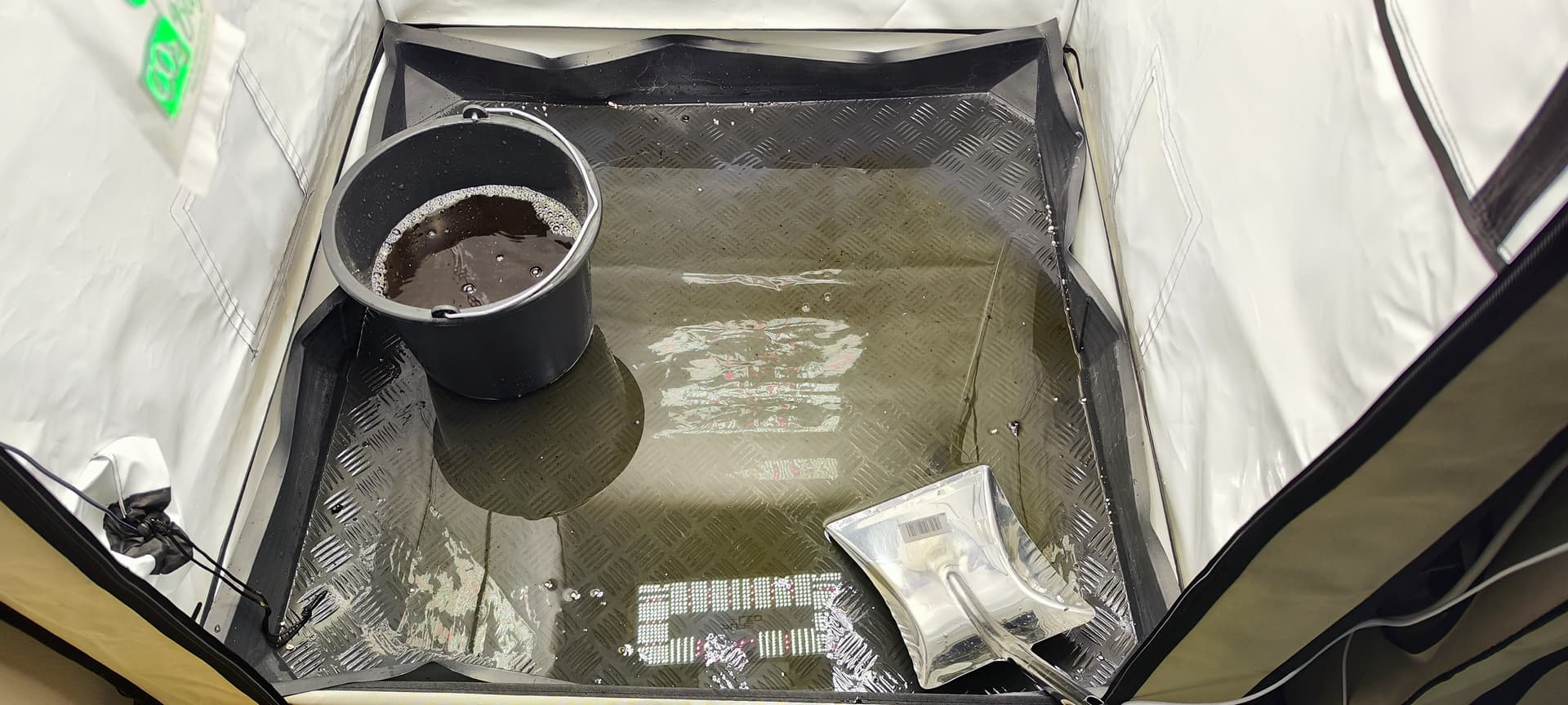 Zum Glück habe ich Sicherheitsfanatiker so eine Plastikwanne im Zelt. Und so ist alles ins Zelt gelaufen. Ca. 20 Liter.