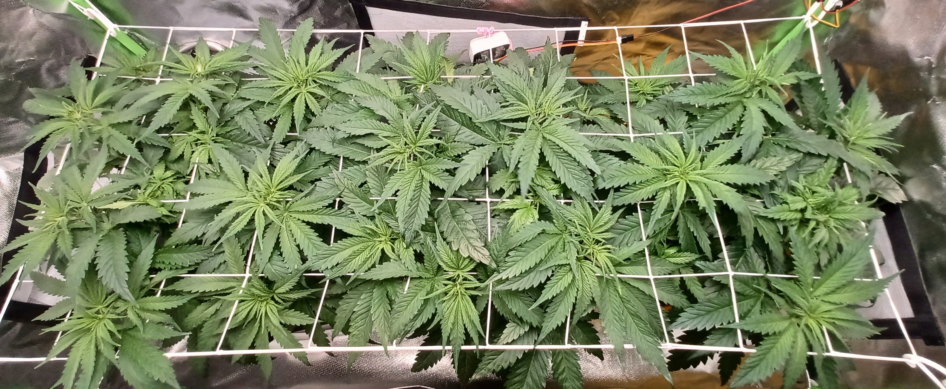 Nach dem alles vollgescrogt ist wirst du als erstes lernen müssen 50% wieder wegzuschneiten weil es anders echt zuviel kleiner Triebe sind.Aber auf die Art lernst man es am besten das selektieren über dem scrognetz nach Abschluss der scrog.