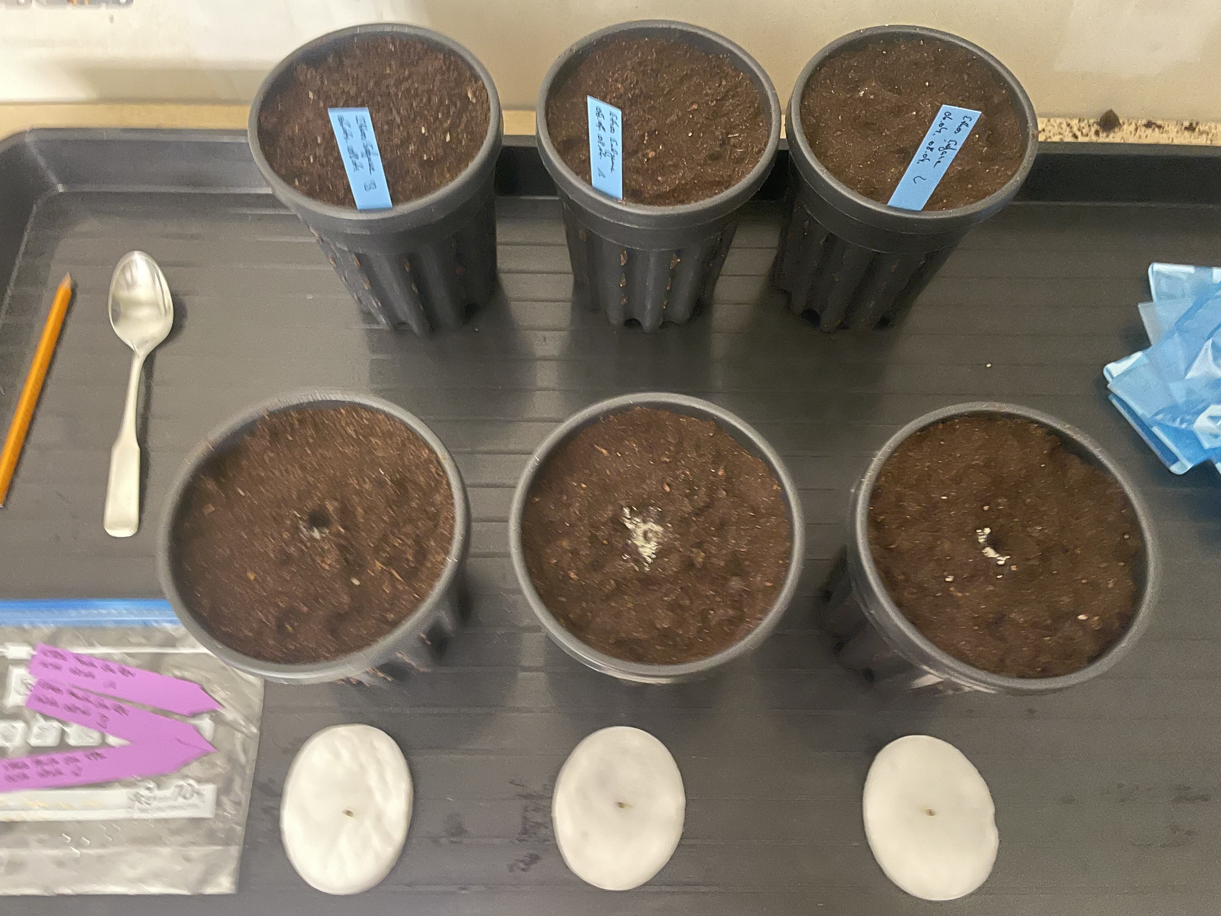 Ach ja, dieses Mal kommt eine Drainageschicht in die Töpfe, damit ich mehr Wasser von unten geben kann, ohne dass das Substrat selbst zu lange im Wasser steht.
