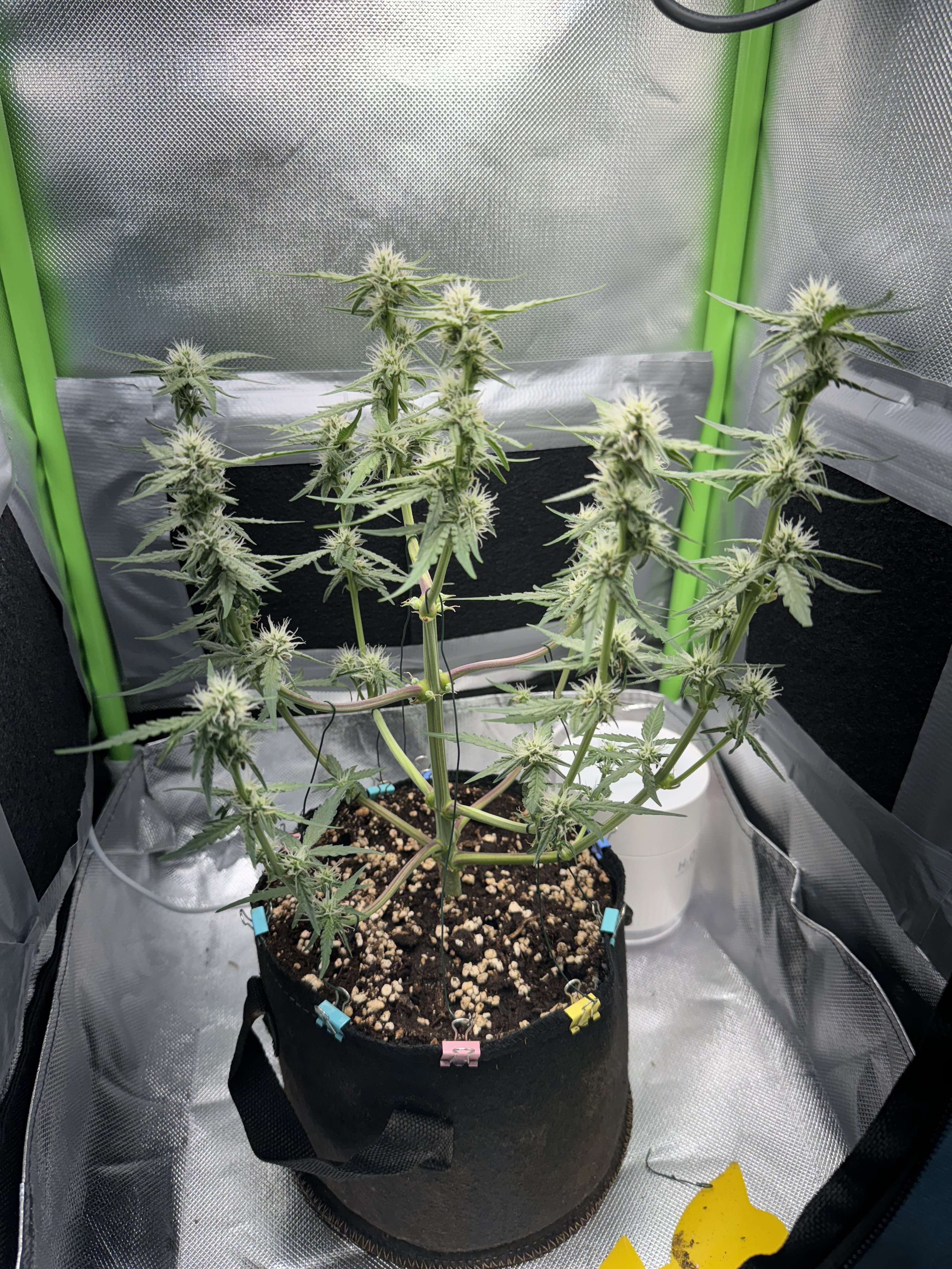 Für die oberen beiden Triebe muss ich mir noch was überlegen. Die will ich auch irgendwie runterbinden, habe aber noch keine Idee wie ich das anstellen soll.