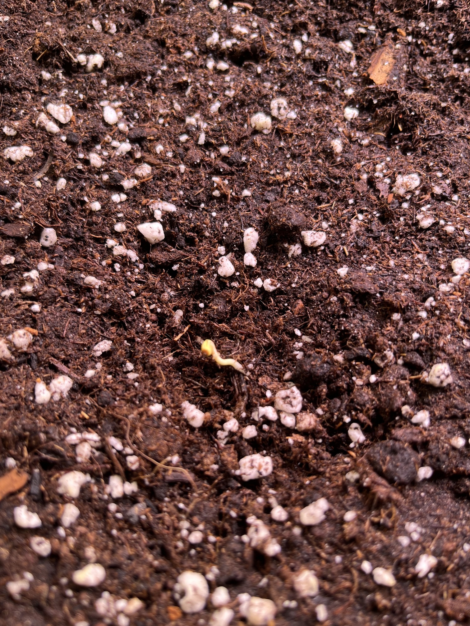Der Samen war geschlüpft, aber statt gerade aus der Erde zu wachsen lag er quasi horizontal drauf. Die Wurzel war nur minimal in der Erde, vlt 2 Millimeter. Insgesamt lag der Samen auch nicht mittig im Topf sondern seitlich verschoben.