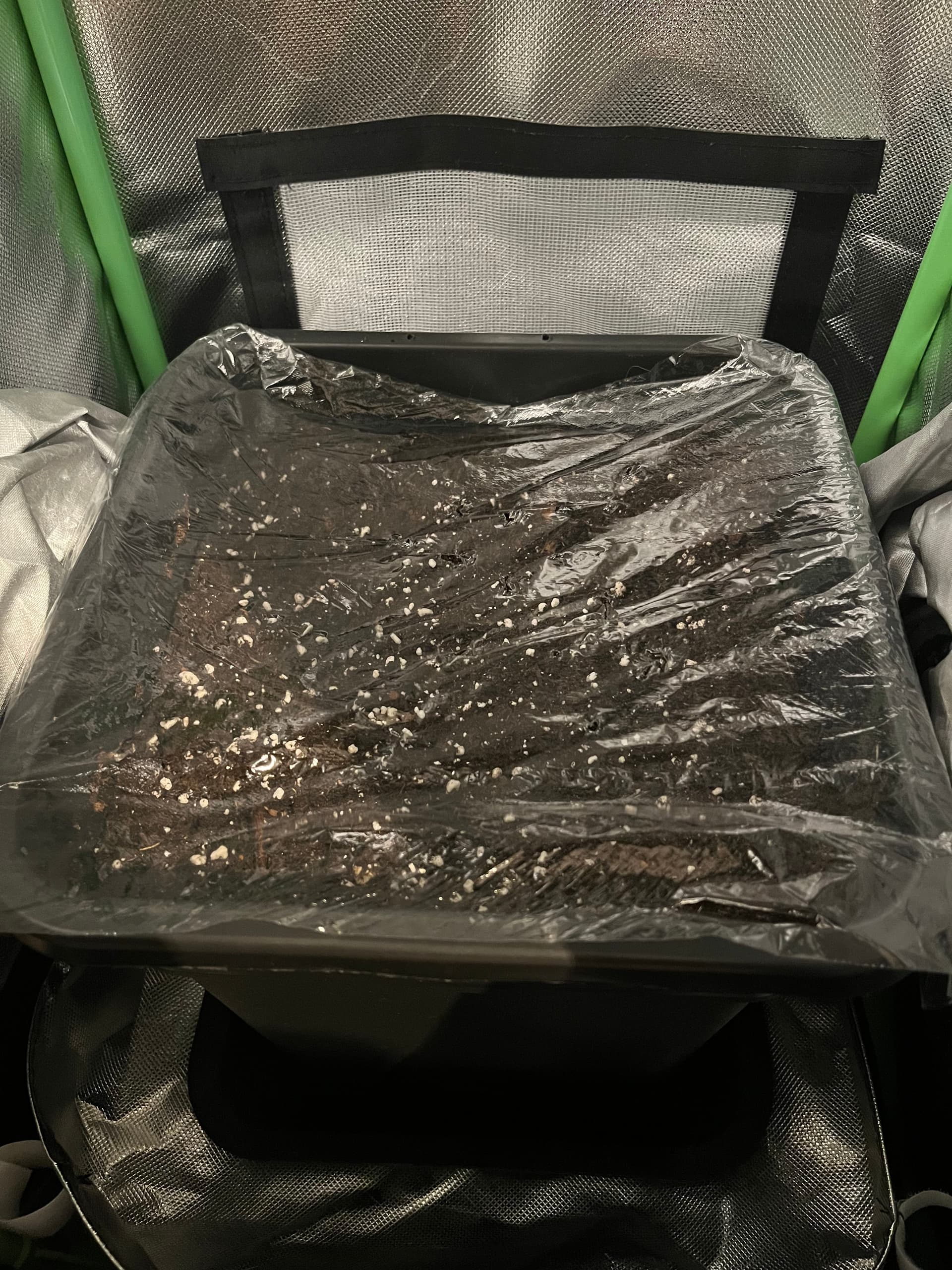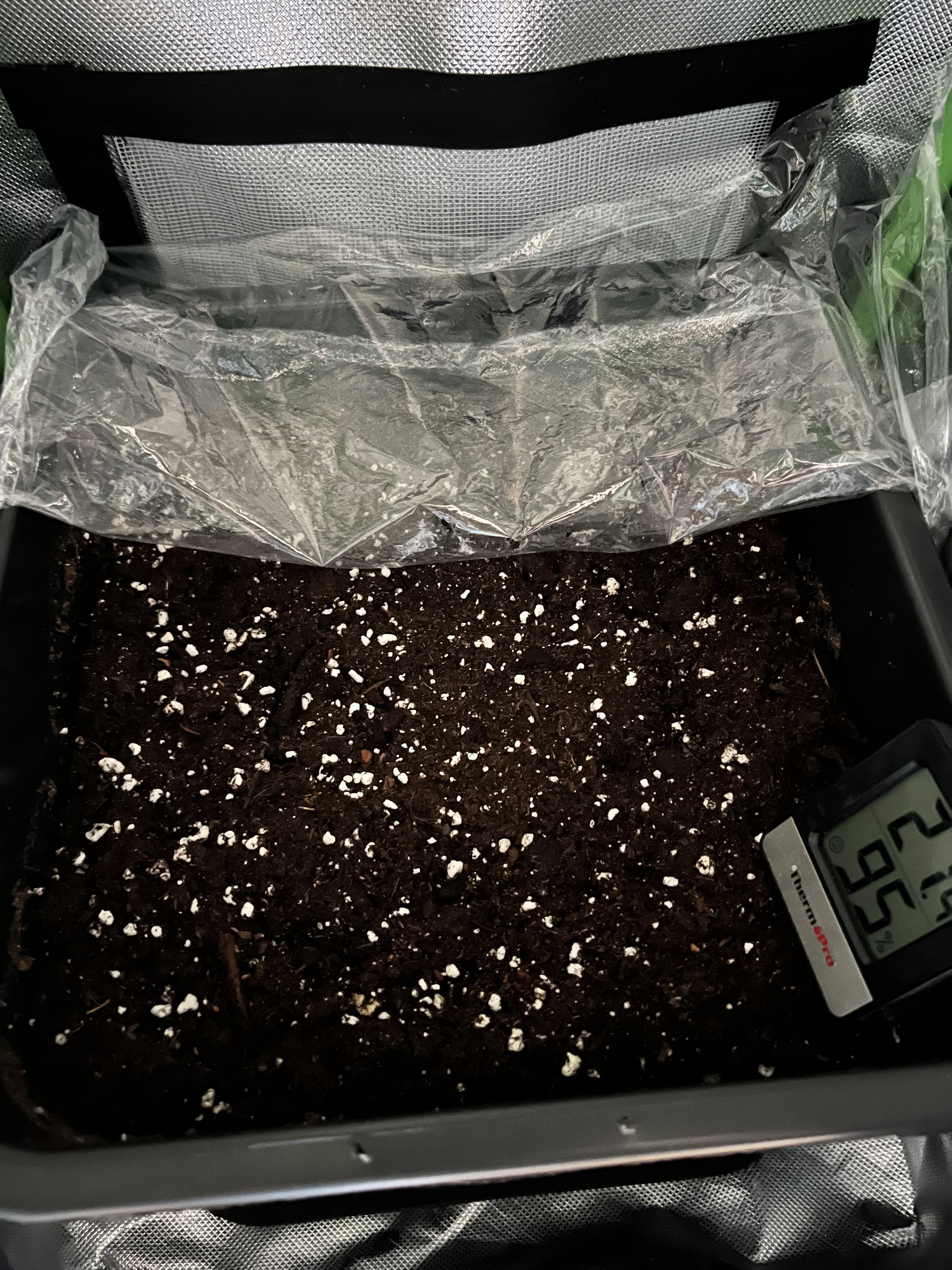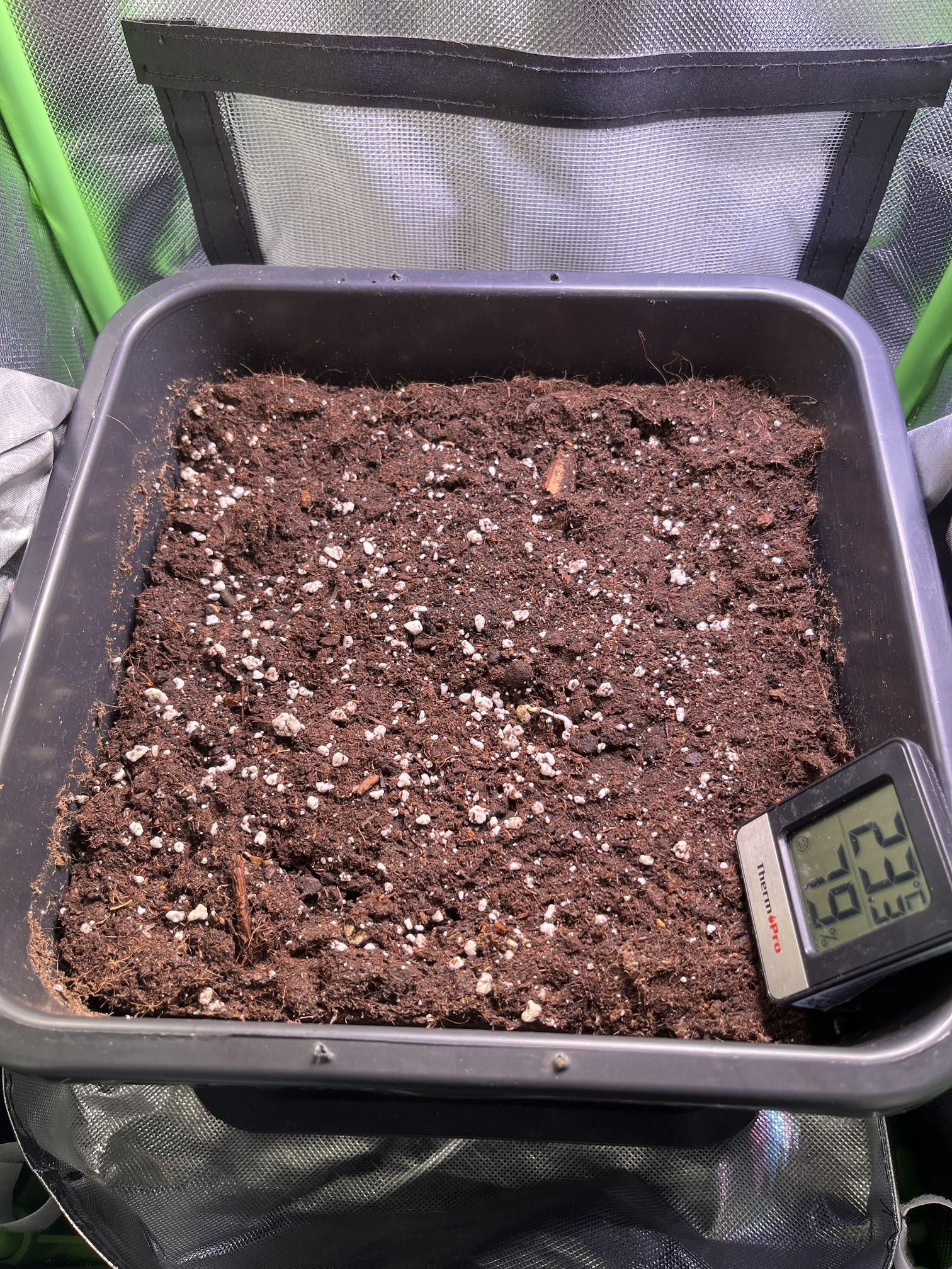 Erde wurde vor zwei Tagen bereits in den 14l Topf gefüllt und befeuchtet. Das soll ja angeblich Leben in die Bude bringen…