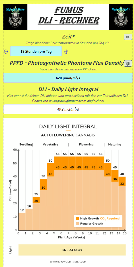 Wenn ich auf die Auto mit ner Evo 4/80 mit 100% was bei der ja z.b um die 880 µmol/m²/s sind draufdrücke, bei 20 Stunden Licht bin ich auch schon gut über 60 DLI. Wo wir ja wieder bei den 800-1000 µmol/m²/s wären.