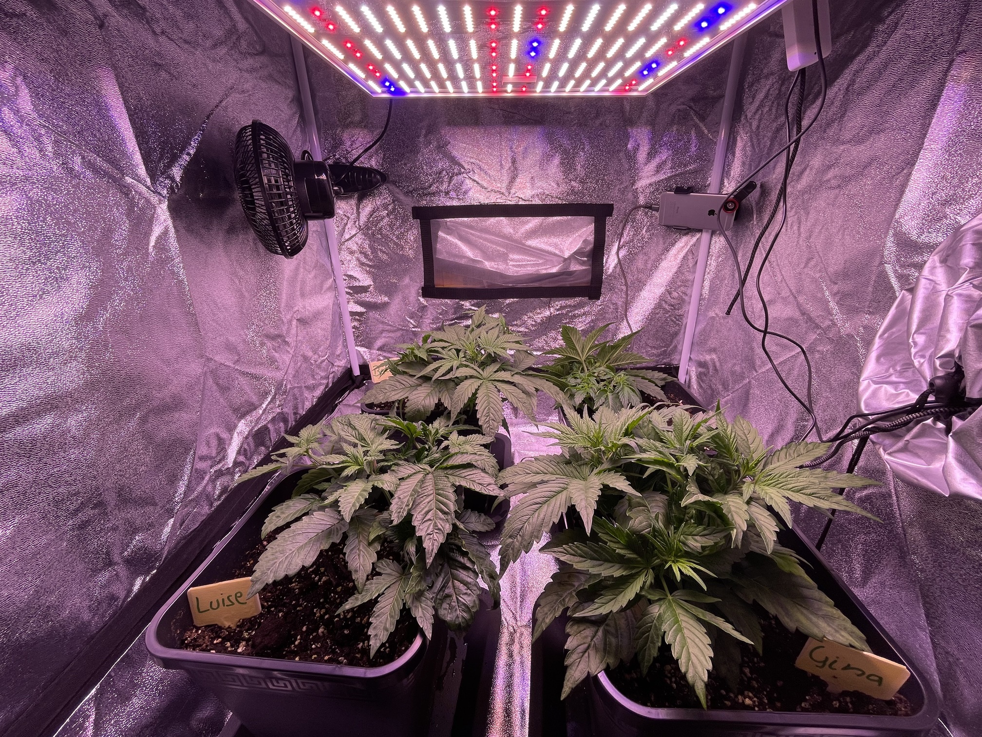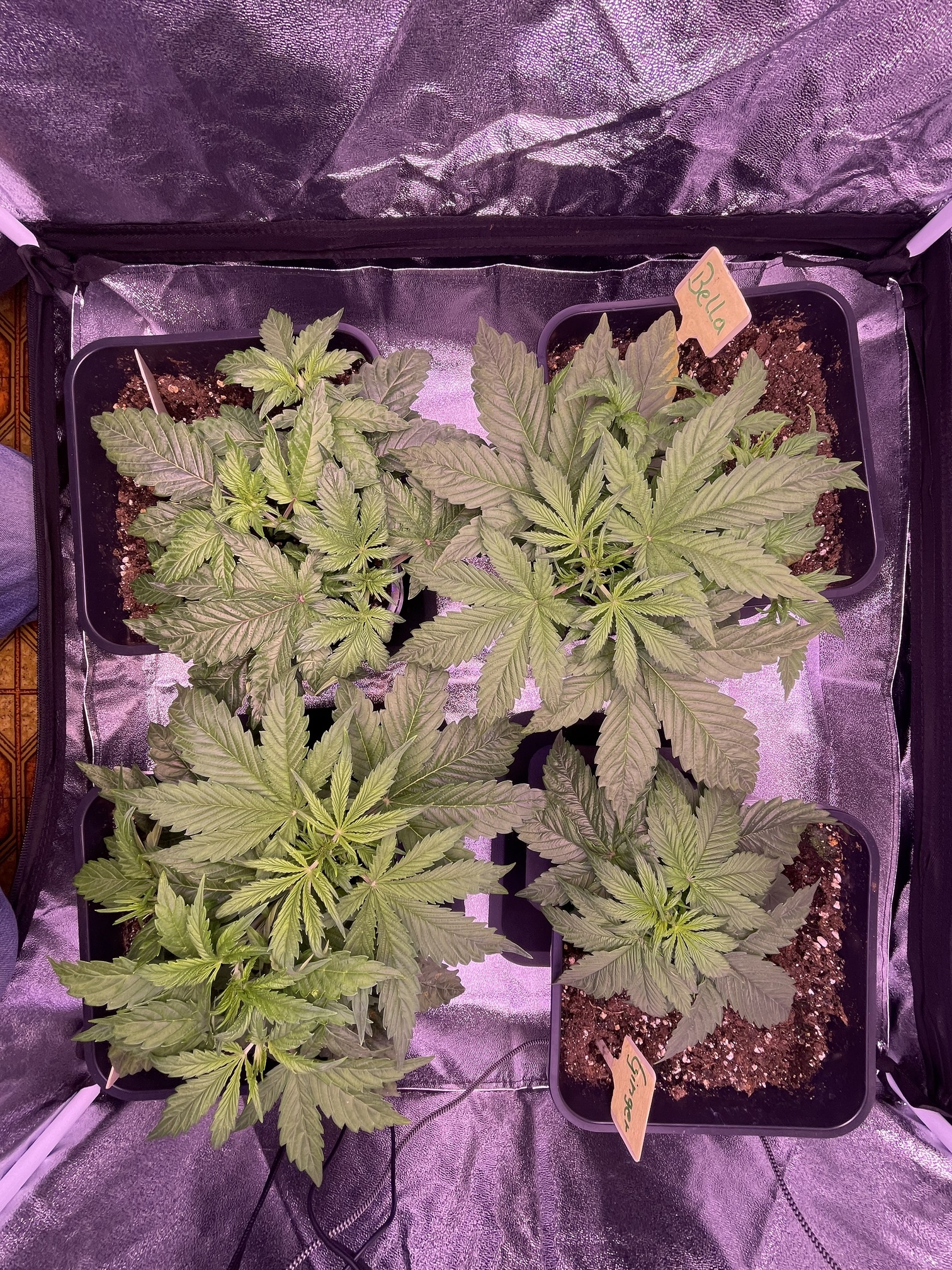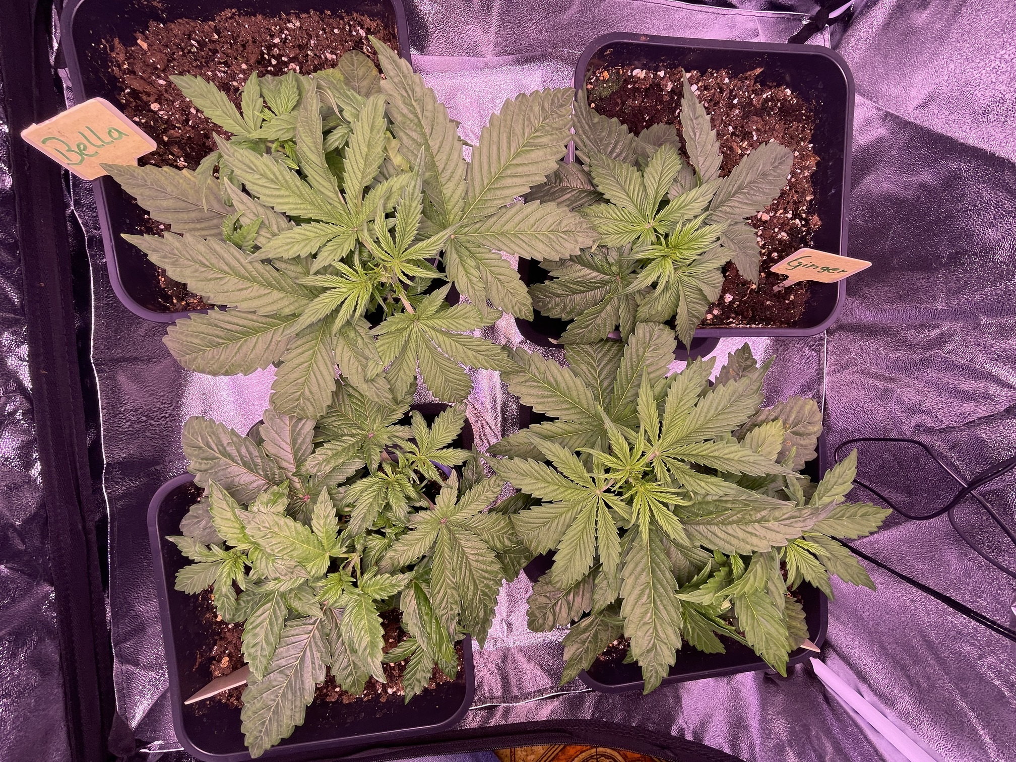 Hab eben Bella und Gina böse rangenommen. Hab mich getraut bei Gina 2 von 3 „hässlichen“ Blätter abzuschneiden. Und bei Bella ein komplettes 5-Fingerblatt, der hat zu viel verschattet. Danach habe ich sie noch weiter runtergezogen,so das die Seitenhiebe mehr Licht bekommen. Sekundäres Ziel ist es die Haupt Colas direkt unter dem Hotspot der Lampe zum blühen bekommen. Jetzt hoffen das die Mädels mir das nicht übel nehmen. Ich bin guter Dinge. Stay High Positiv .