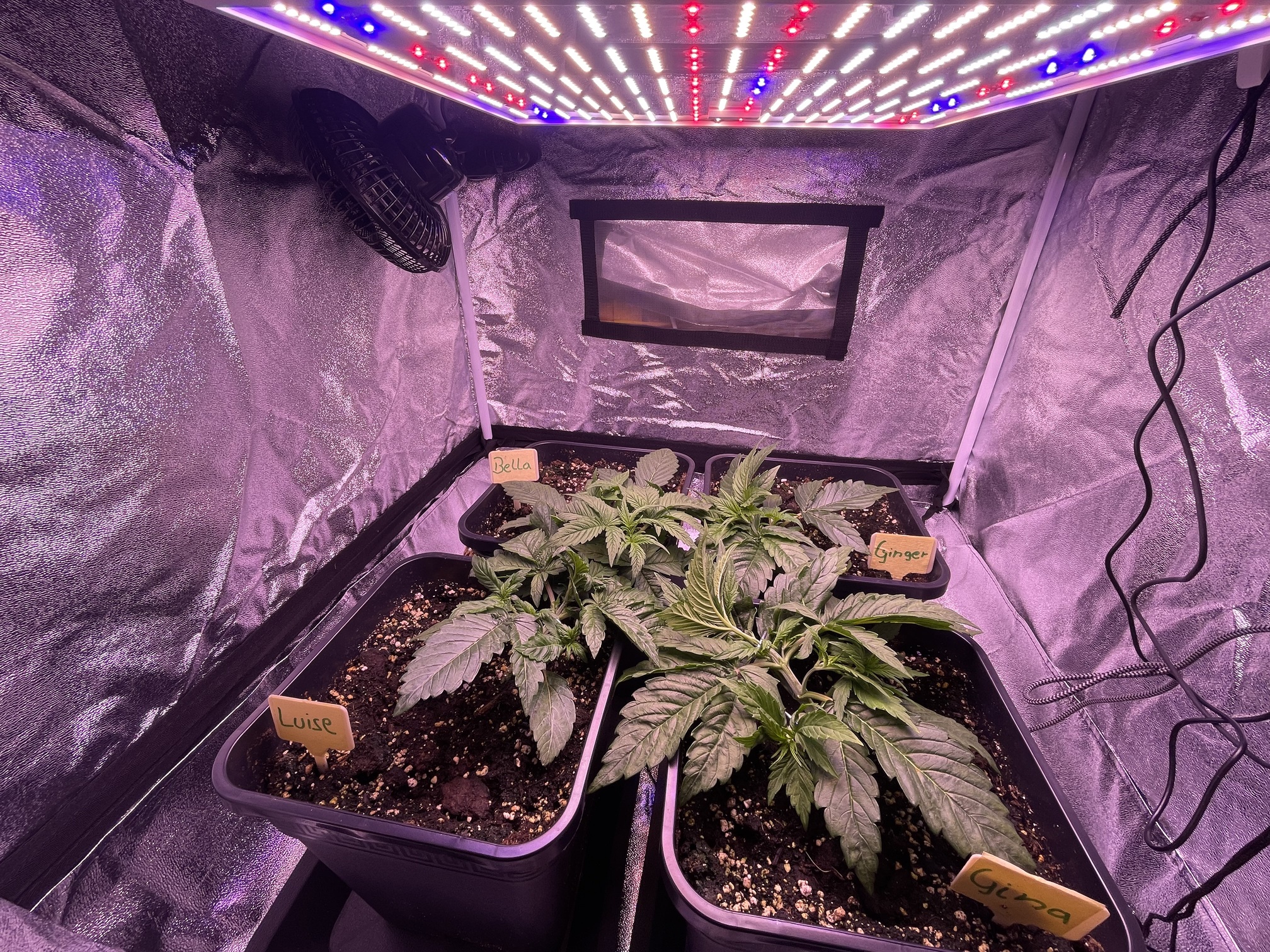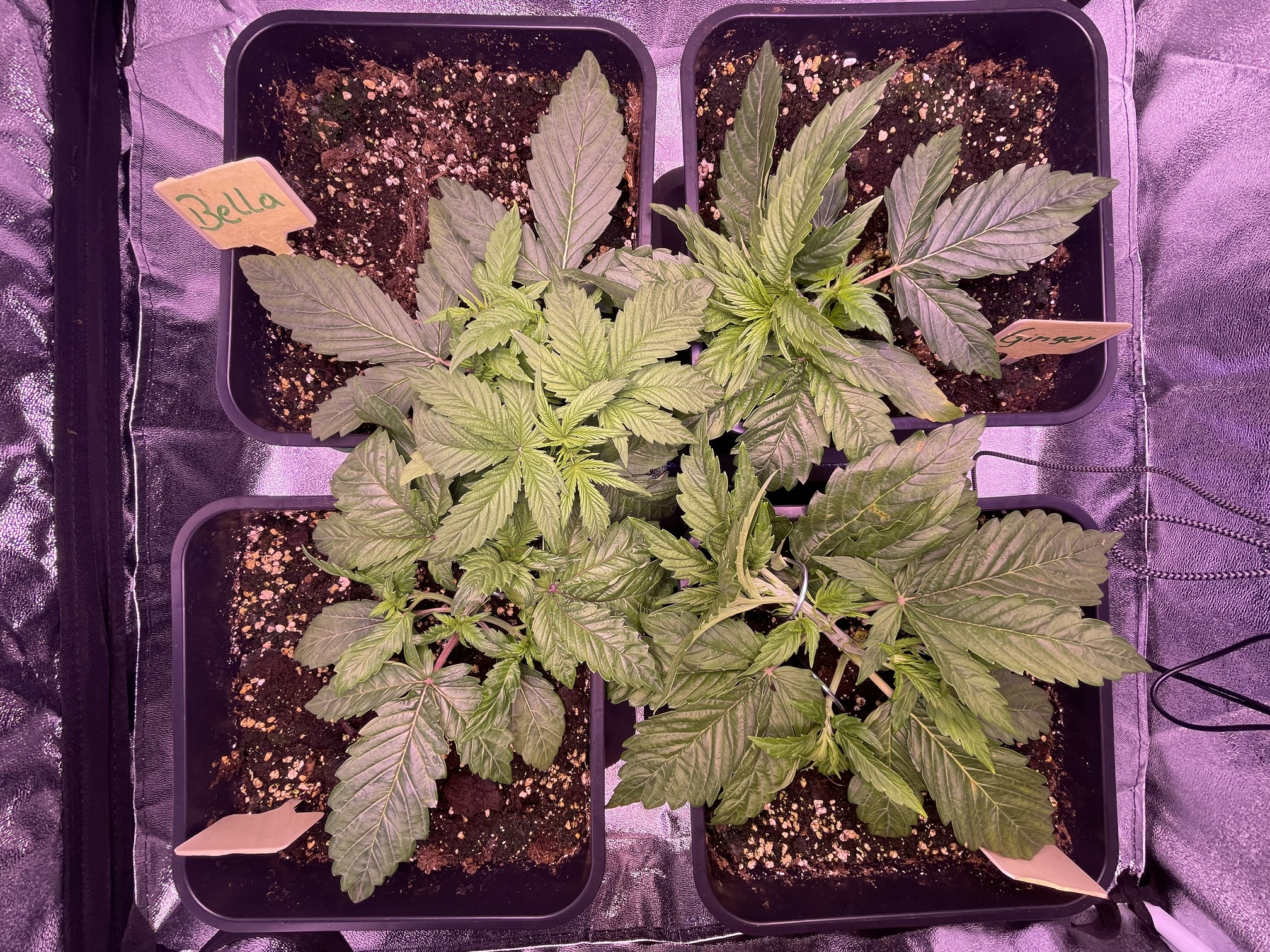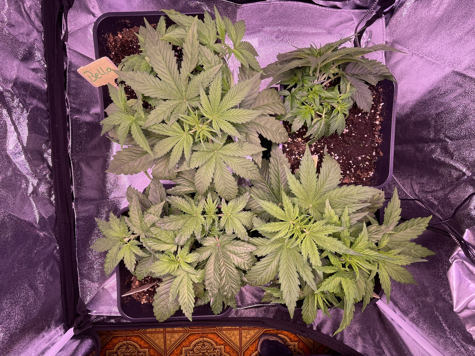 Hab eben Bella und Gina böse rangenommen. Hab mich getraut bei Gina 2 von 3 „hässlichen“ Blätter abzuschneiden. Und bei Bella ein komplettes 5-Fingerblatt, der hat zu viel verschattet. Danach habe ich sie noch weiter runtergezogen,so das die Seitenhiebe mehr Licht bekommen. Sekundäres Ziel ist es die Haupt Colas direkt unter dem Hotspot der Lampe zum blühen bekommen. Jetzt hoffen das die Mädels mir das nicht übel nehmen. Ich bin guter Dinge. Stay High Positiv .