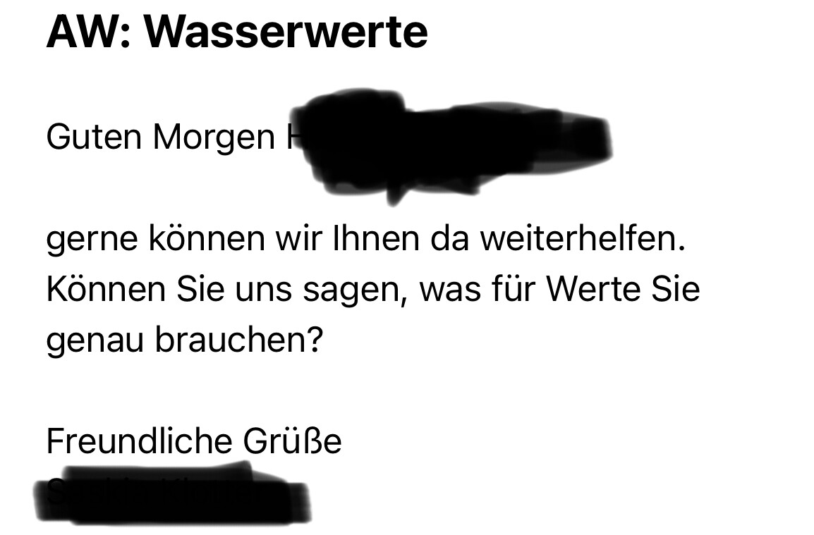 Hallo Freunde, hab mal ne Anfrage an die Wasserversorgung bei uns im Ort gestellt. Dies war die Antwort der netten Dame. Was antworte ich ihr? Könnt ihr mir da helfen?