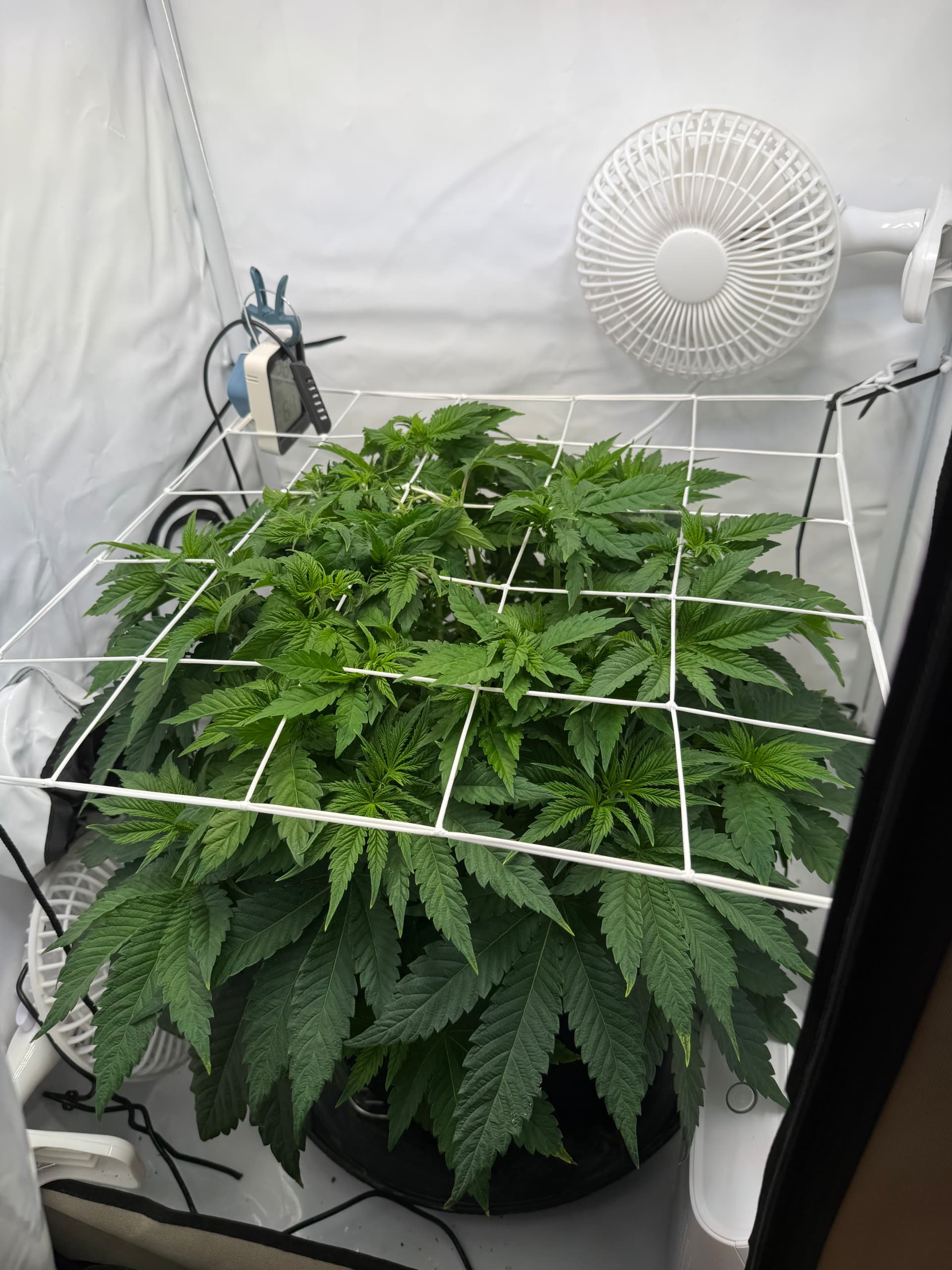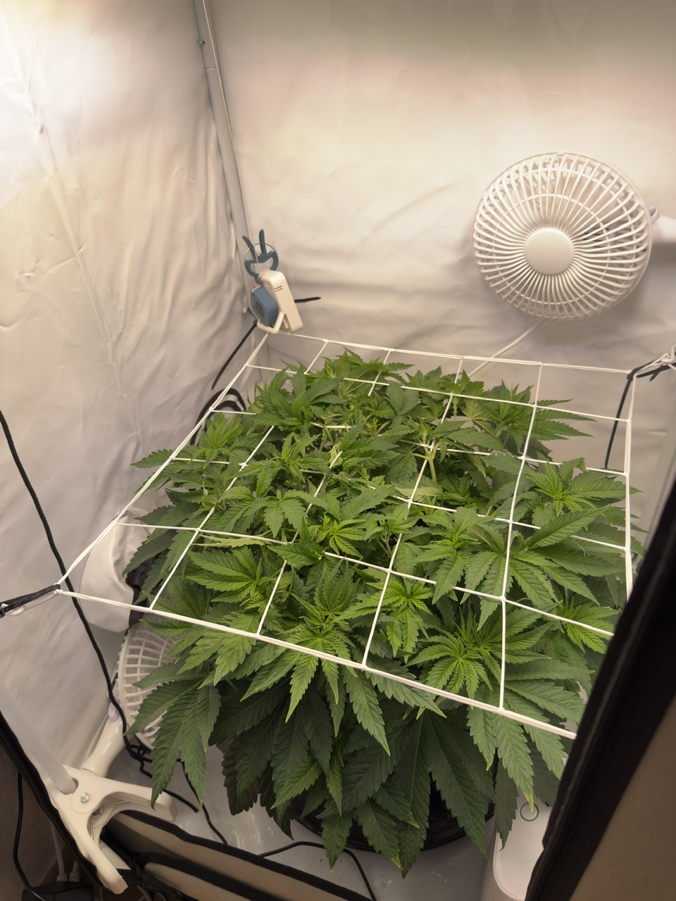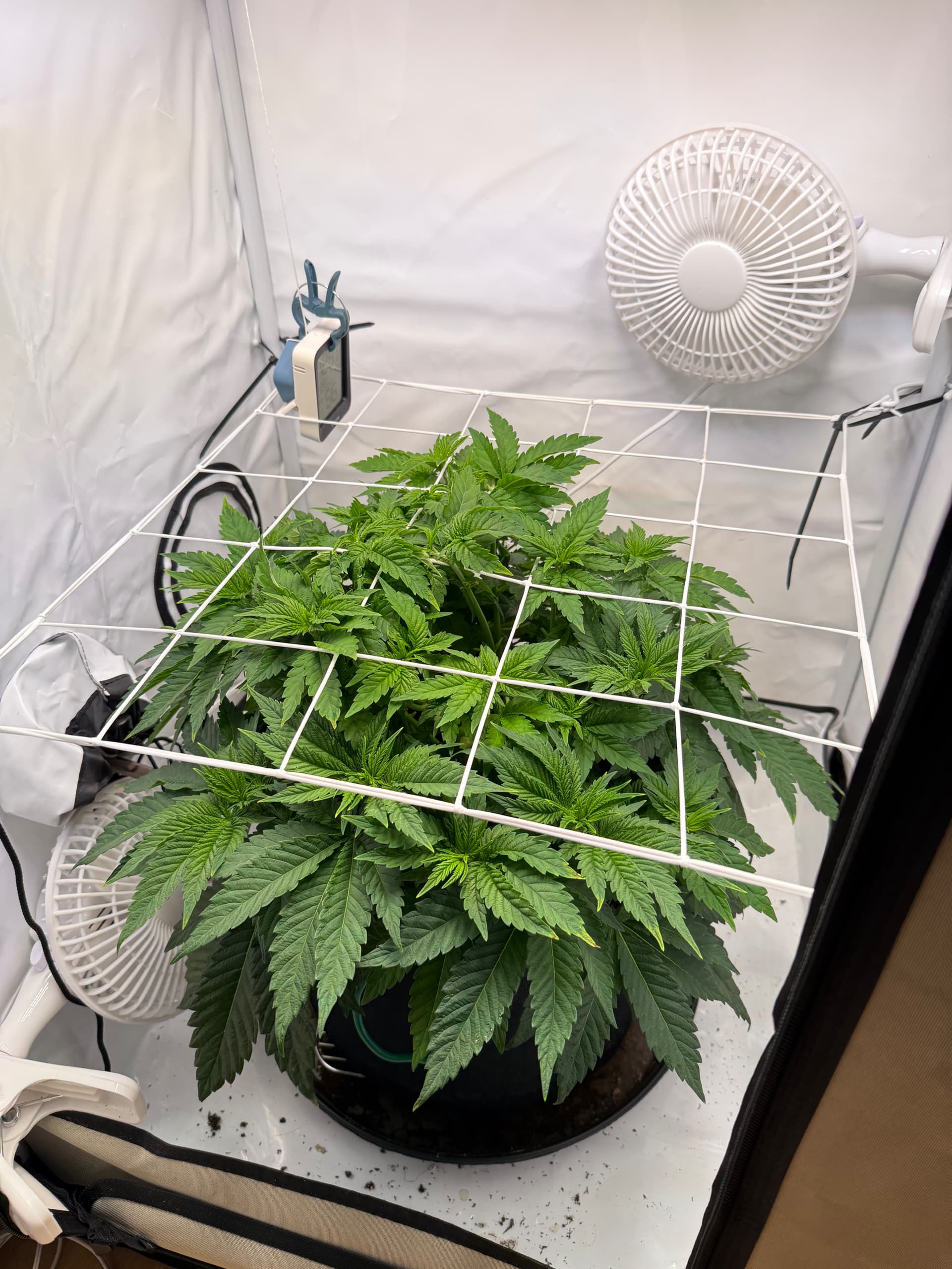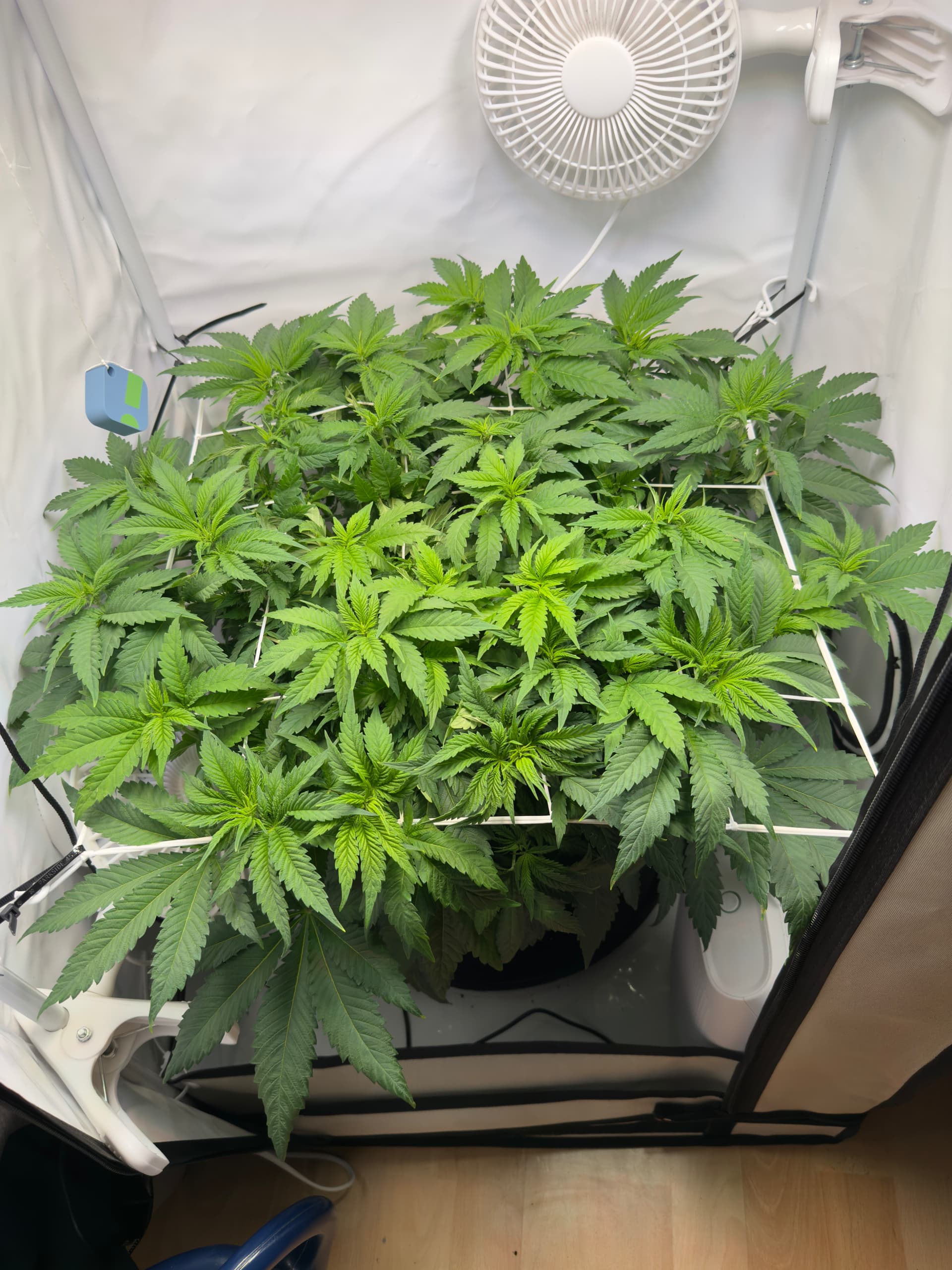 Es läuft sehr gut. Das Netz ist inzwischen montiert und wird von der Pflanze zügig eingenommen. Das Wachstum schreitet deutlich schneller voran als ursprünglich erwartet, sodass ich mich entschieden habe, am Ende dieser Woche auf 12/12 umzustellen. Geplant war ursprünglich eine um 1–2 Wochen längere Vegetationsphase.