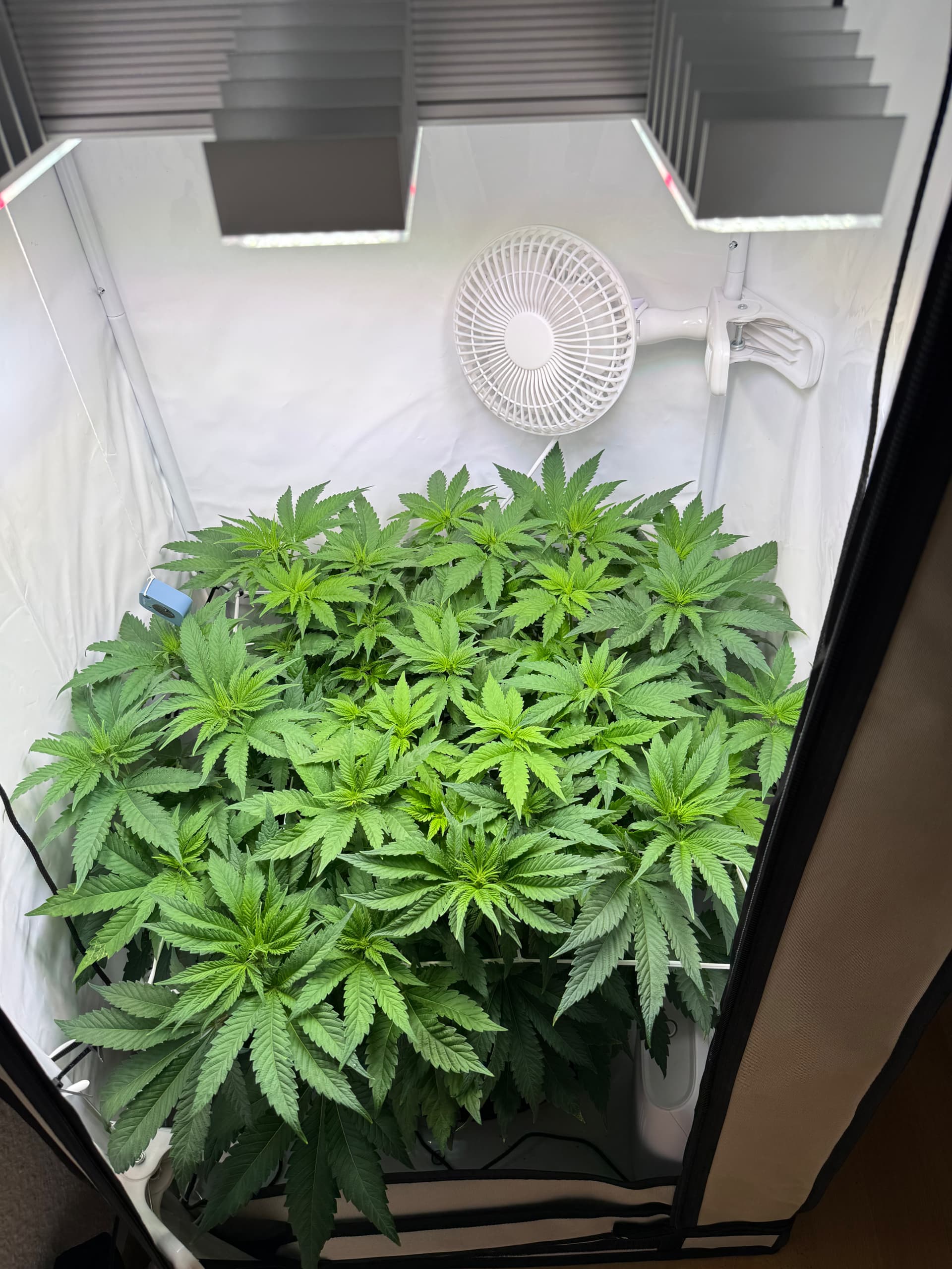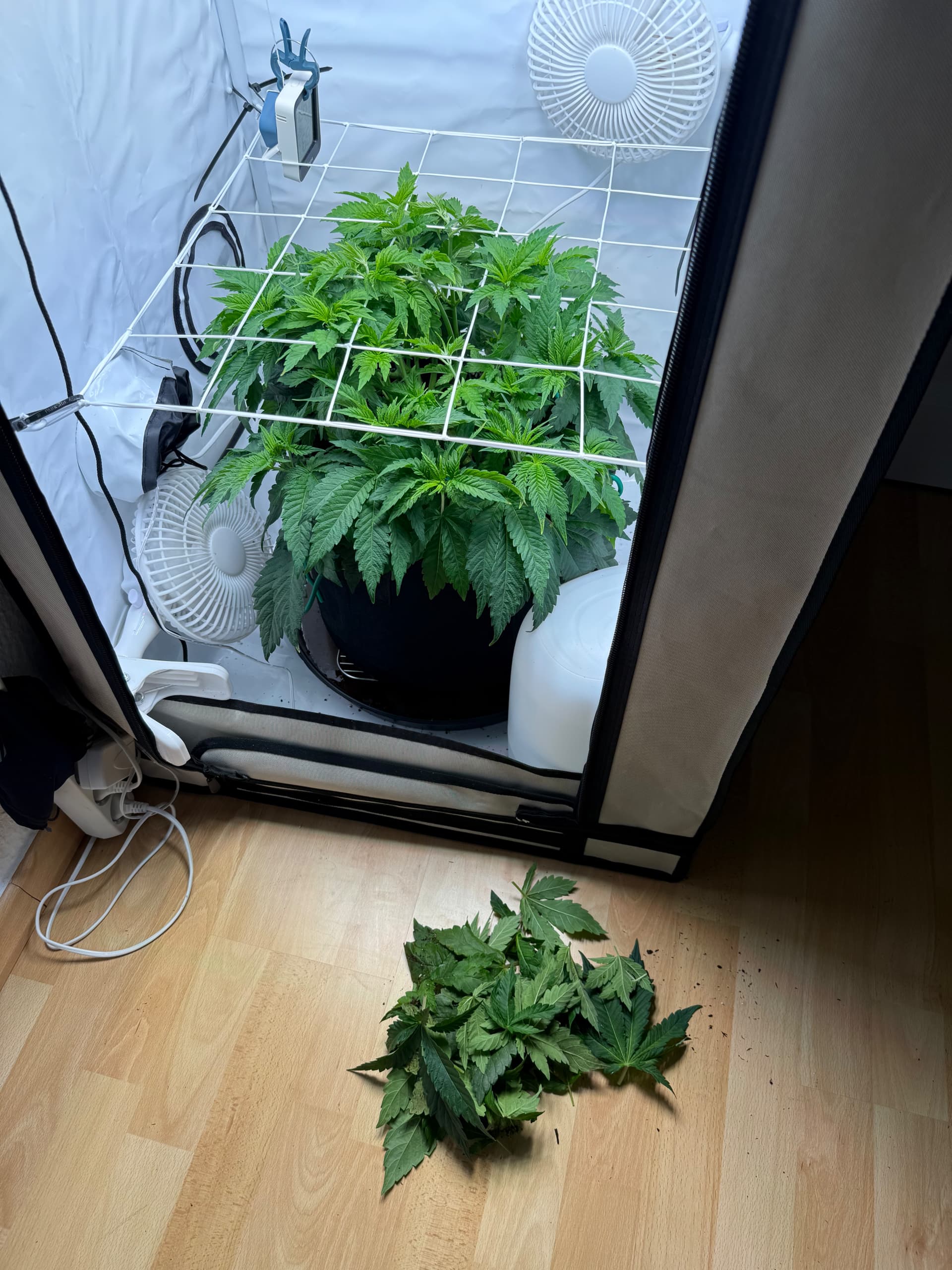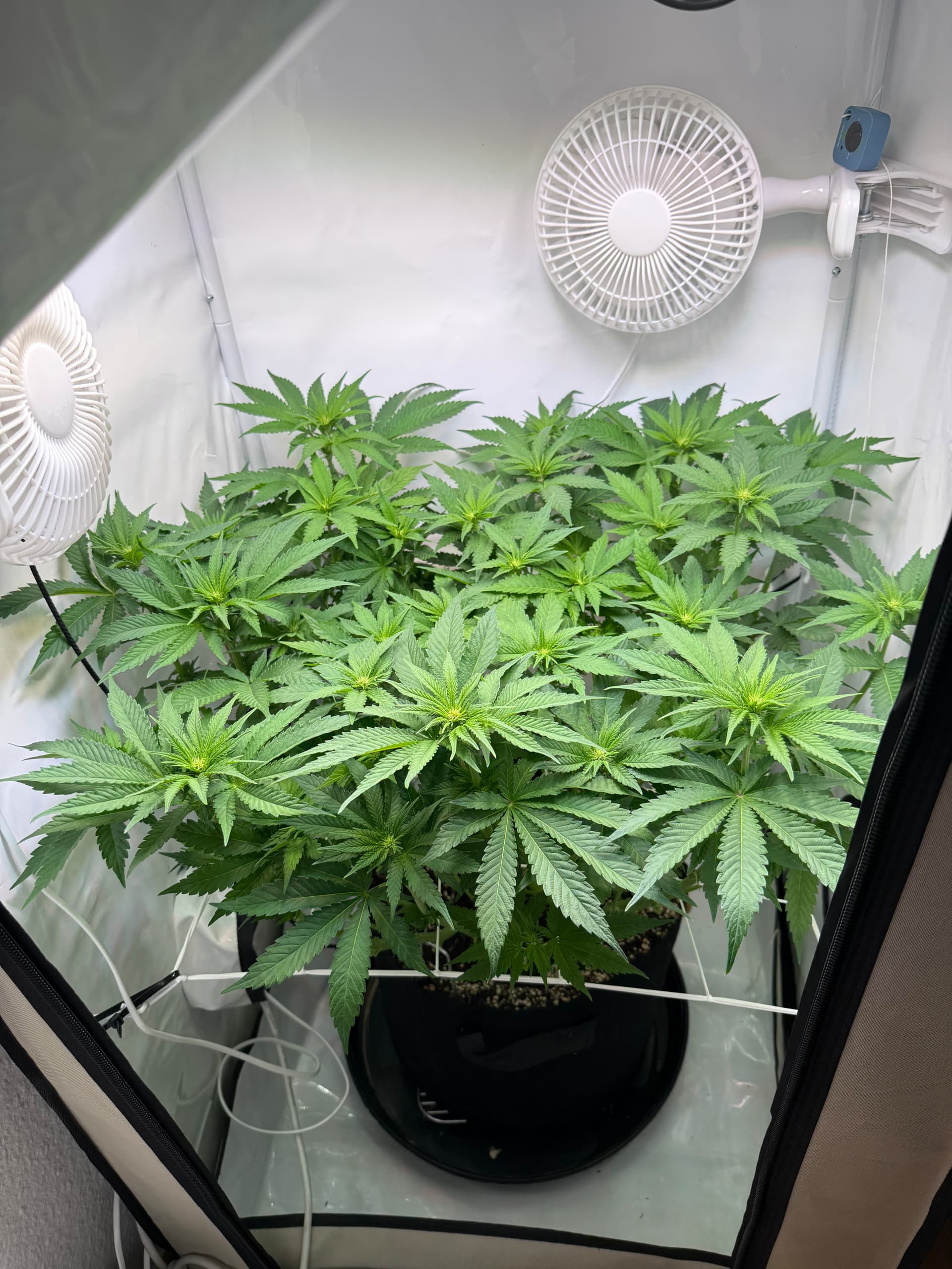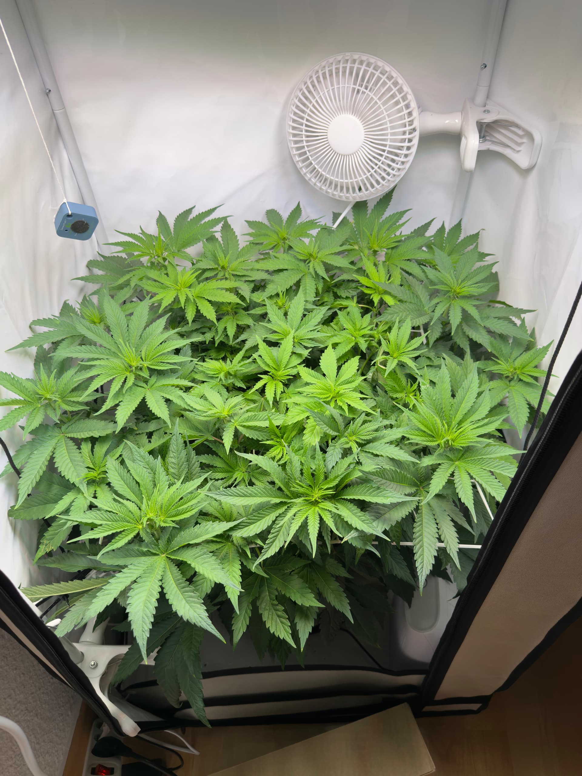 Es läuft sehr gut. Das Netz ist inzwischen montiert und wird von der Pflanze zügig eingenommen. Das Wachstum schreitet deutlich schneller voran als ursprünglich erwartet, sodass ich mich entschieden habe, am Ende dieser Woche auf 12/12 umzustellen. Geplant war ursprünglich eine um 1–2 Wochen längere Vegetationsphase.