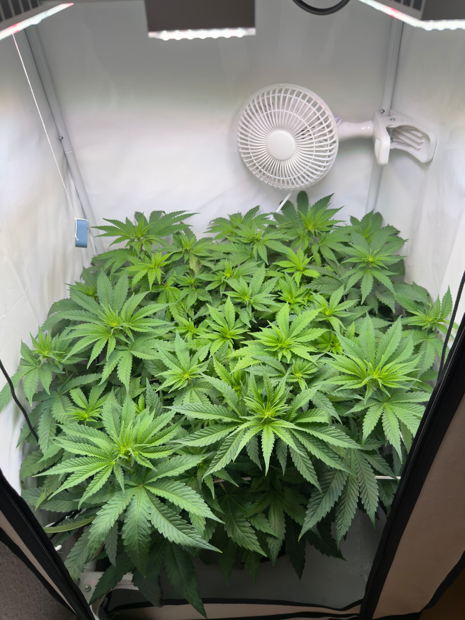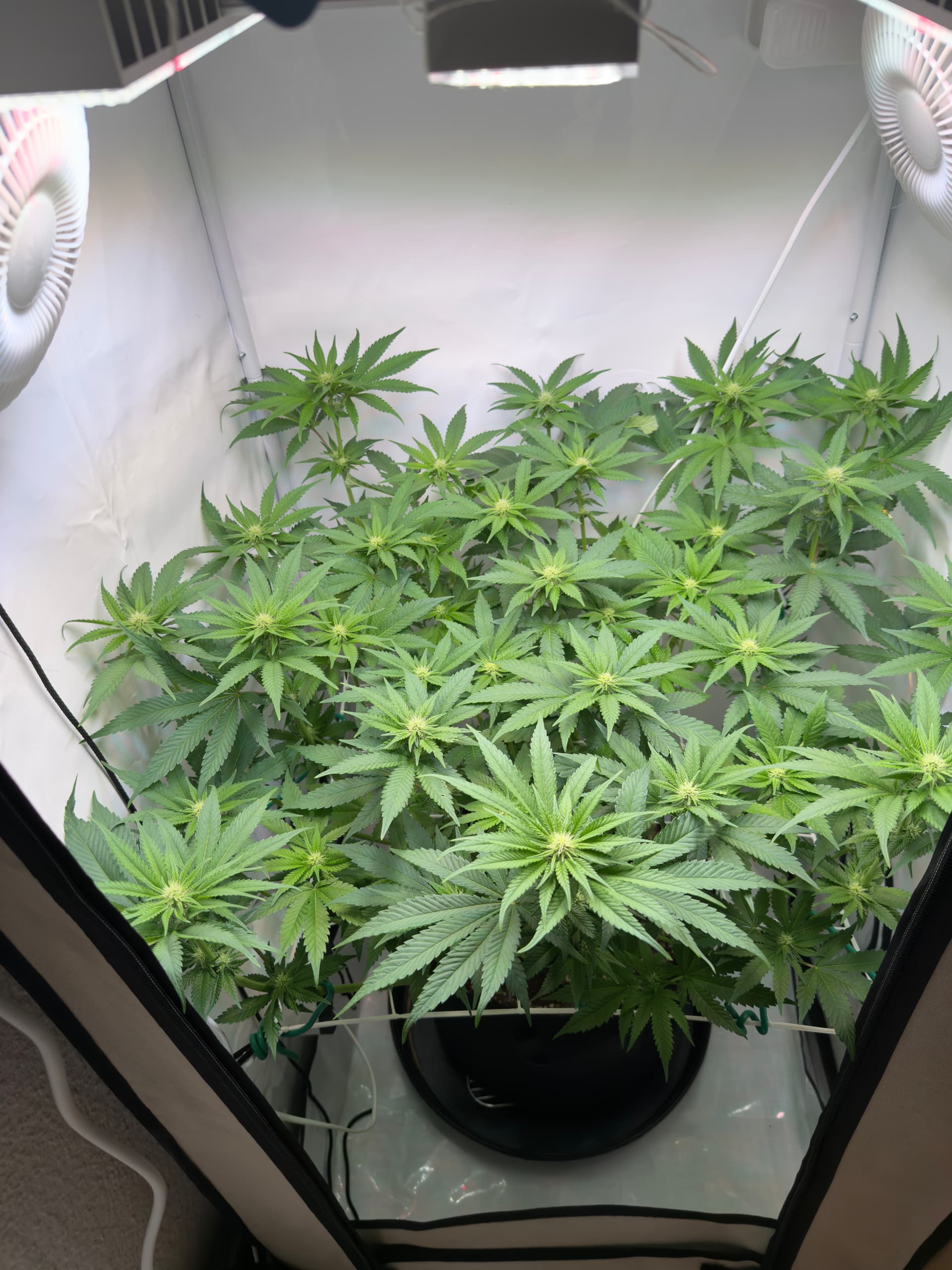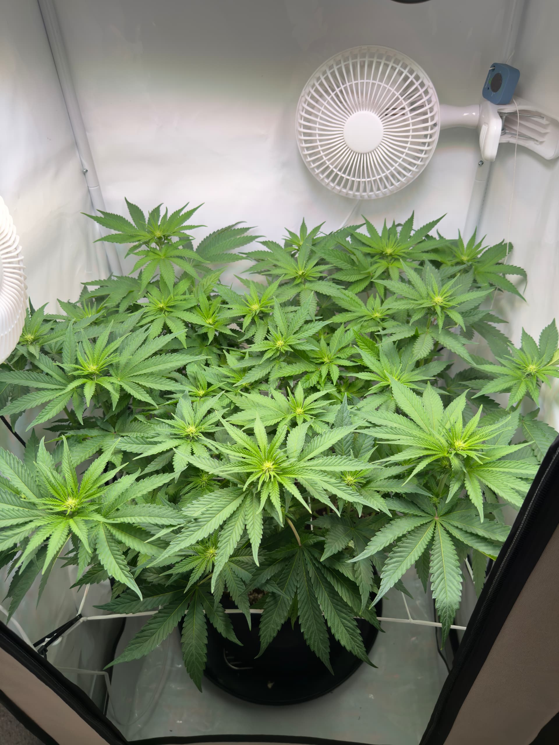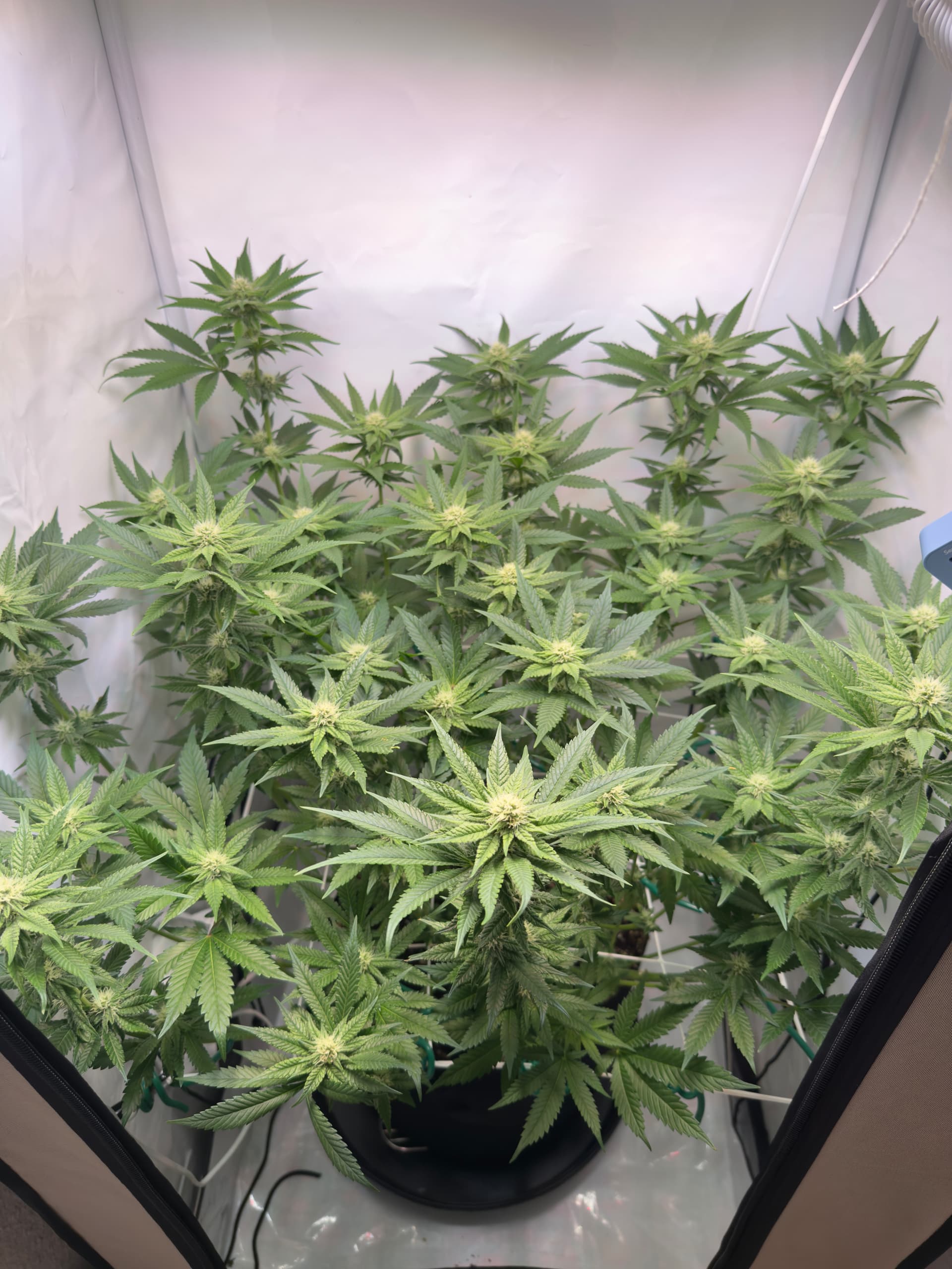 Es läuft sehr gut. Das Netz ist inzwischen montiert und wird von der Pflanze zügig eingenommen. Das Wachstum schreitet deutlich schneller voran als ursprünglich erwartet, sodass ich mich entschieden habe, am Ende dieser Woche auf 12/12 umzustellen. Geplant war ursprünglich eine um 1–2 Wochen längere Vegetationsphase.