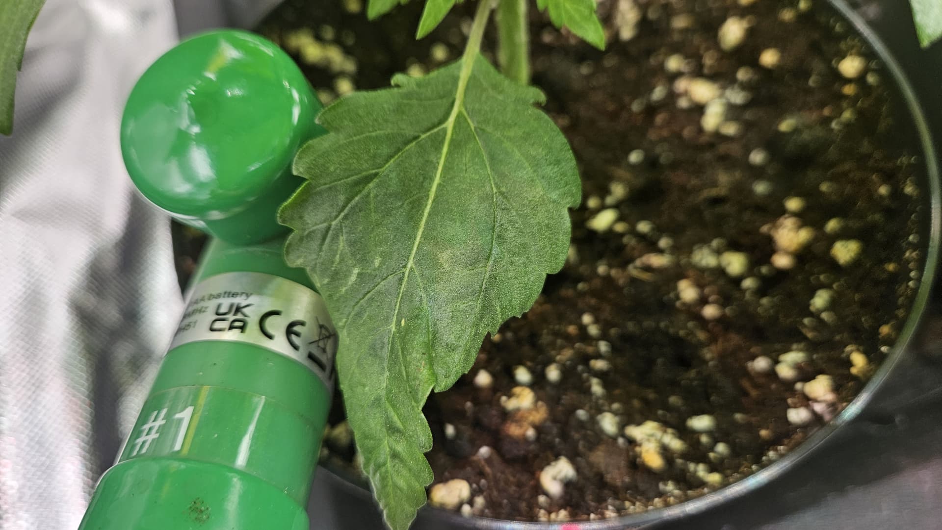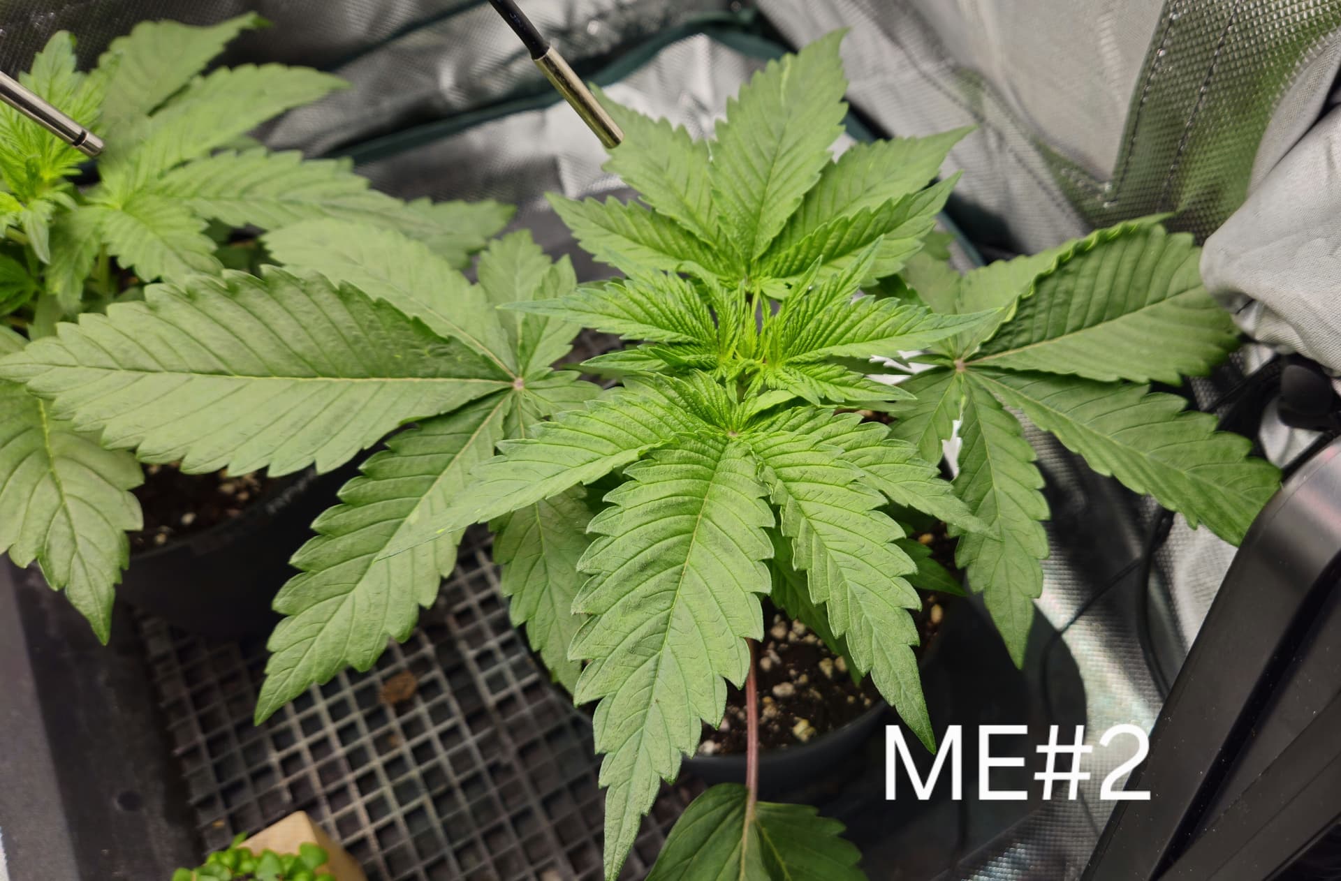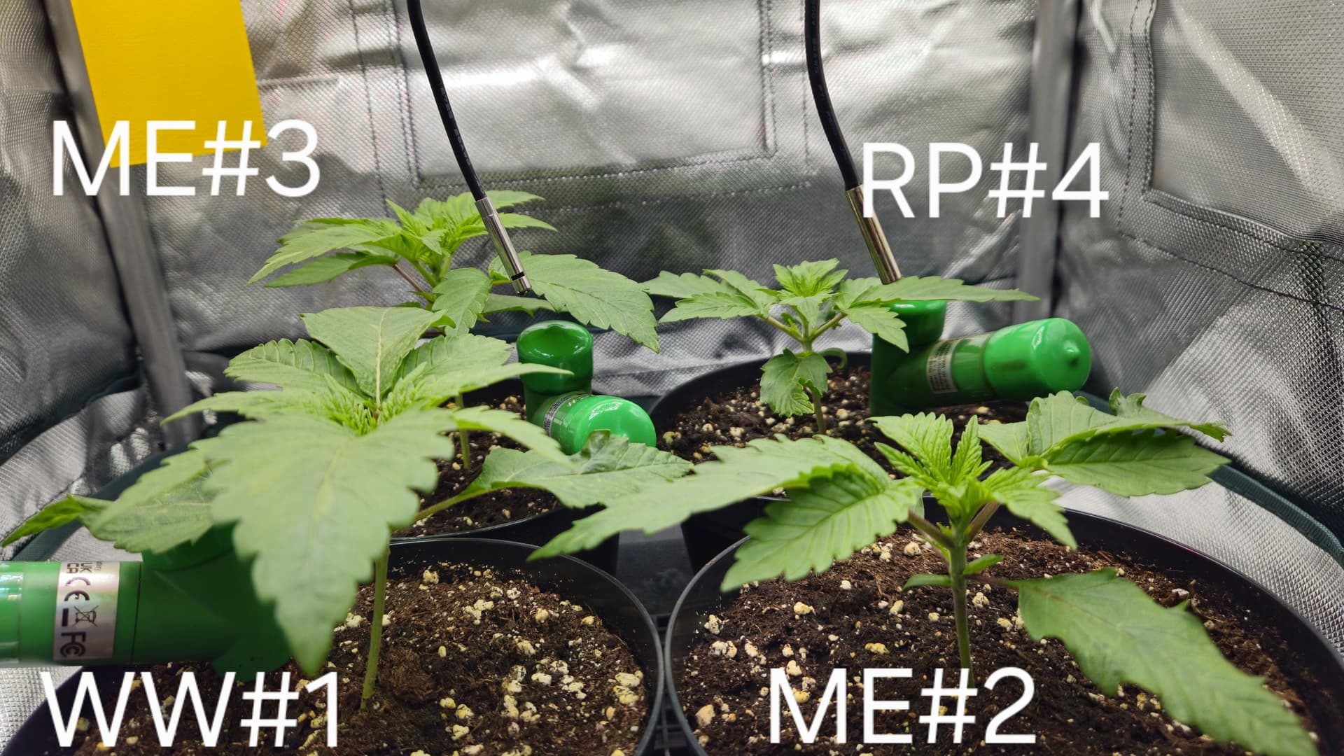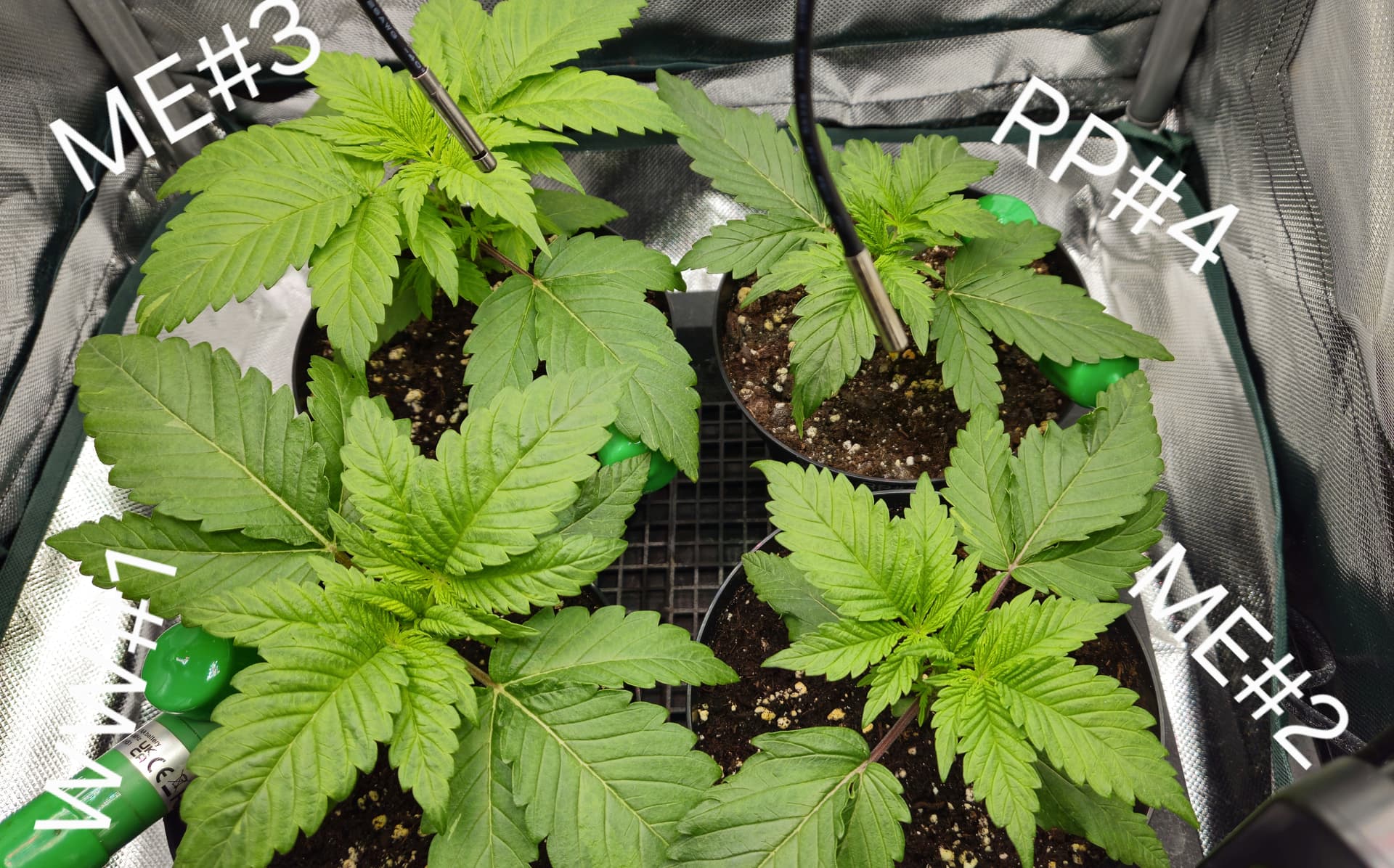 Der EC lag zu dem Zeitpunkt bei 0.9 – vermutlich zu wenig. Die kleineren Pflanzen (MimosaEvo#3 und RedPure#4) blieben symptomfrei, was auf eine Unterversorgung bei den größeren schließen lässt.