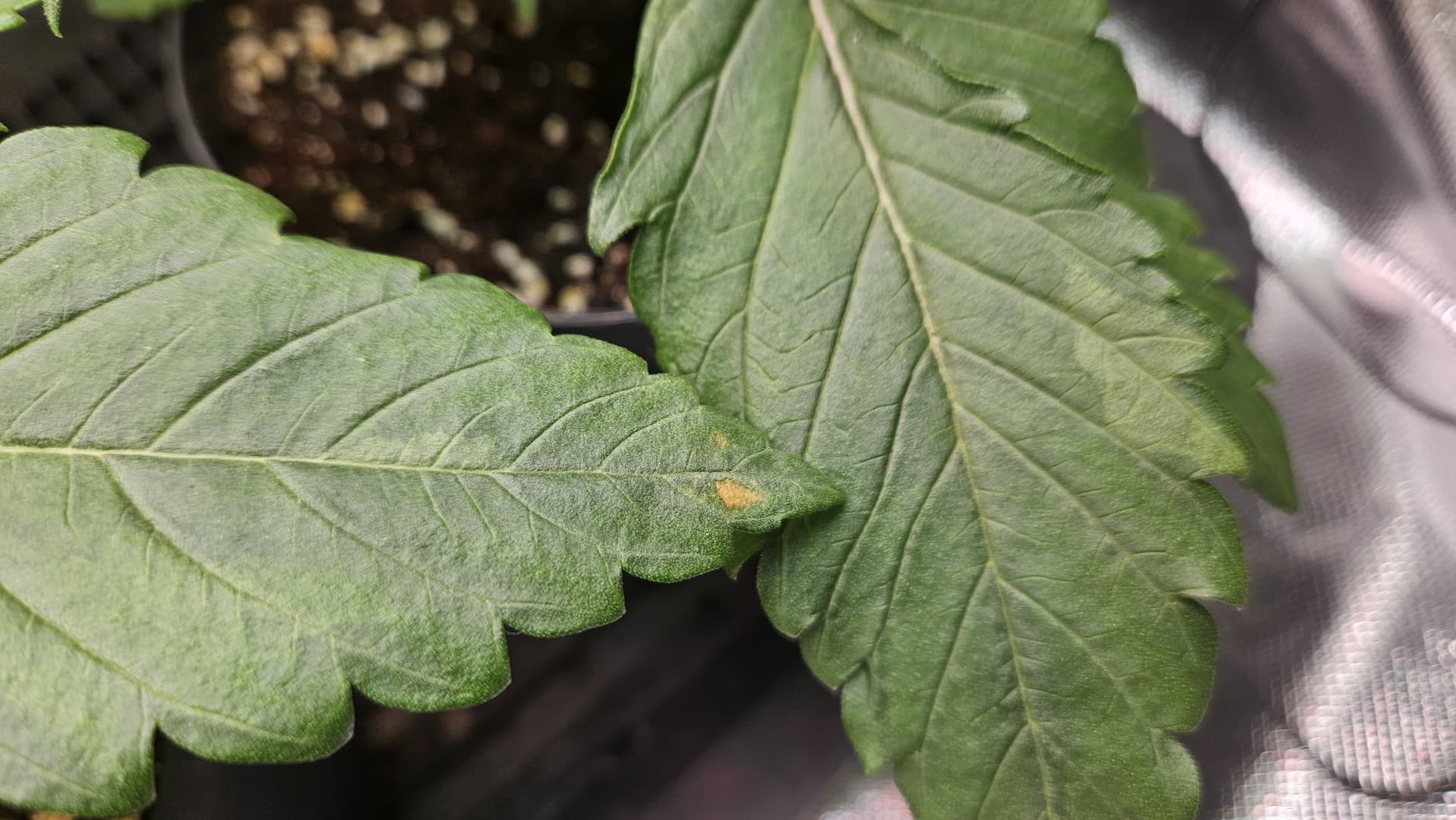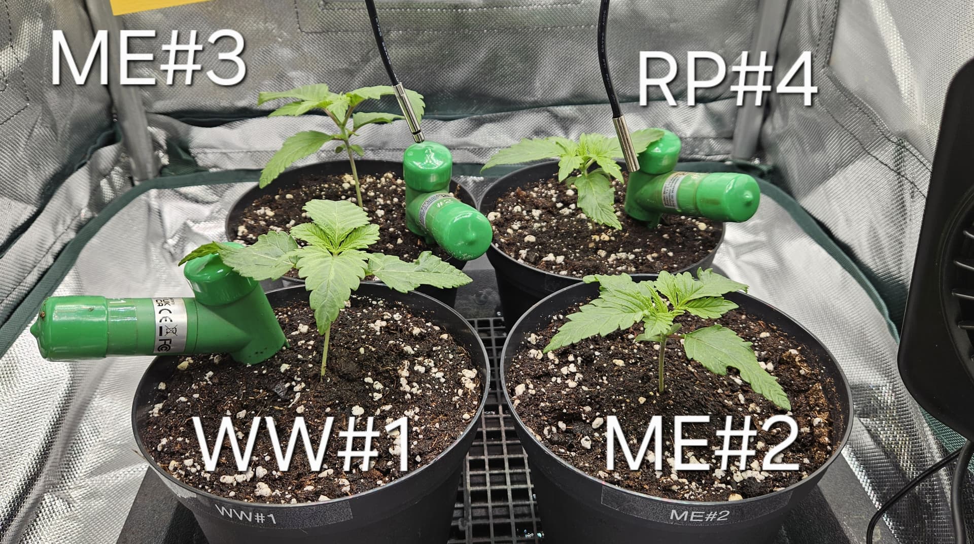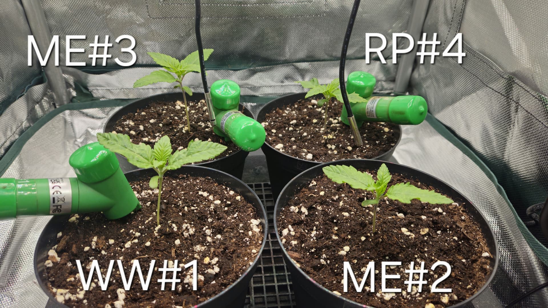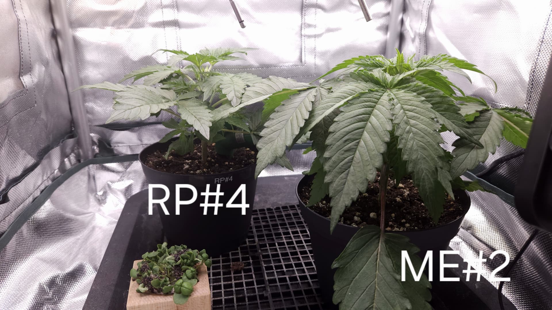 Der EC lag zu dem Zeitpunkt bei 0.9 – vermutlich zu wenig. Die kleineren Pflanzen (MimosaEvo#3 und RedPure#4) blieben symptomfrei, was auf eine Unterversorgung bei den größeren schließen lässt.