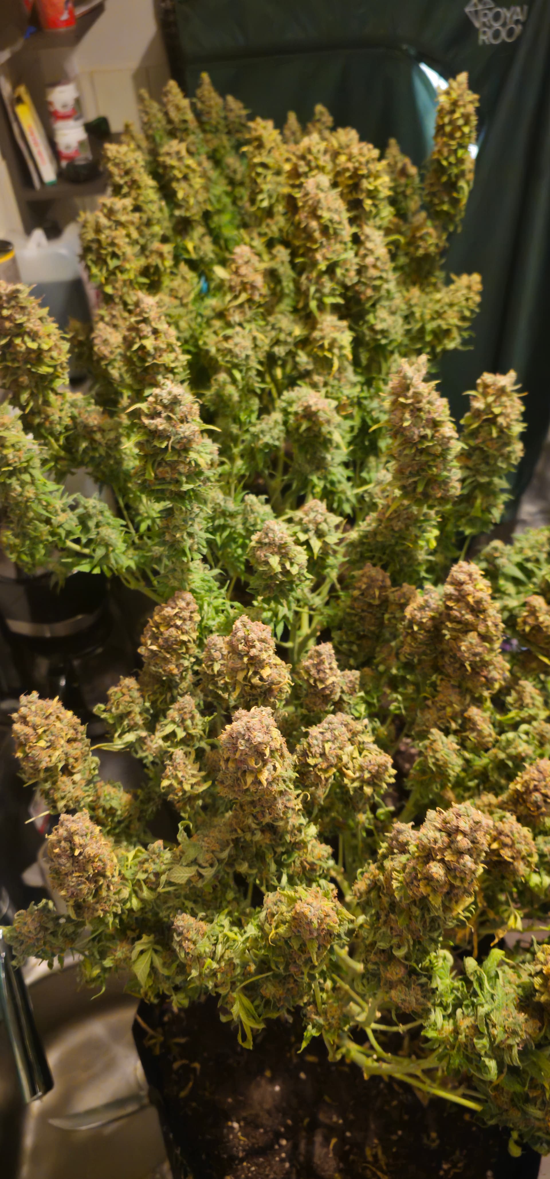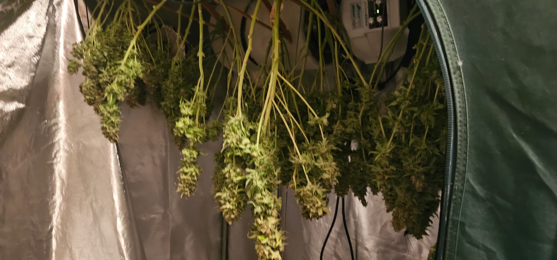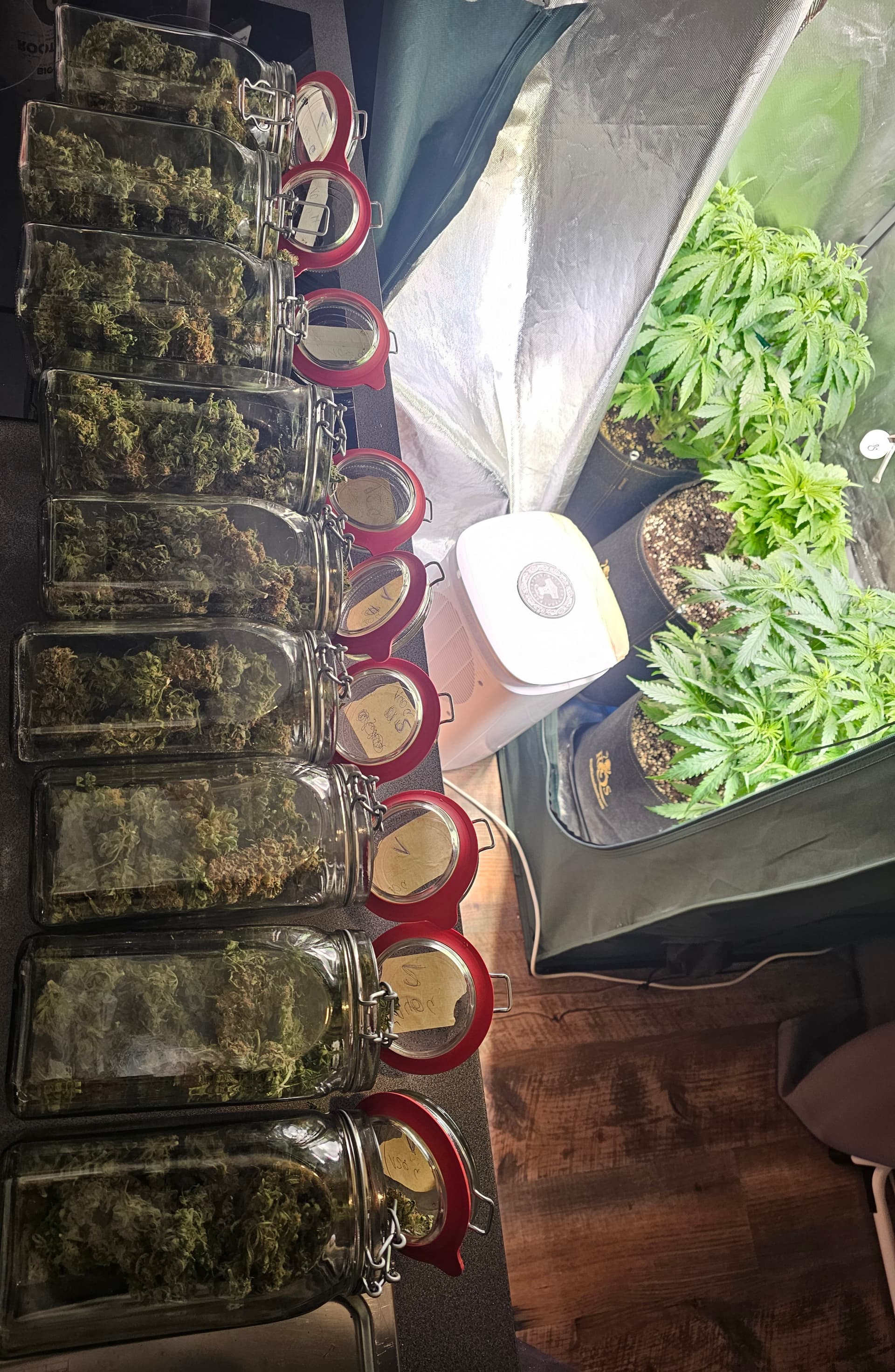 Es ist viel passiert: Ich habe jetzt 3 Pflanzen in die Gläser abgefüllt nochmal getrimmt und natürlich auch gewogen. Eine Pflanze ist jetzt im kleinen Zelt noch zur Trocknung die braucht ein tag länger der stängel knackte noch nicht richtig, lege Sie jetzt noch eine nacht getrimmt zum trocknen uns Netz und morgen dann auch ab ins Glas mit dem Fanta Phäno. In den gläsern sind 67% LF