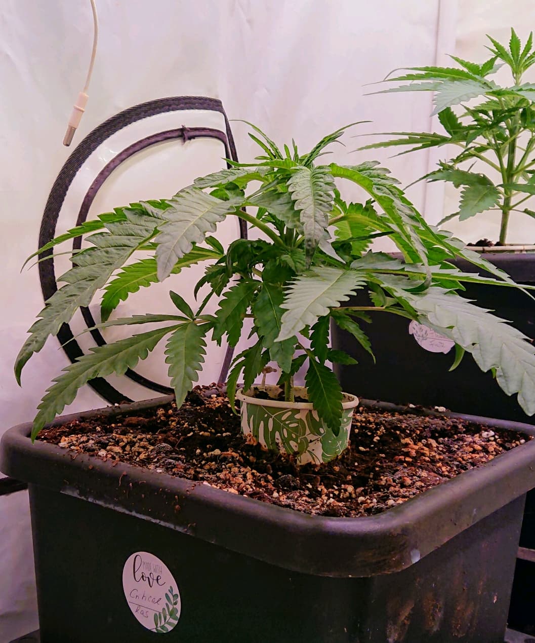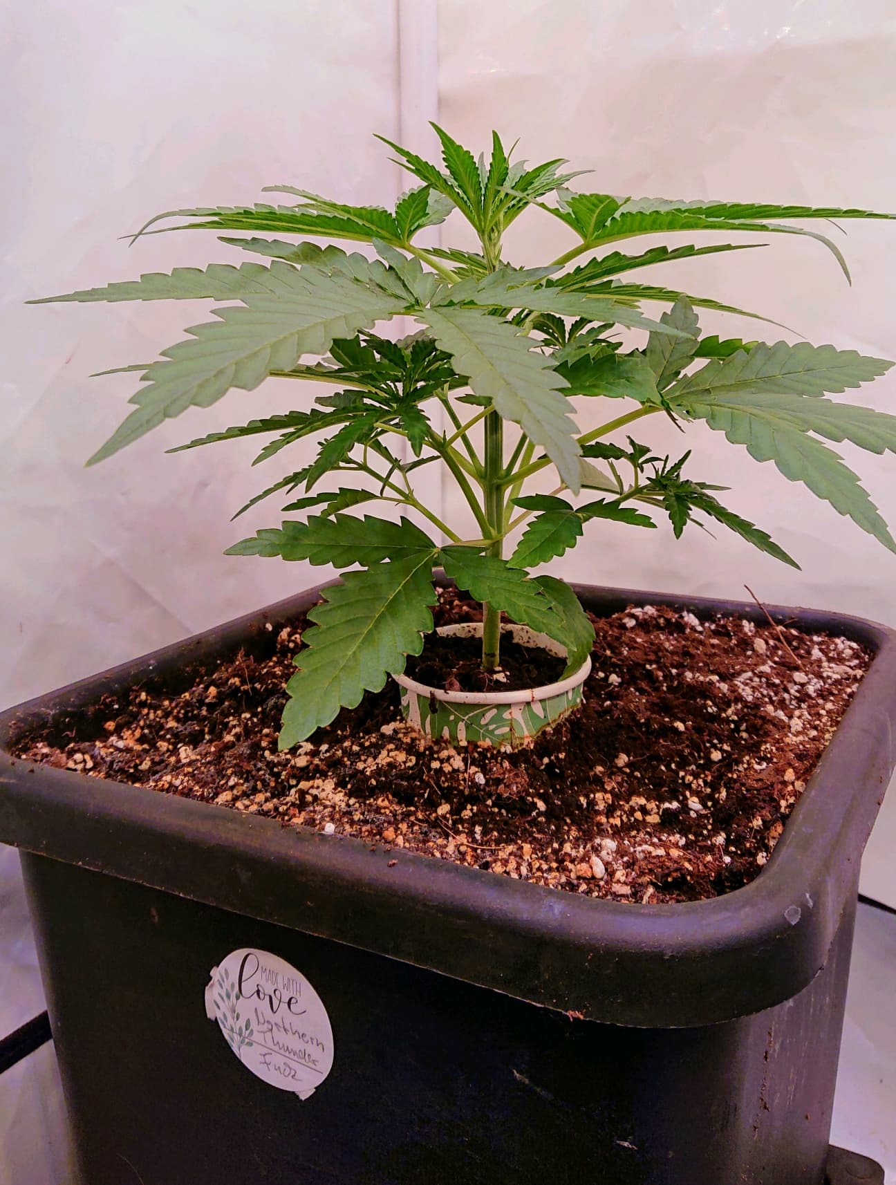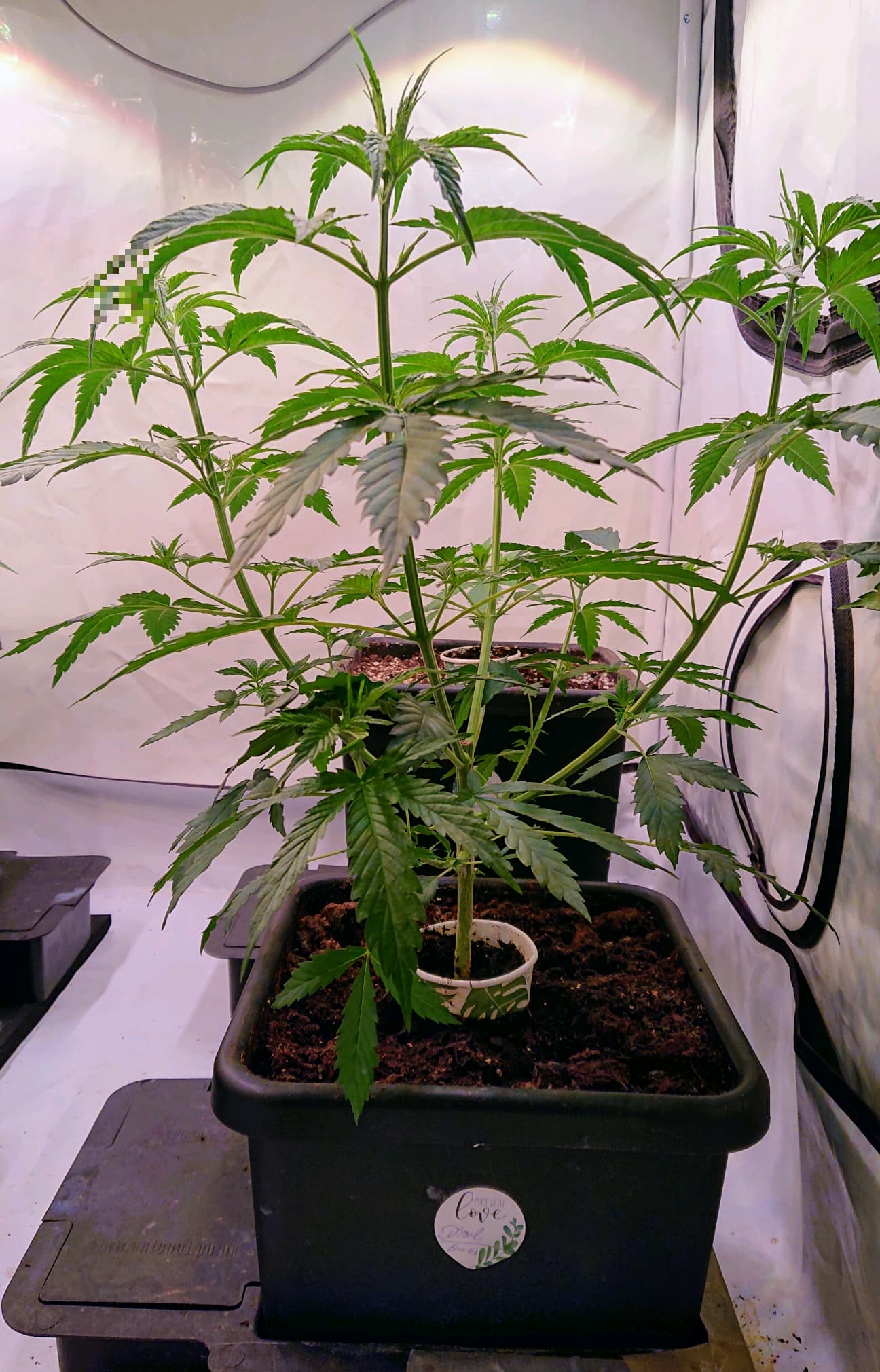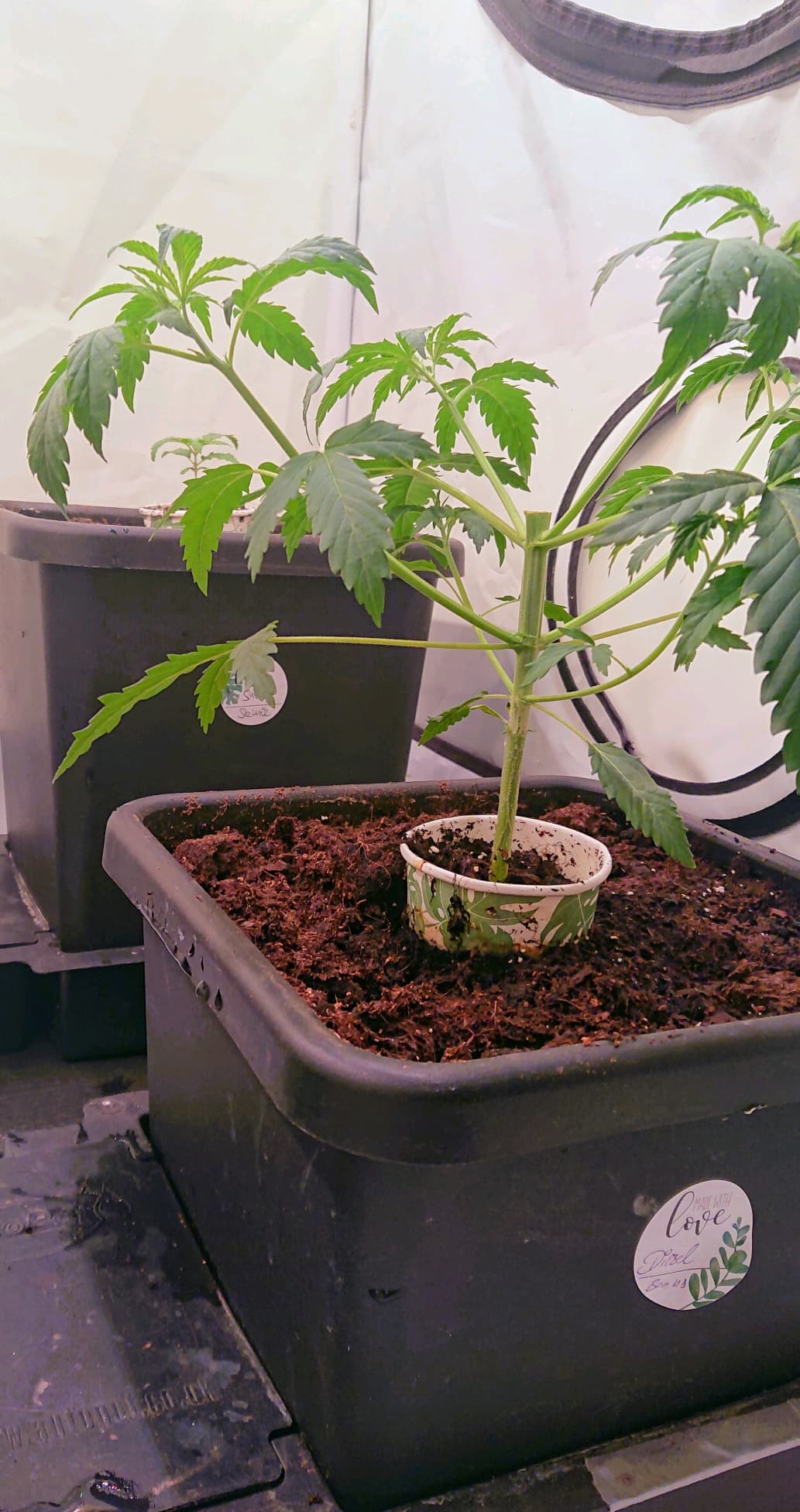 Hier die Mimosa Cake, ist noch gut in die höhe geschoĂen und beginnt nun fleisig an zu budden. Wie man sieht funktioniert die Topf- in Topf Methode ganz gut und erspart der Autoflower dass umtopfen.