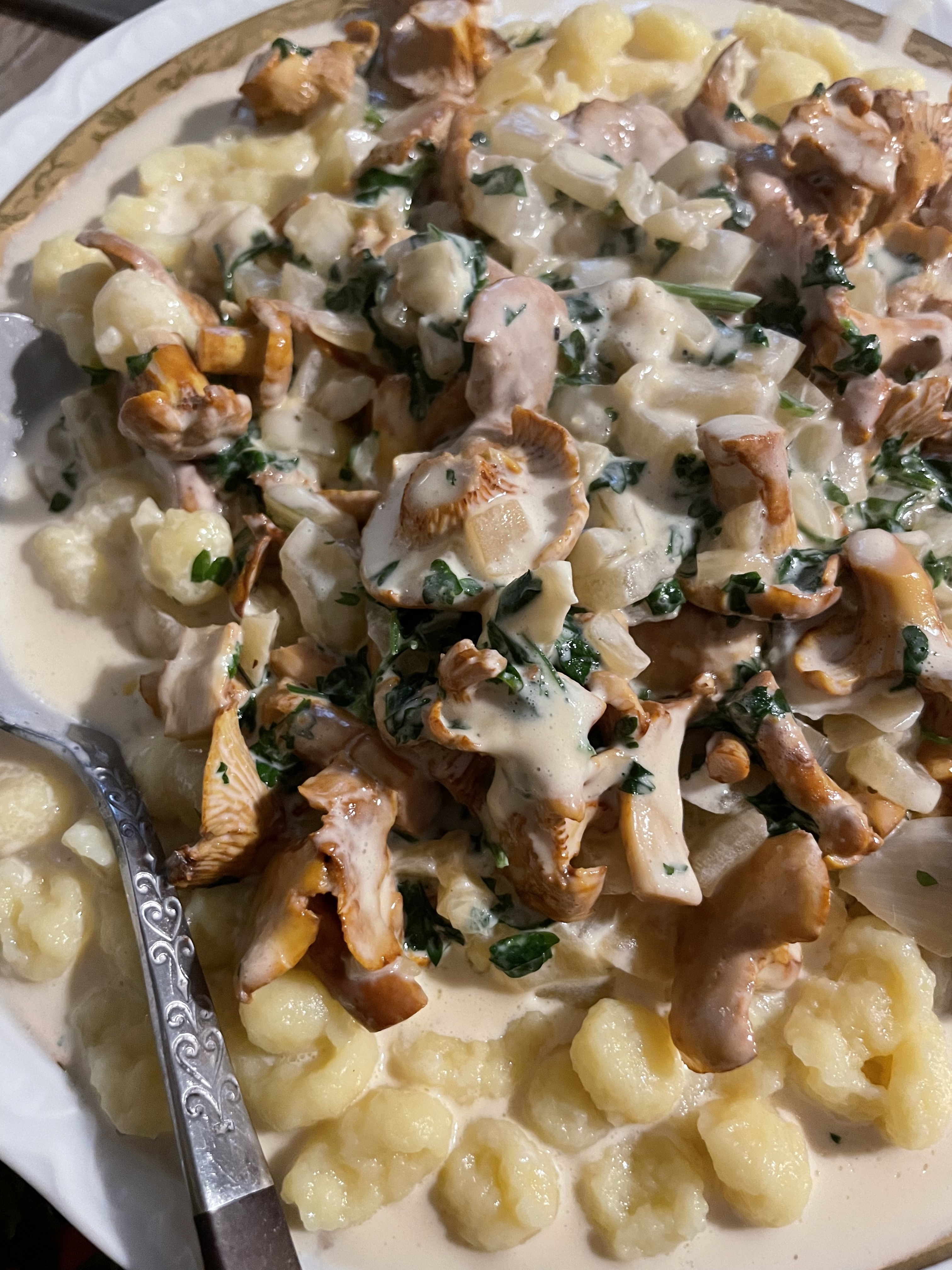 Einige Minuten braten, dann mit 1-2 Esslöffel Mehl bestäuben, unterrühren und mit etwas Brühe auffüllen (ca. 150 ml)
