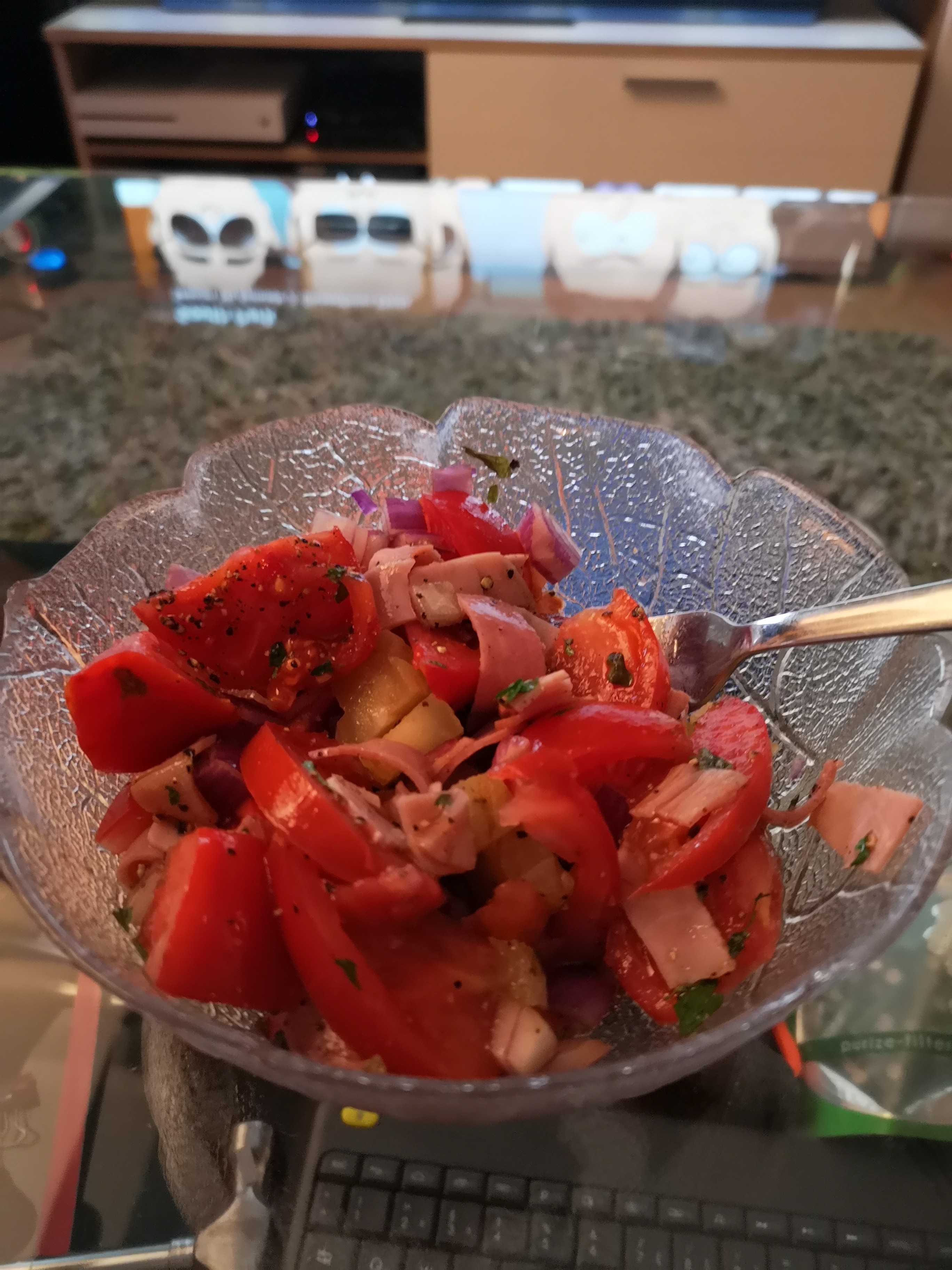 Zum Schluss was „gesundes“ ^^ Tomatensalat mit Harzer Rolle und Schinken