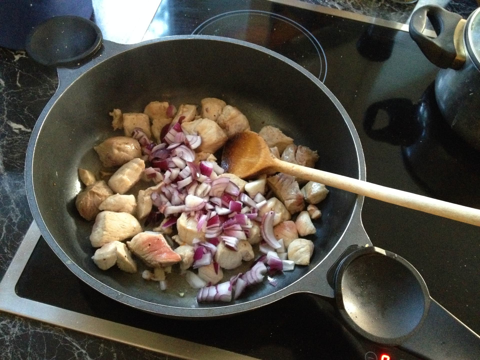 Fleisch scharf anbraten, Zwiebeln etwas später dazu.