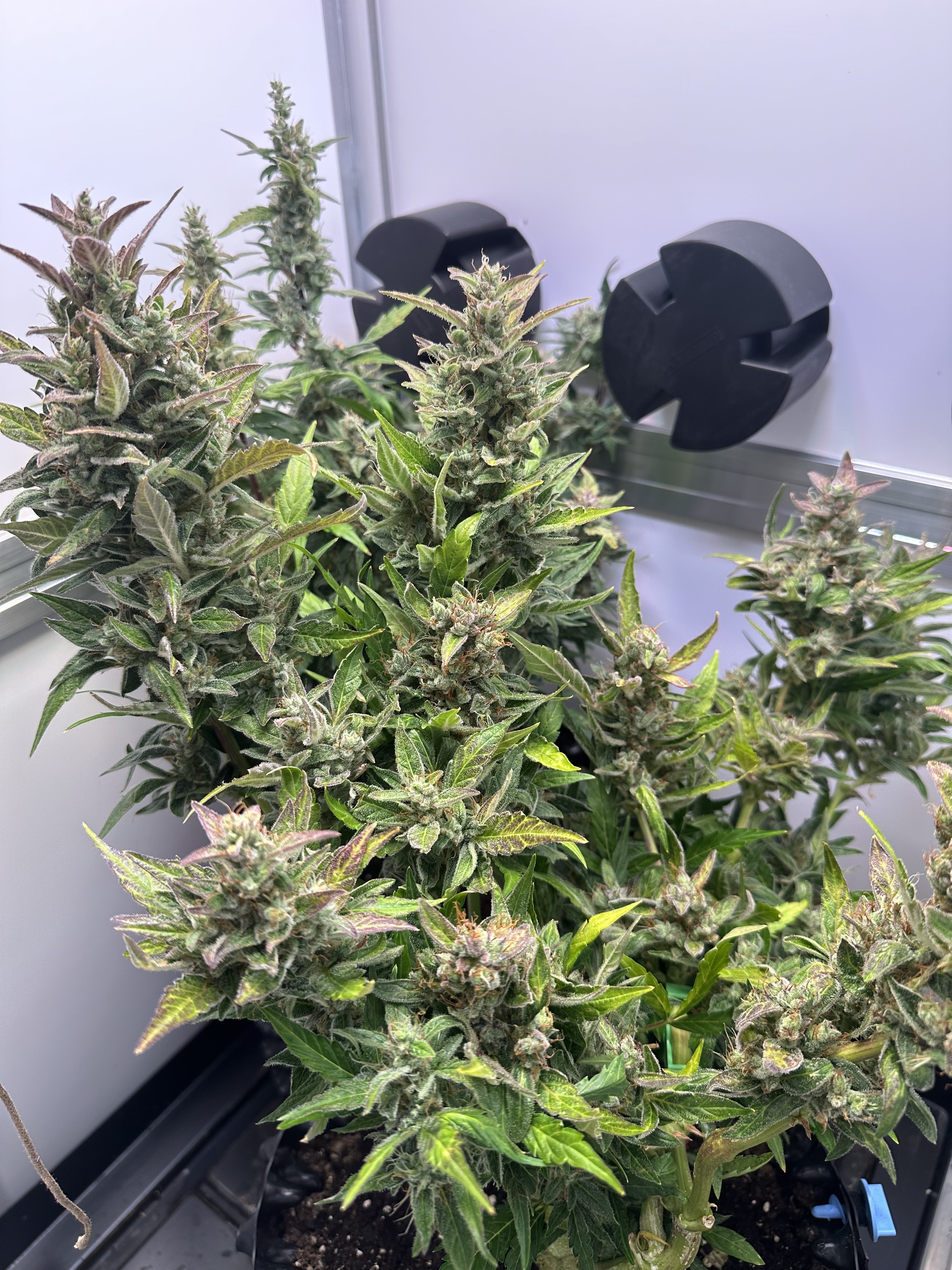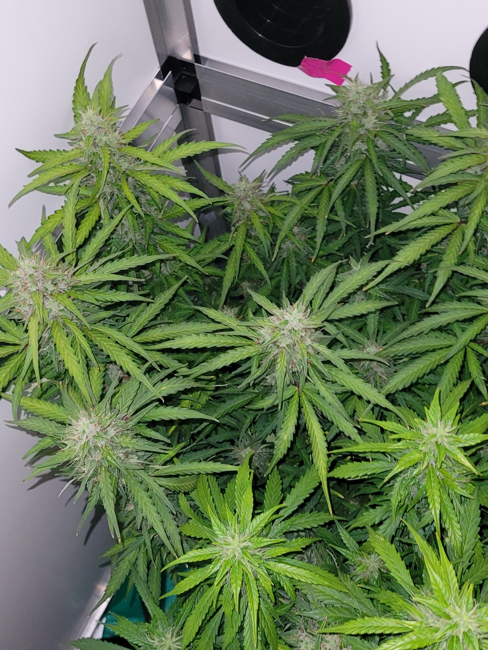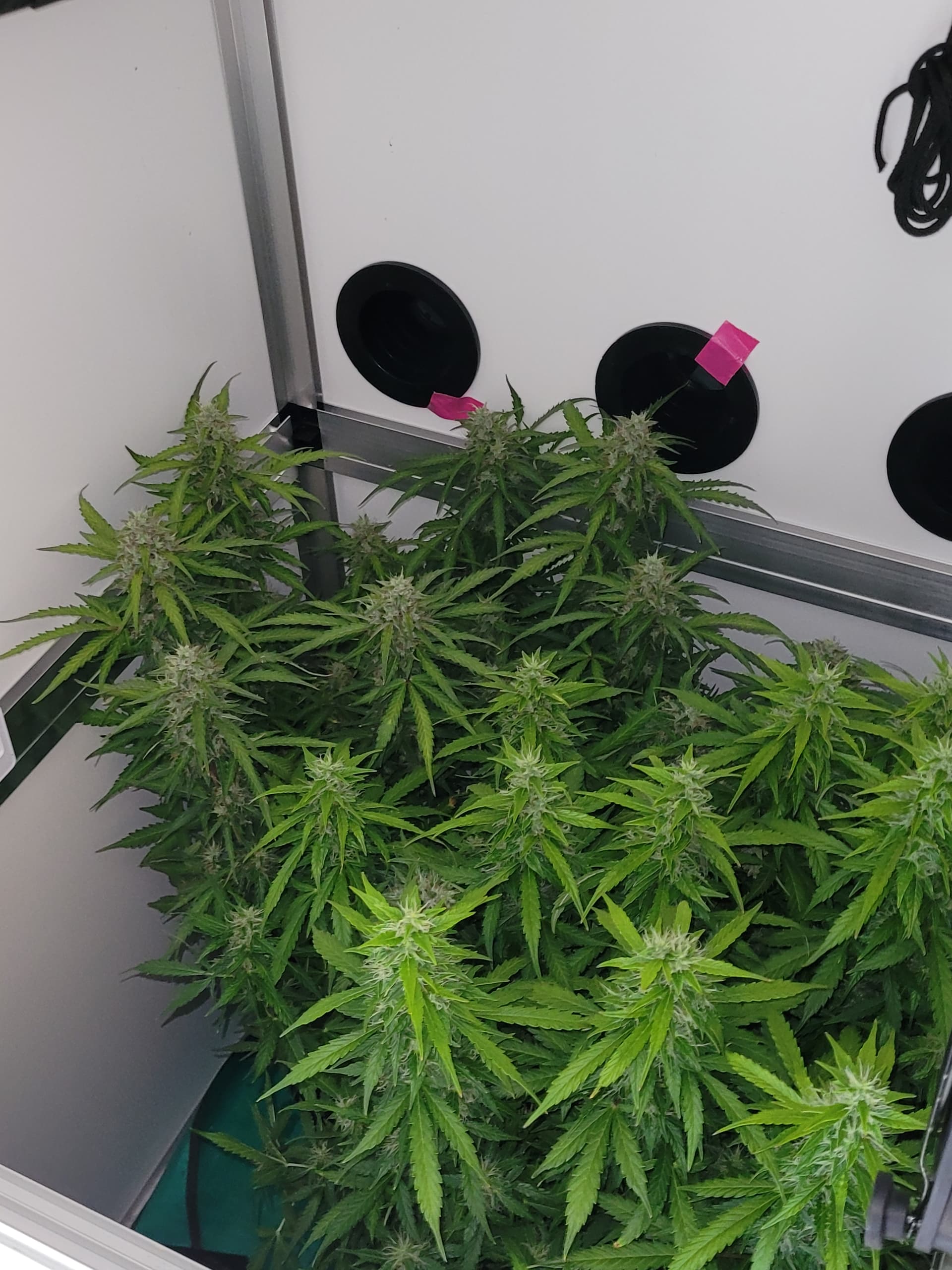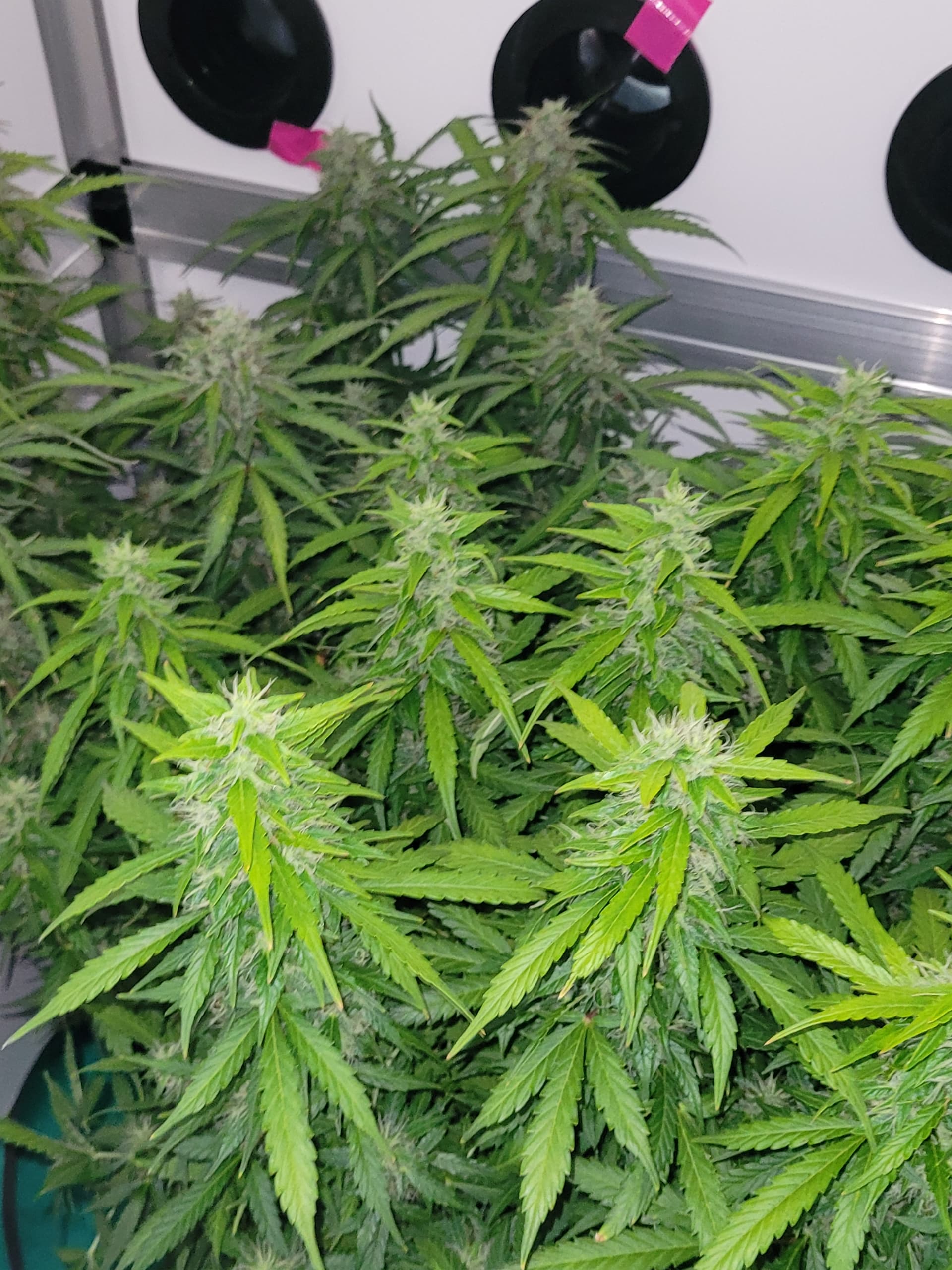 Die Mädels sind nun fast 50cm hoch, ich hatte in der vegphase teilweise 20-25cm Abstand zur Lampe, Wachstum wurde schon gehemmt. Blüten entwickeln sich prächtig.