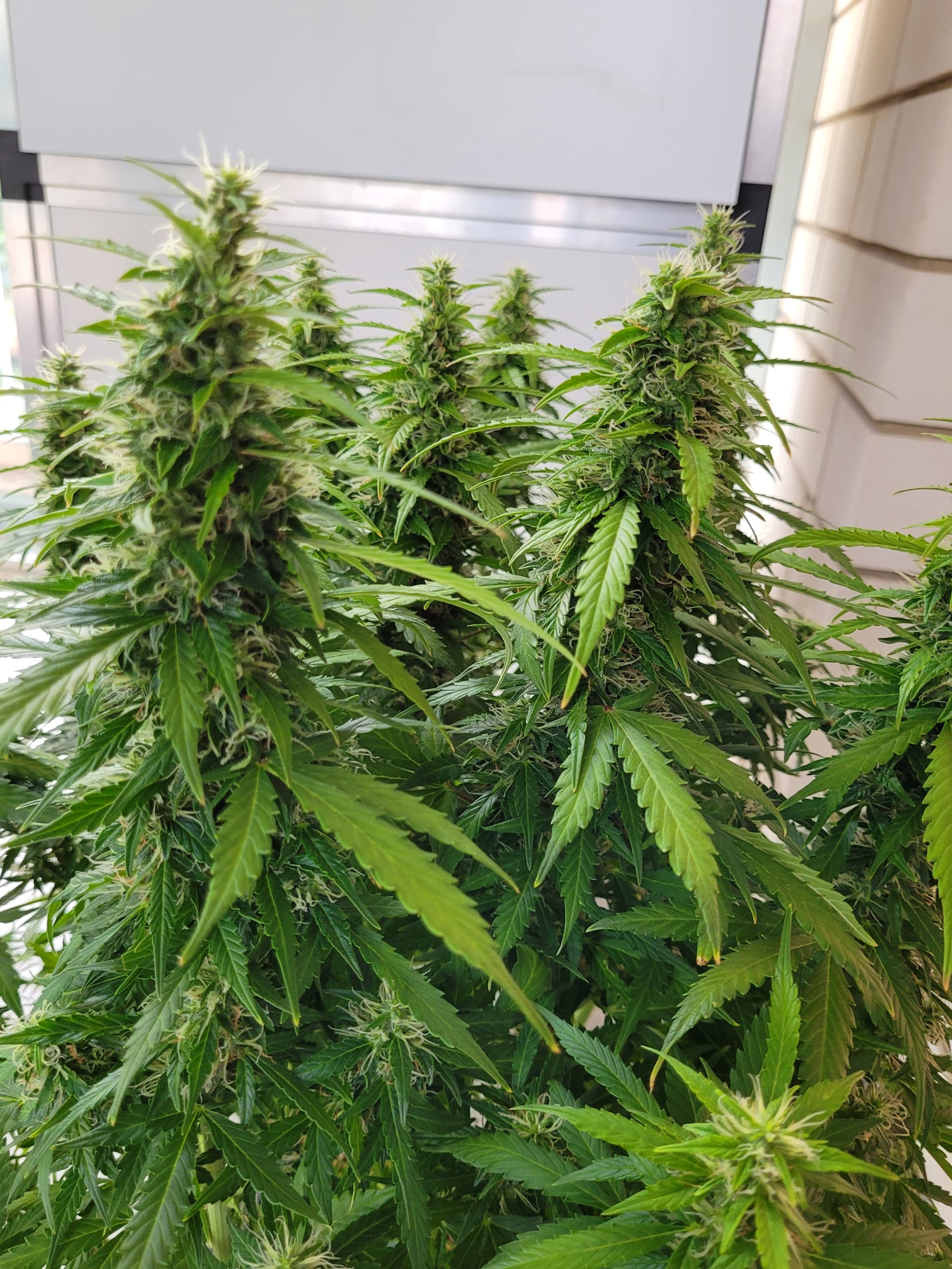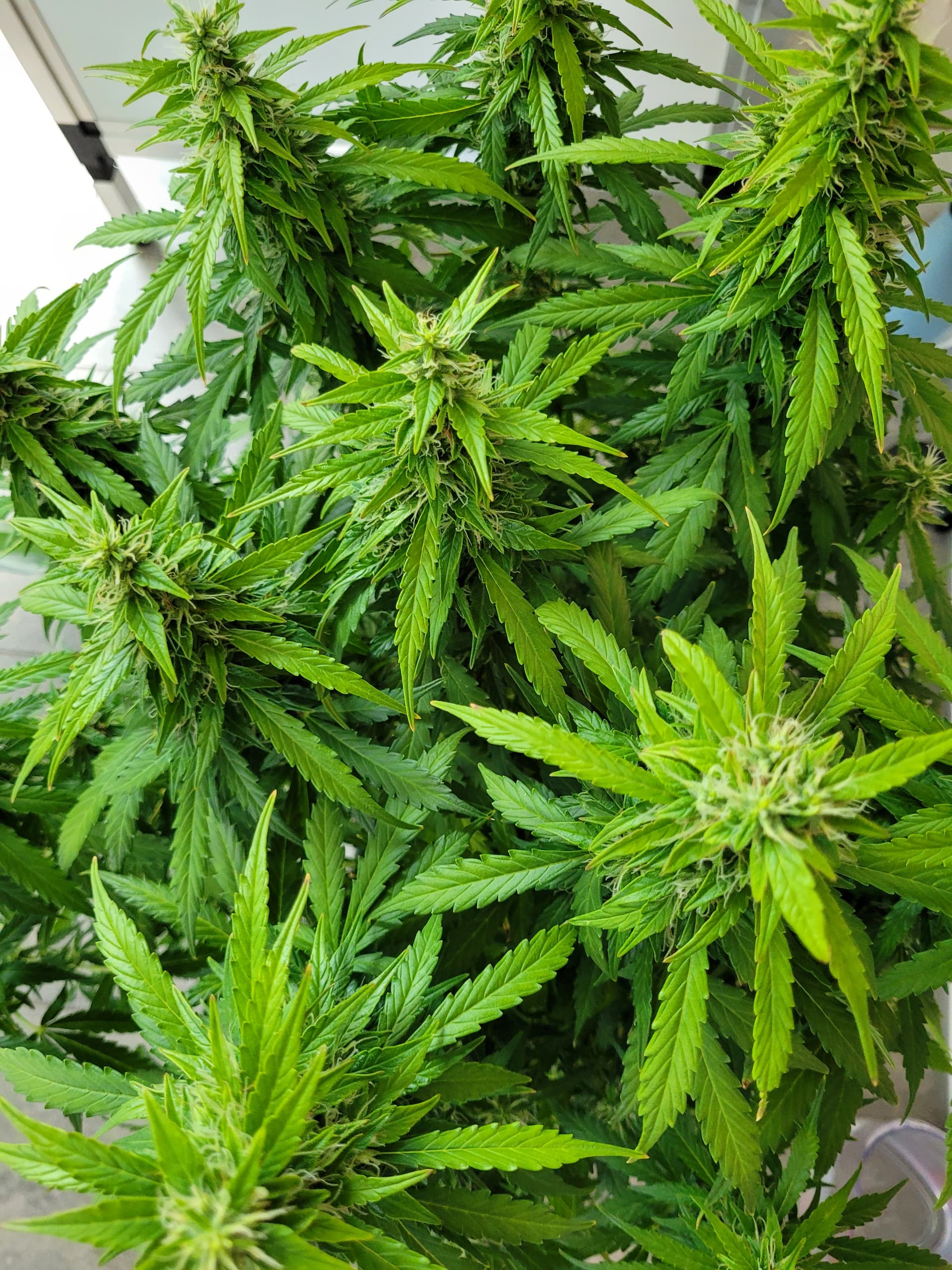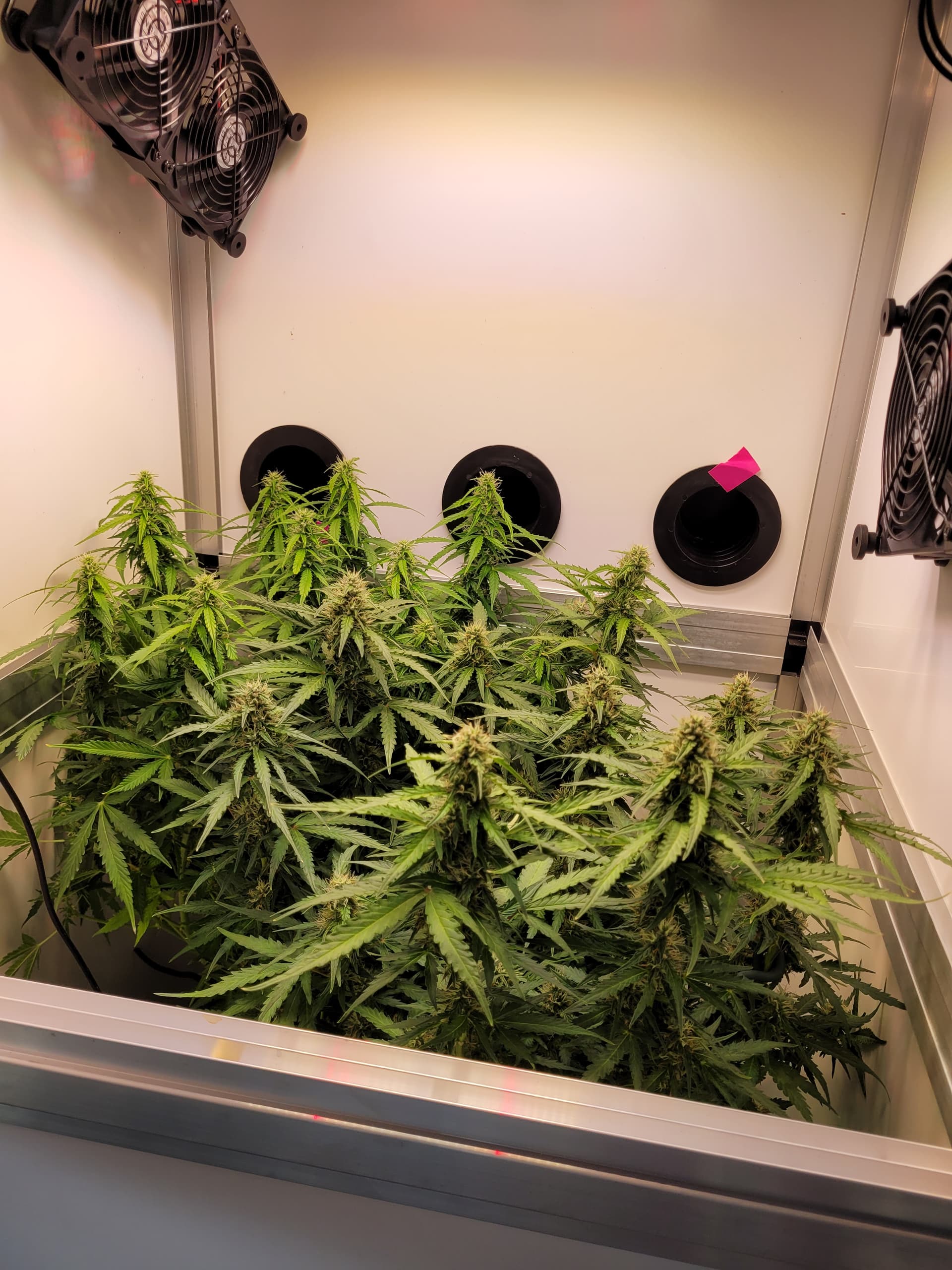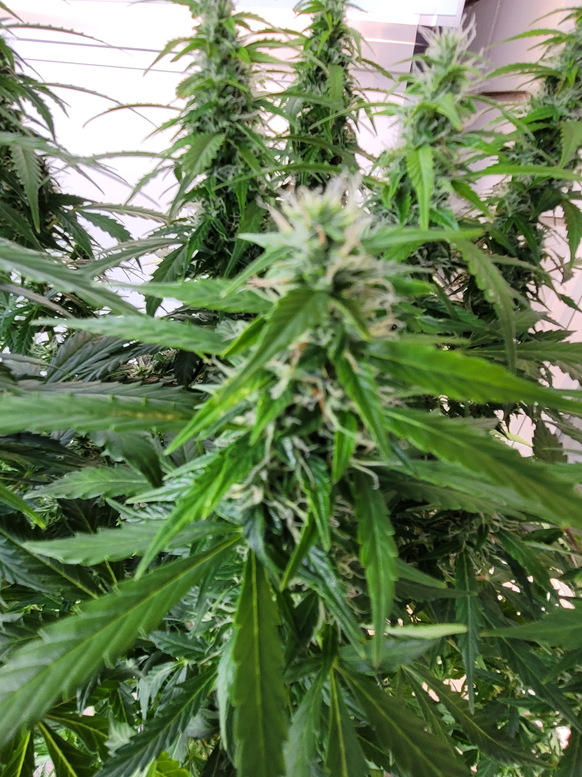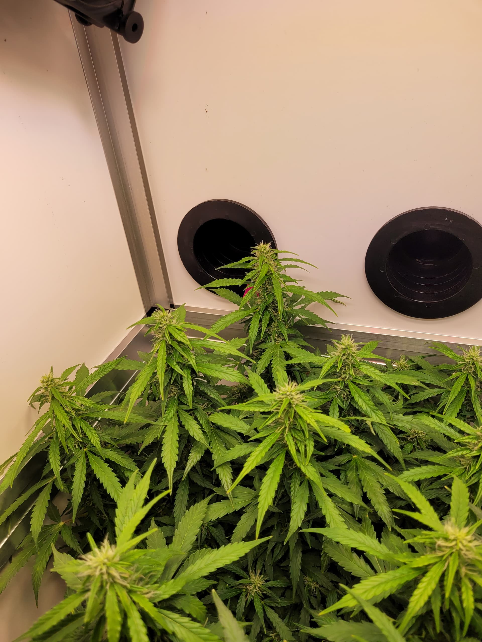 Die Mädels sind nun fast 50cm hoch, ich hatte in der vegphase teilweise 20-25cm Abstand zur Lampe, Wachstum wurde schon gehemmt. Blüten entwickeln sich prächtig.