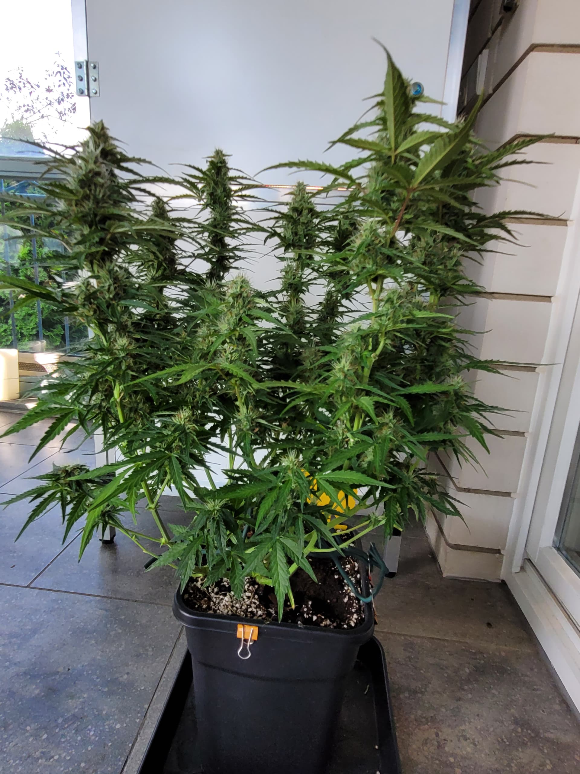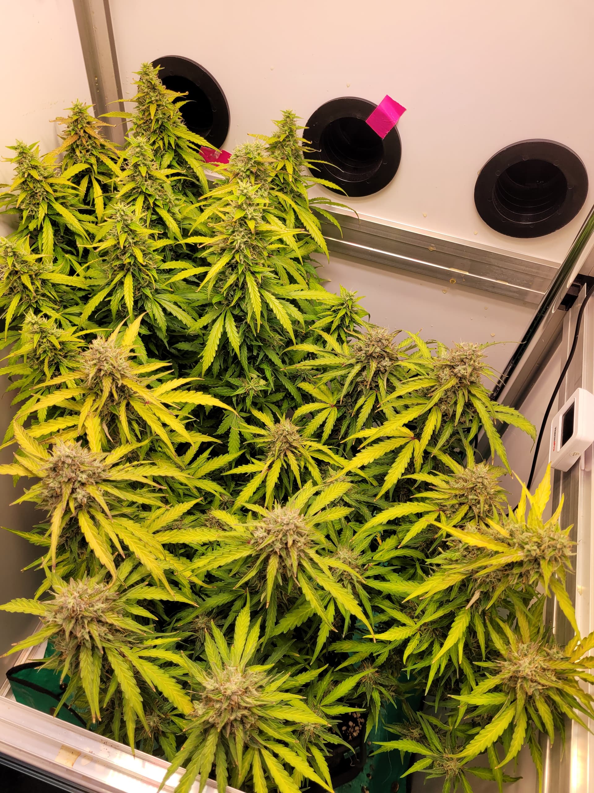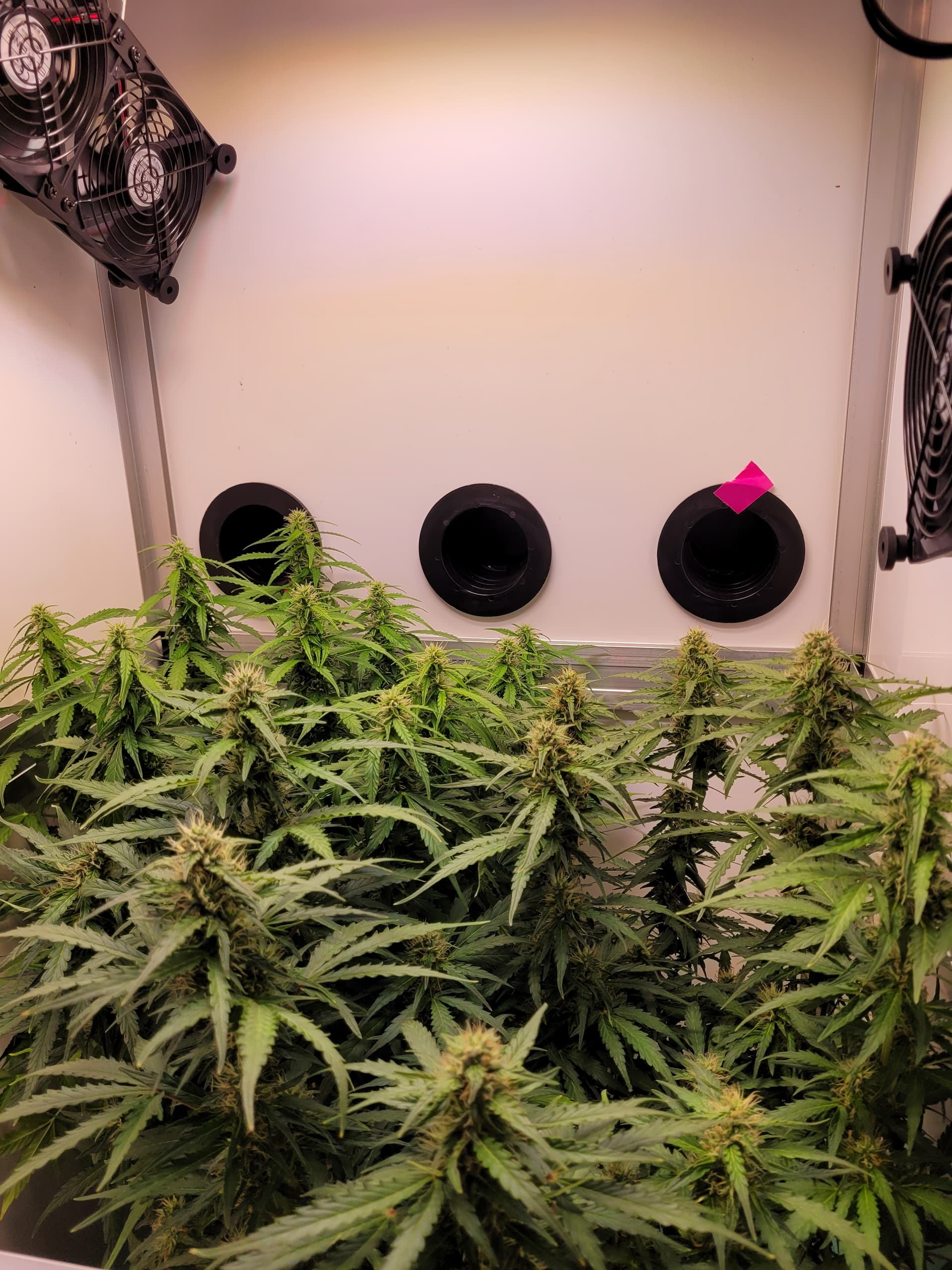 Hab jetzt den einzeln Umluft-Ventilator anstatt aufm Boden unten an der Stange, er pustet leicht schräg nach oben. Einen der beiden Doppelventis ist jetzt auf da dran und pustet aufs Blätterdach.