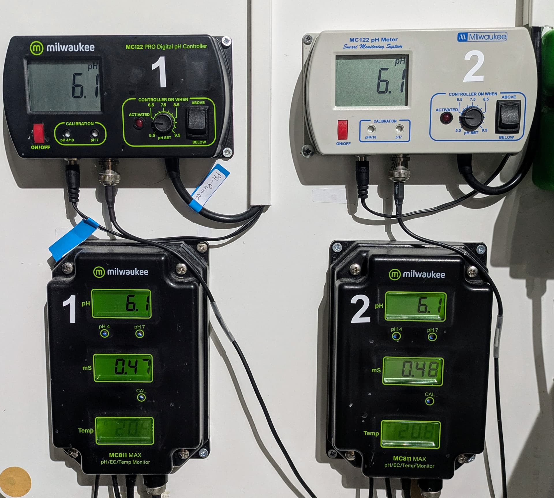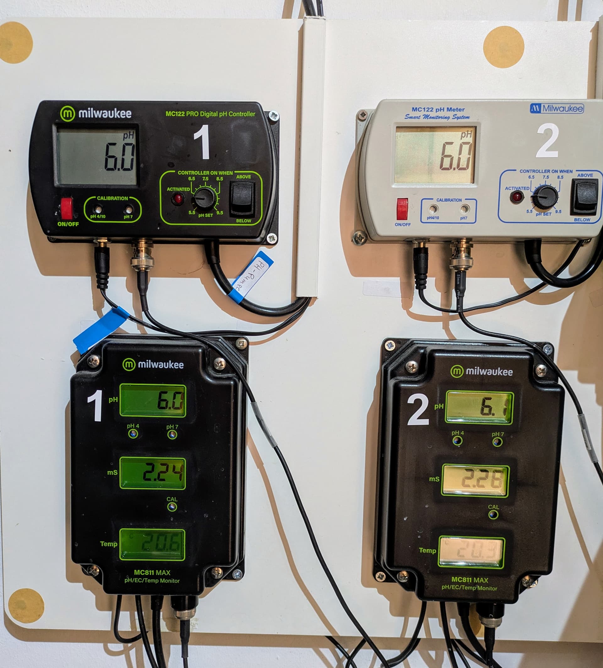 So sehen die Werte in den beiden Tanks aus. EC auf 2,3 und der PH um 6,0. Mit einem PH von 6 sollte die Nährstoffaufnahme gewährleistet und die Photosynthese ausreichend angeregt sein.
