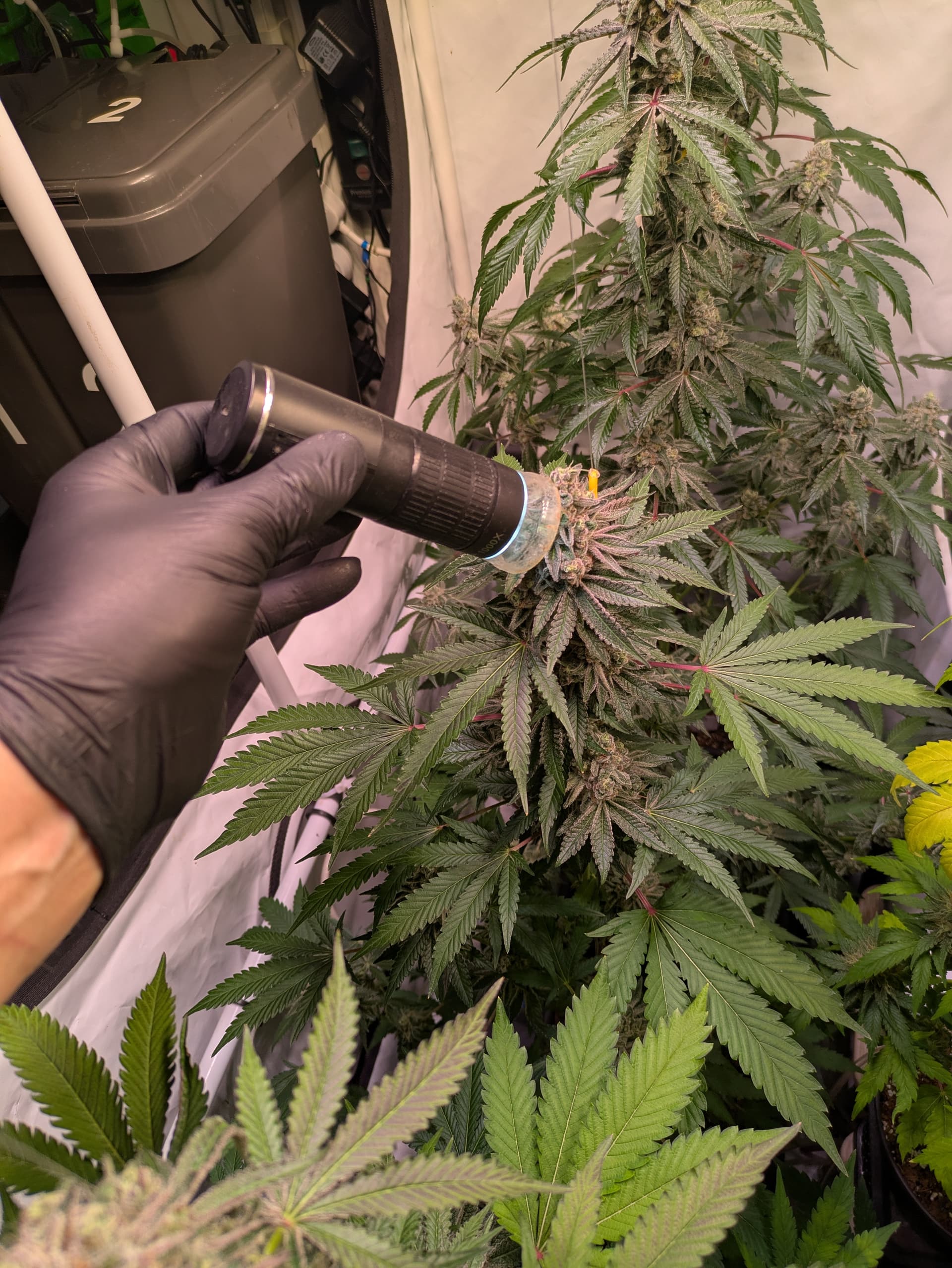 Heute habe ich die Trichome aller Pflanzen gesichtet. Die Mandarin Jam ist am weitesten, fast schon überfällig.