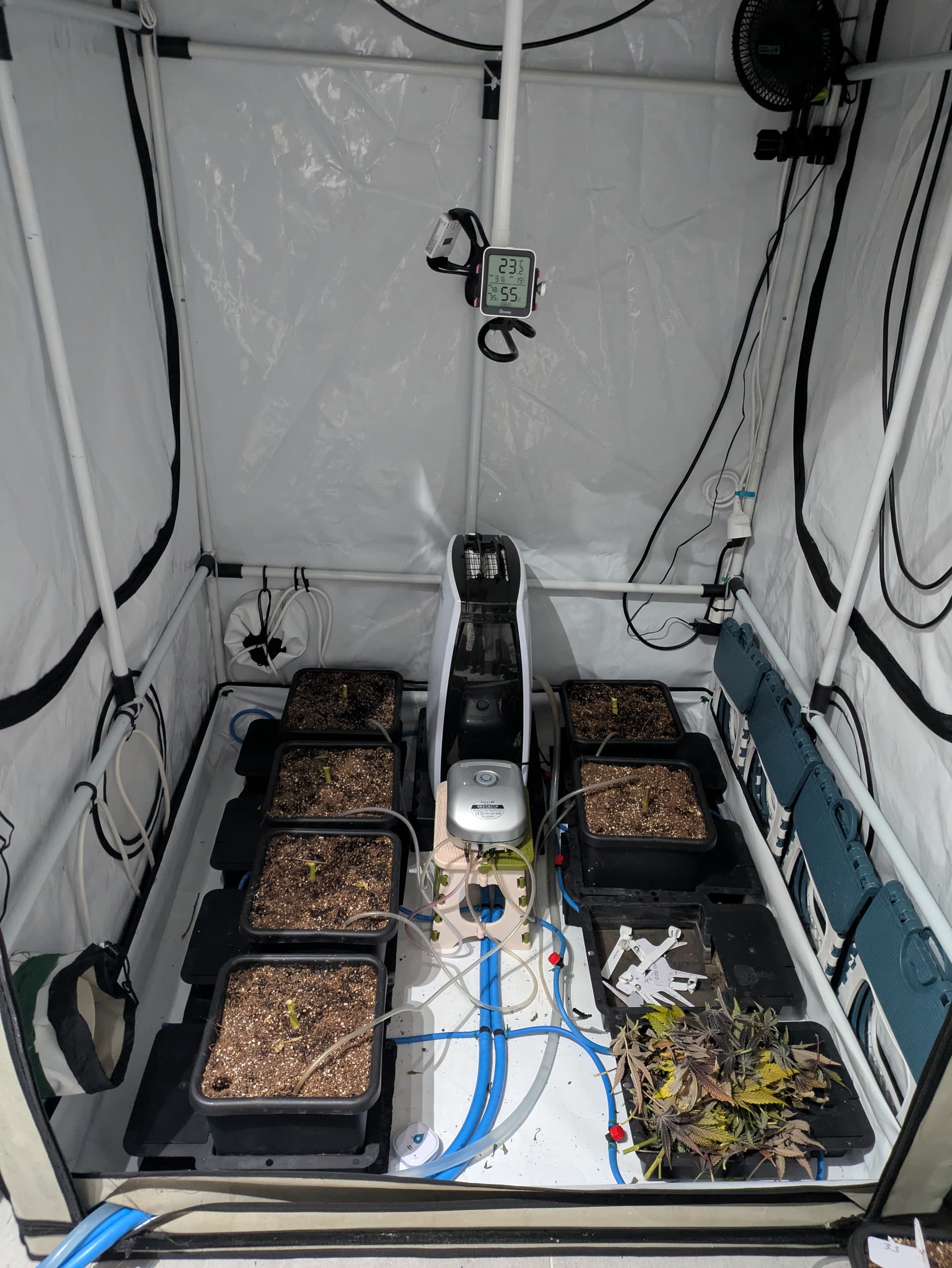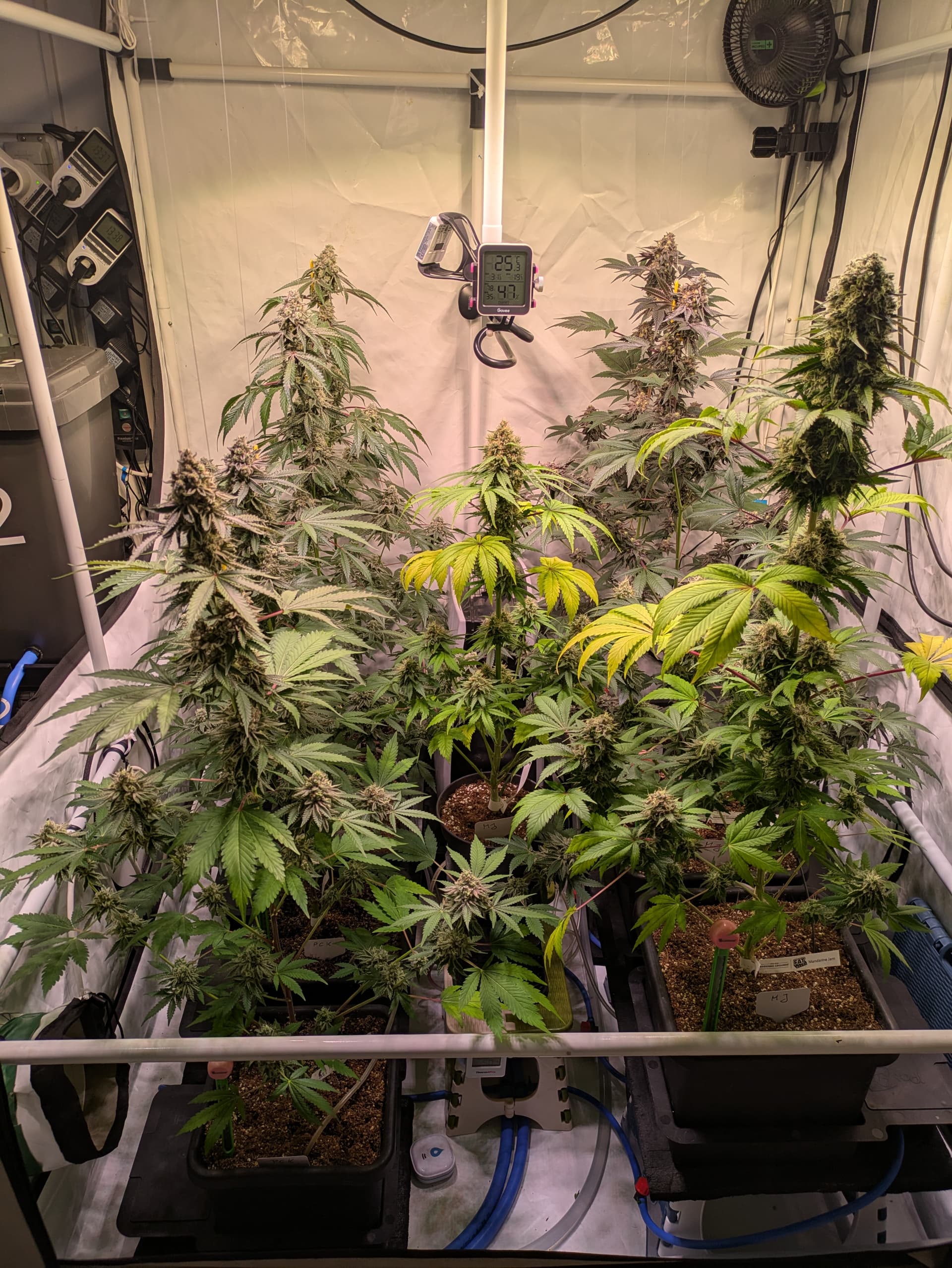 Mit der Funktion des DIY AutoFlood System bin ich zufrieden. Die Magnetventile haben zuverlässig geschaltet und die Pflanzen waren ausreichend versorgt. Am positivsten war, das die Luftfeuchtigkeit konstant war und der Entfeuchter nur in den letzten zwei Wochen zugeschaltet war. Somit war zusätzlich auch die Temperatur immer in einem abnehmbaren Bereich ( mein Entfeuchter produziert gut Abwärme welche direkt ins Zelt geblasen wird, so stieg die Temperatur bisher immer an. Auch gab es keine Überschwemmungen mehr auch war das Substrat bei allen Pflanzen gleichmäßig durchfeuchtet. Mit einem Tank bin ich auch länger ausgekommen, da ich nicht abdrehen musste vor dem Wasserwechsel. Insgesamt ne Runde Sache das Ding.