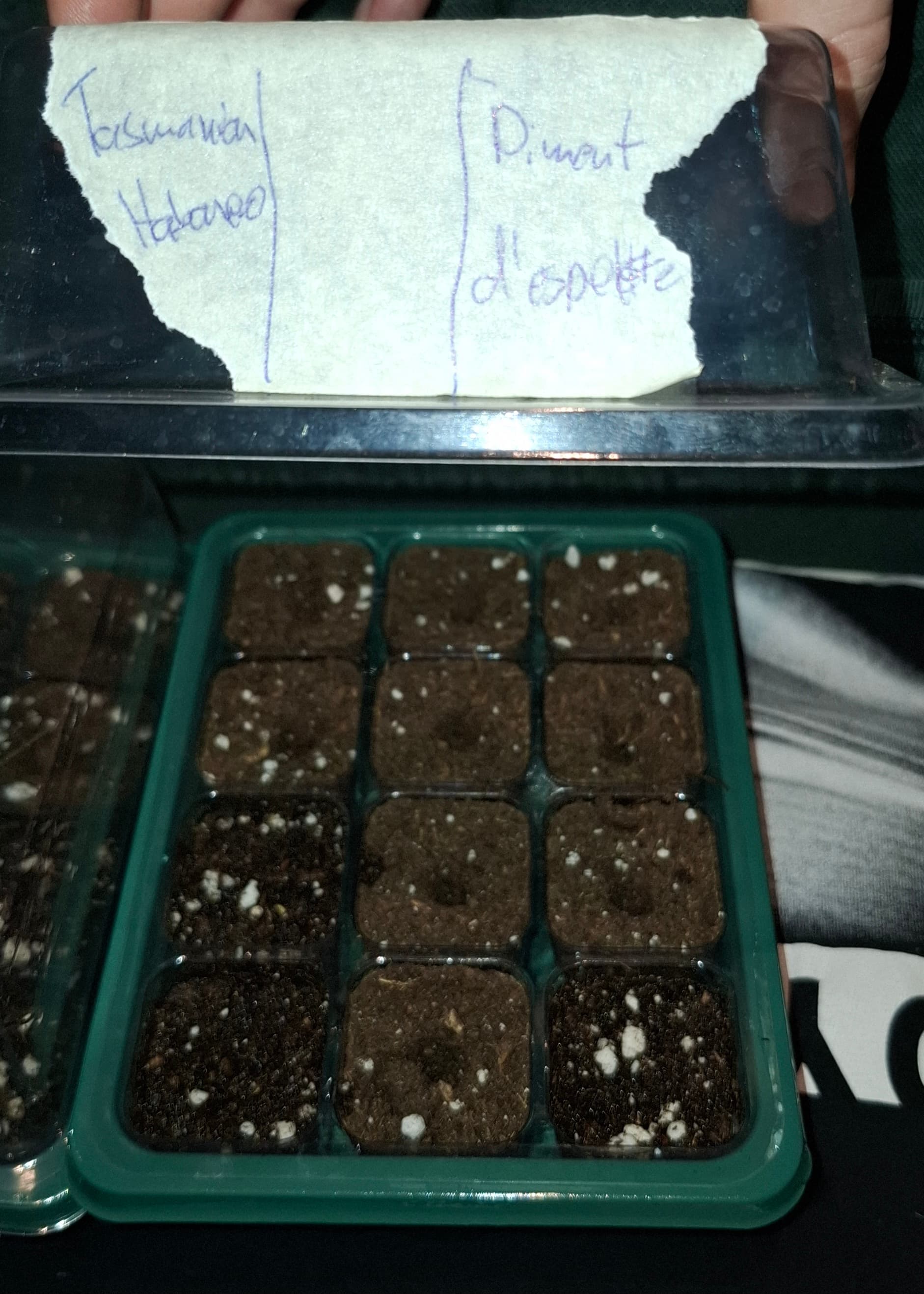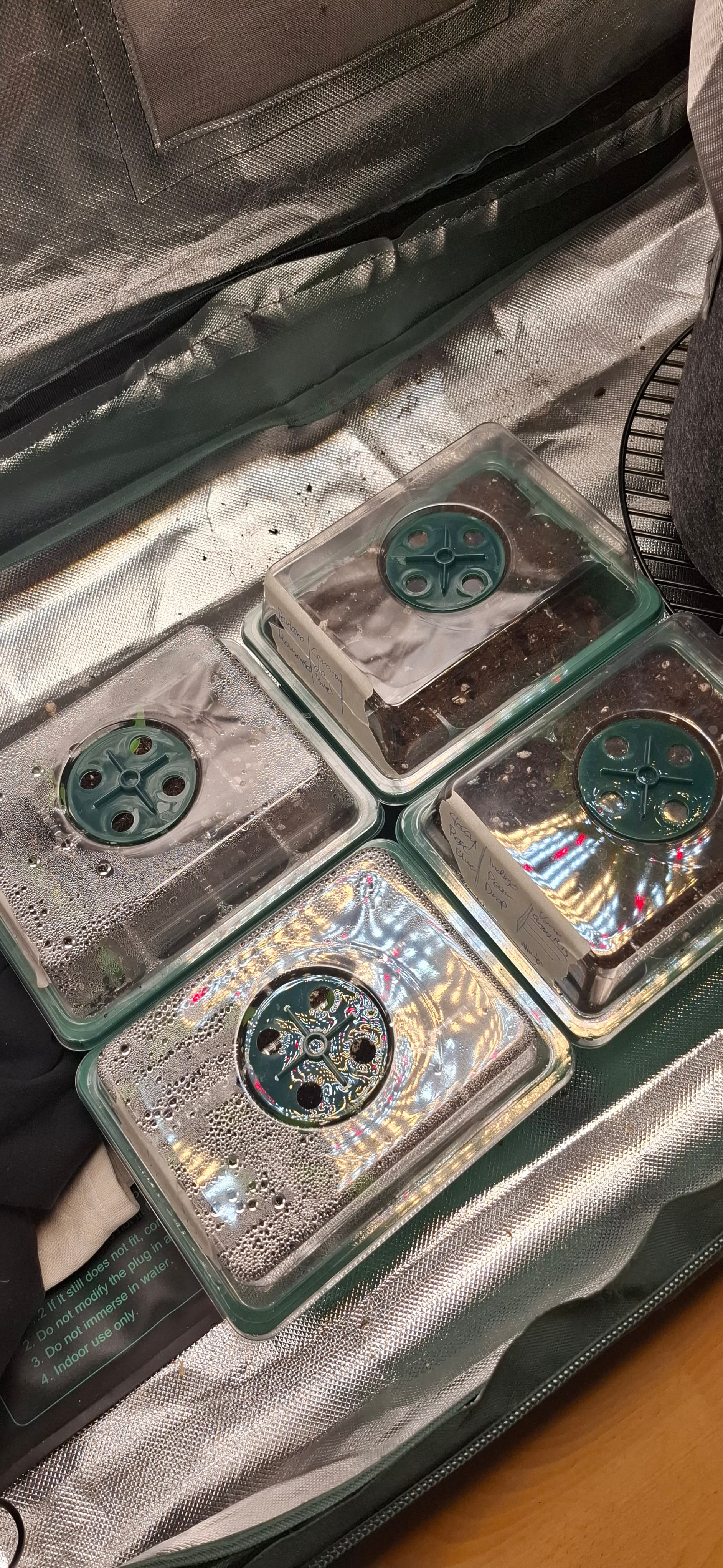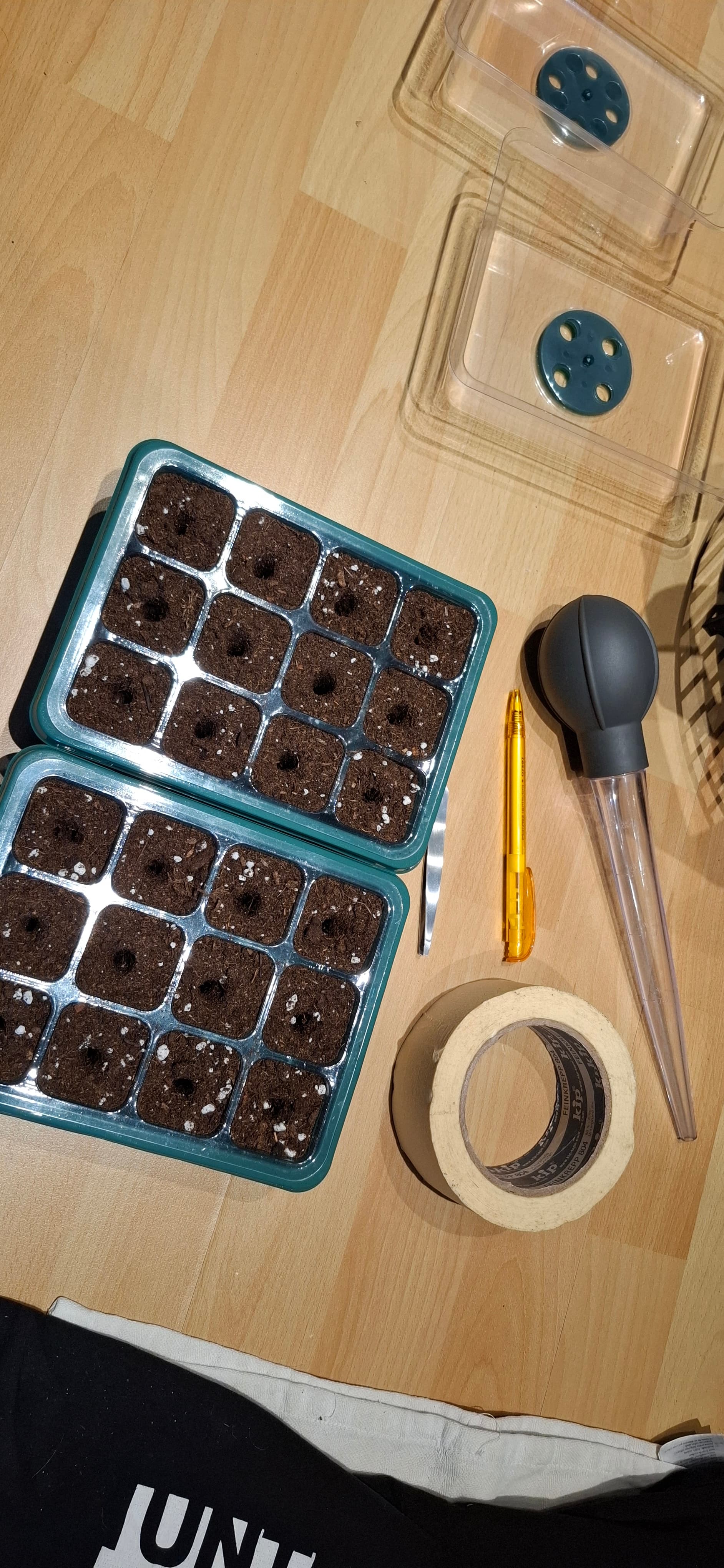 Ab in die Erde! Keimrate erkennt man an der feuchten Erde. Die restlichen Samen sind weiter auf der Matte unter einem Lichtschutz, die Mini-GewĂ€chshĂ€user stehen oben drauf fĂŒr WĂ€rme.