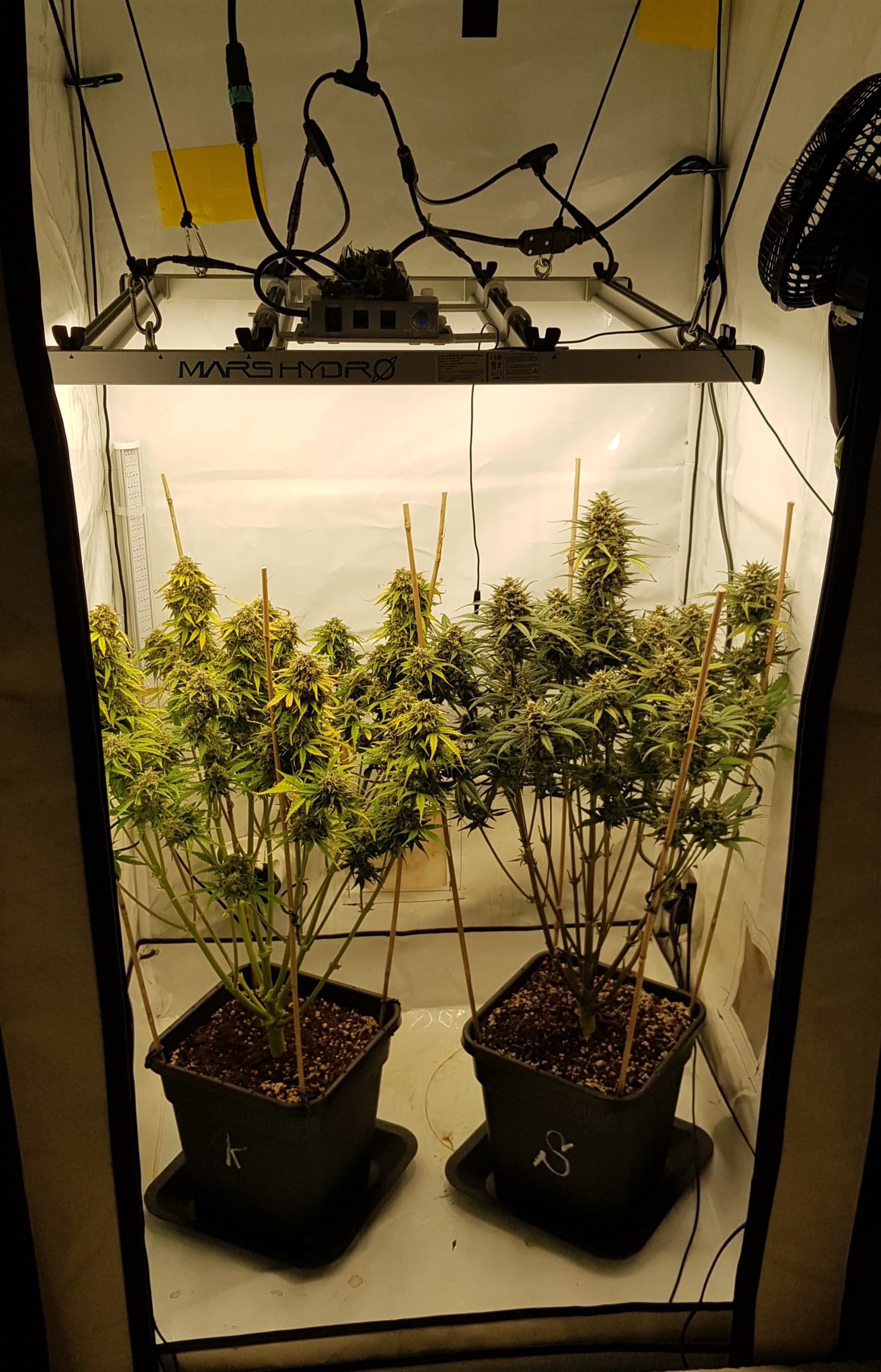 Wachstumsverzögerungen gab es keine, die werden alle gleich schnell fertig, ob LST, ob getoppt oder in Ruhe gelassen. Ich finde, die LED trägt mehr zur Höhe und Struktur bei (und die Genetik natürlich). Und LST, das is voll anfängerfreundlich und jeder kann damit rumspielen. Kann fast nix schiefgehen.