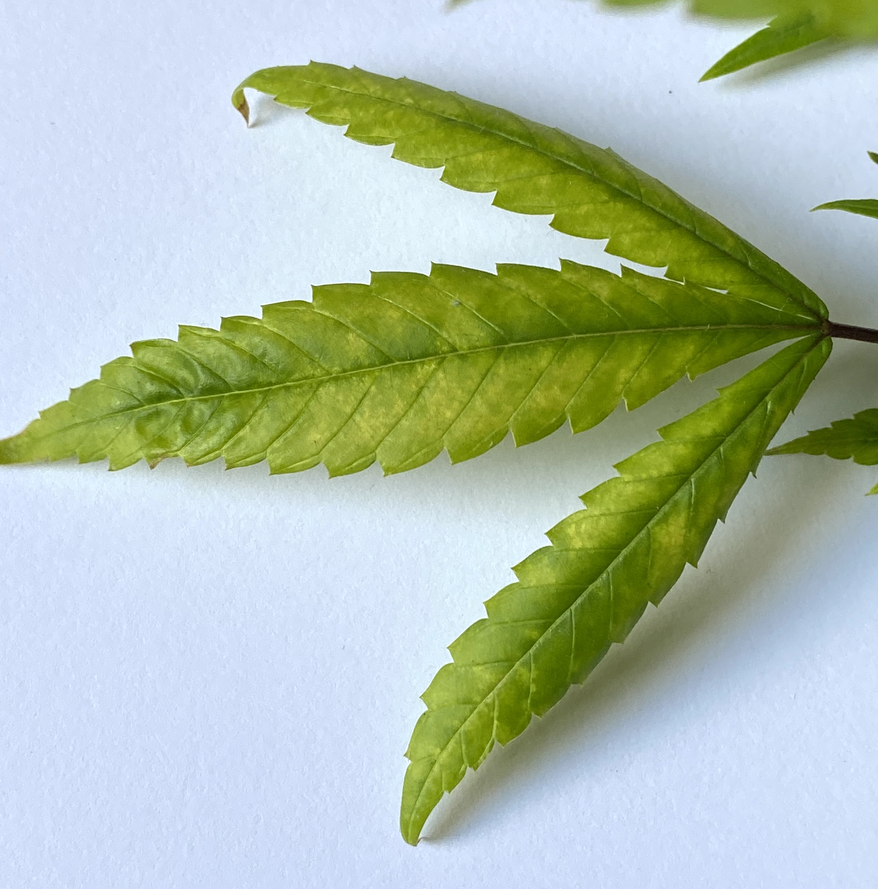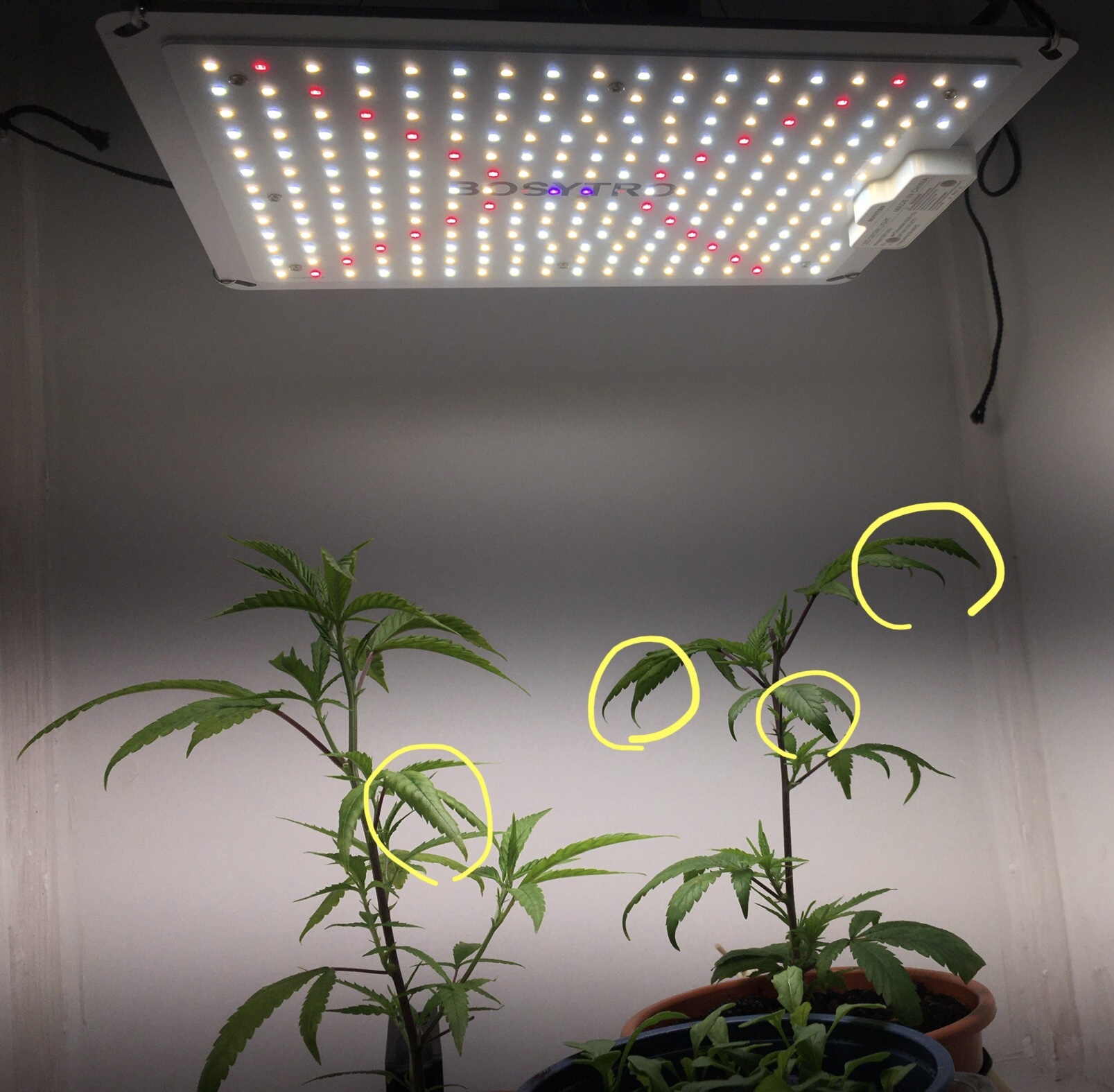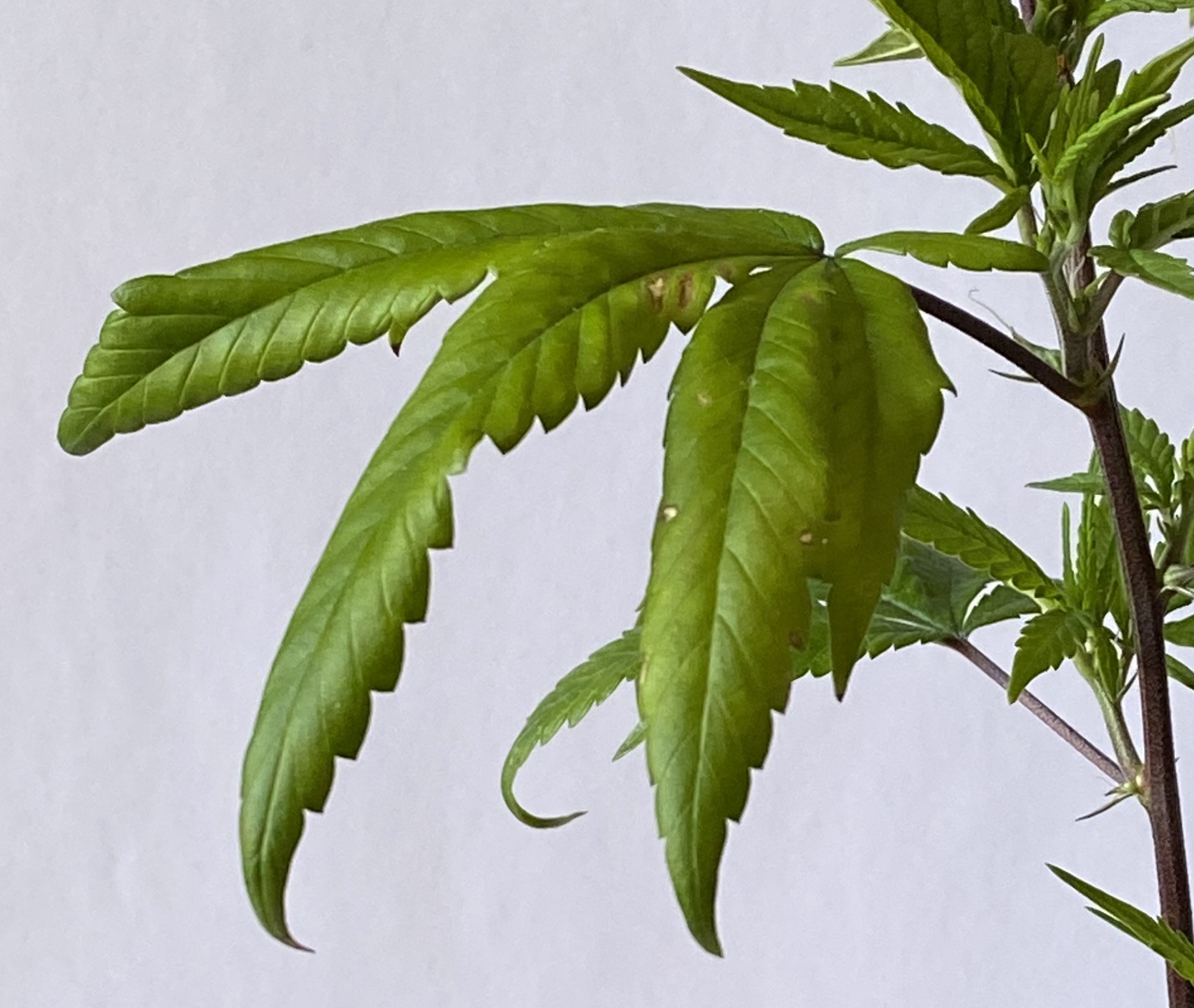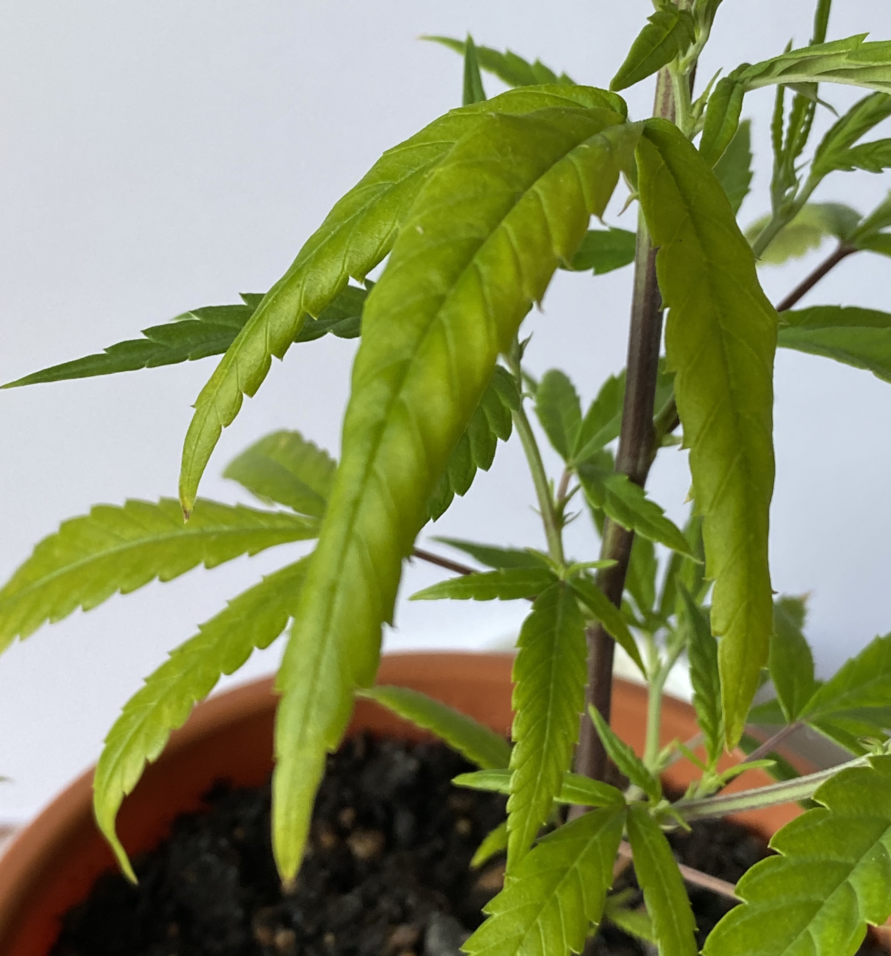 G wird erstmal so belassen, weil sie von selbst schöne Seitentriebe macht. Seltsamerweise hat sie immernoch drei Finger und komisch gescheckte Blätter (helle, fast limonenfarbige Stellen. Am deutlichsten sichtbar unter dem grow light), wächst aber gut und guckt schon mit den Wurzelspitzen unten raus. Zwei alte Blätter entfernt wegen weißen Stellen (beginnender Mehltau?). Mal sehen, ob da noch was kommt.