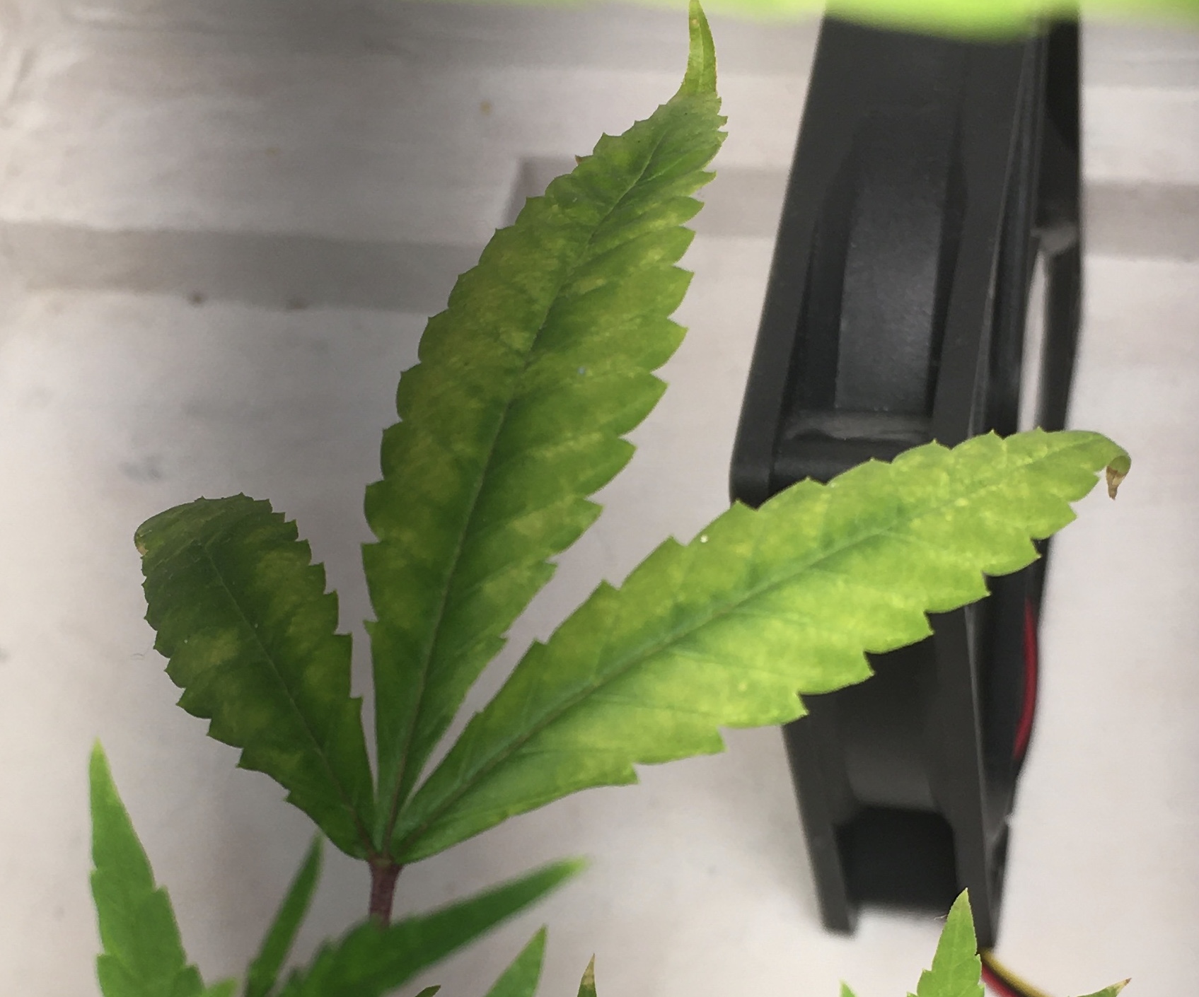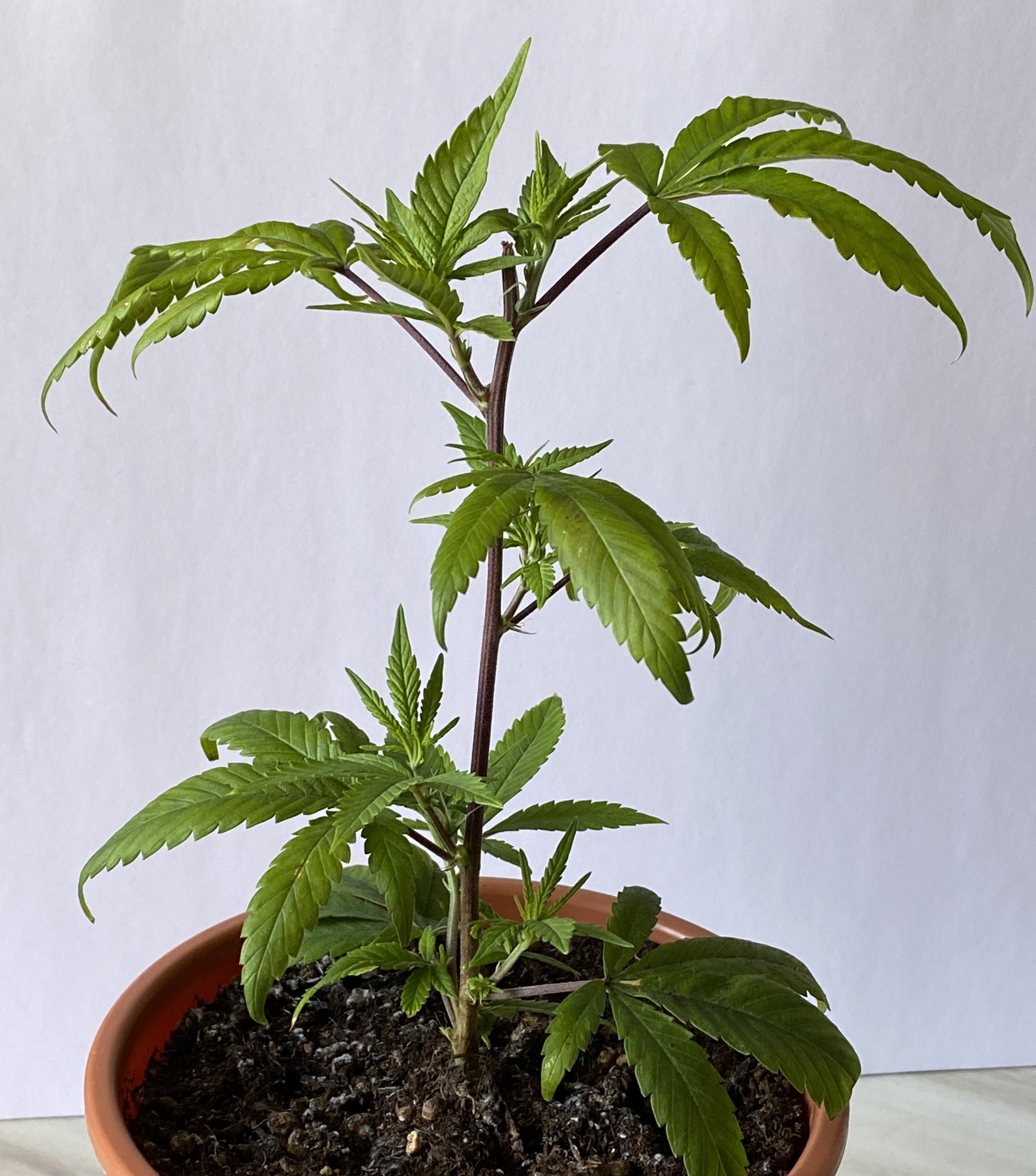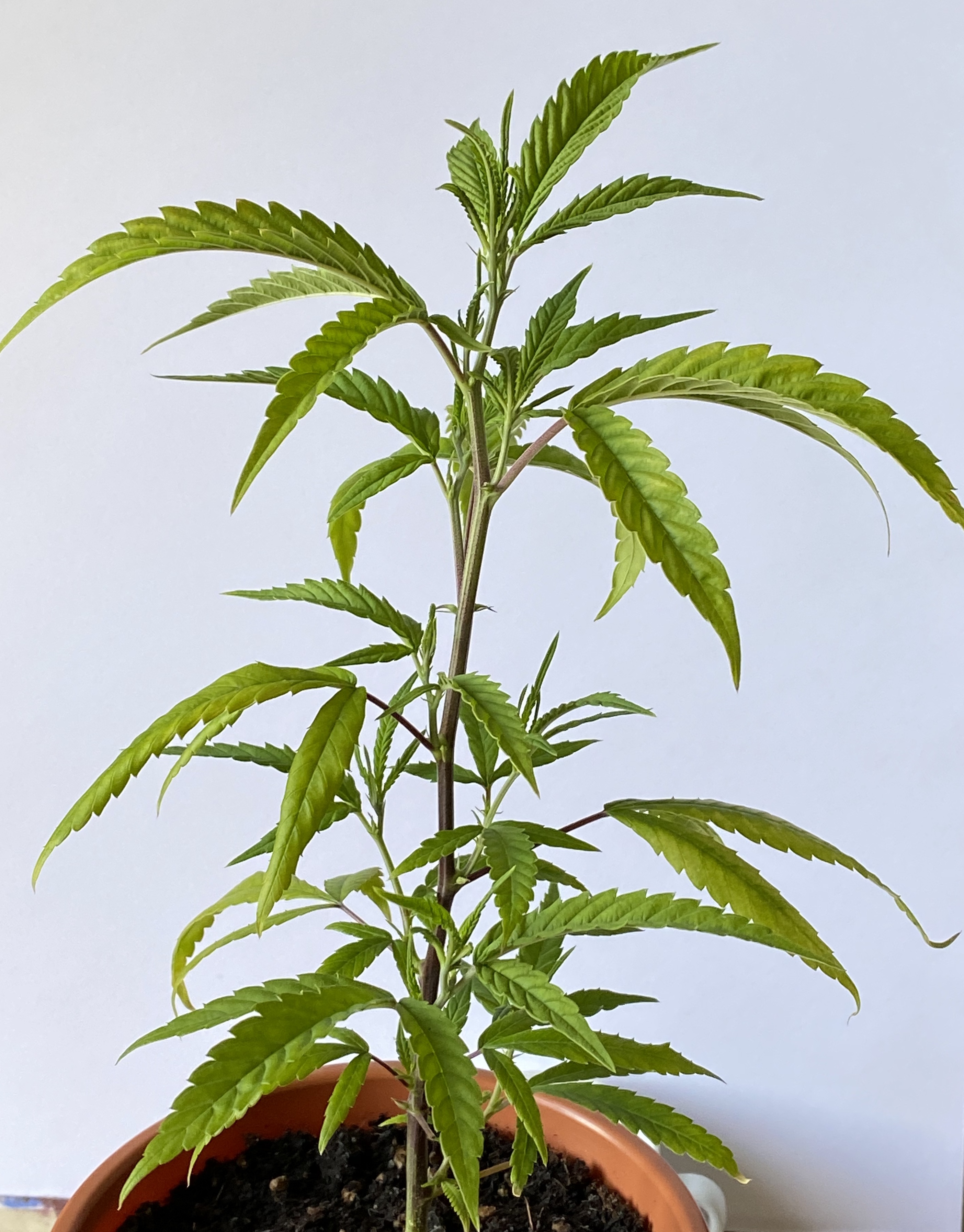Tag 10: G hat ein erstes vierfringriges Blatt! Mal sehen, ob sie jetzt loslegt - die neuen Blättchen sehen immernoch dreifingrig aus.