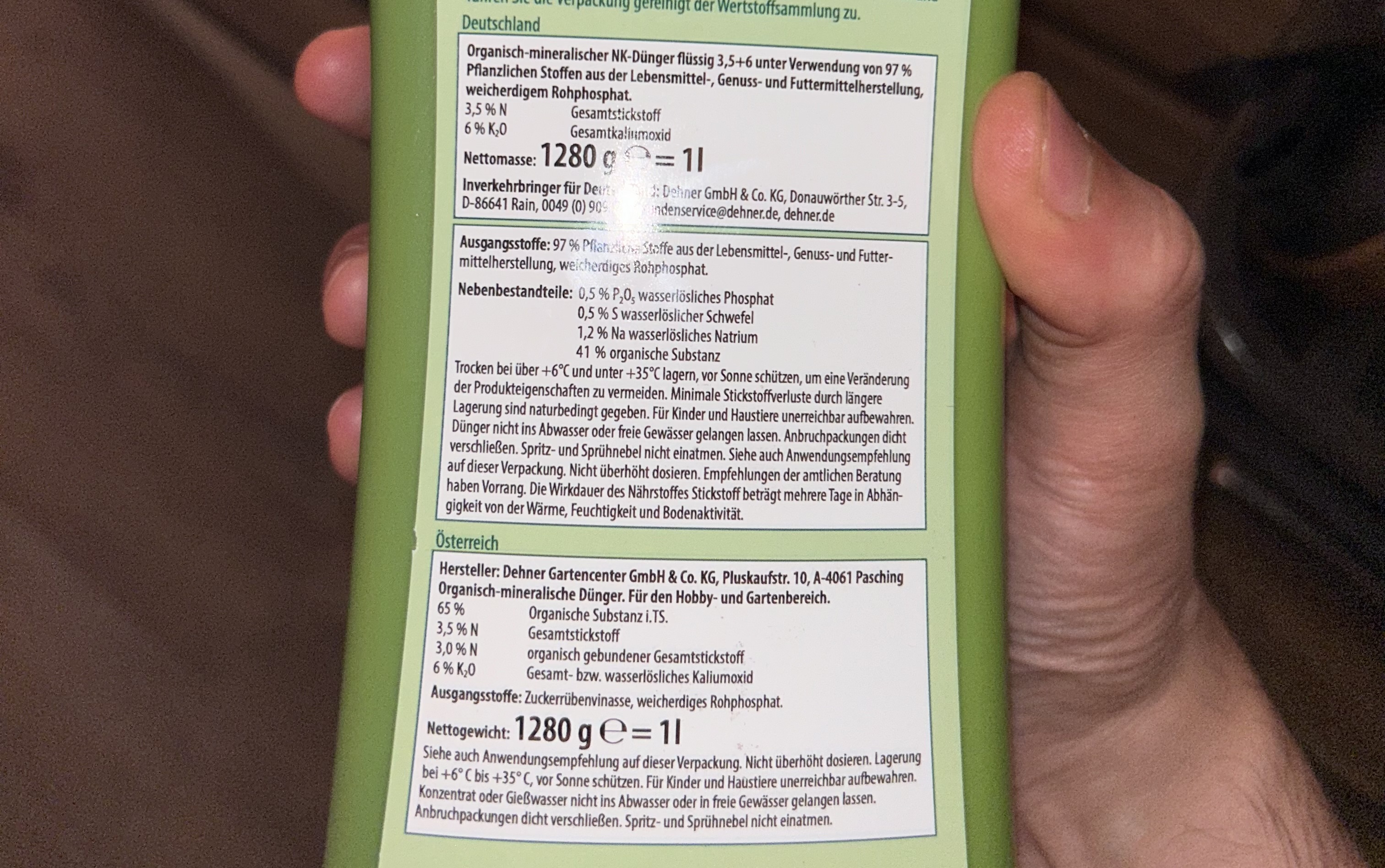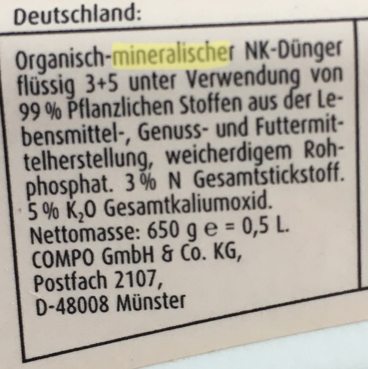 - Anfangs aus Unwissenheit Compo Bio Kräuterdünger (flüssig), 6ml pro Liter Wasser