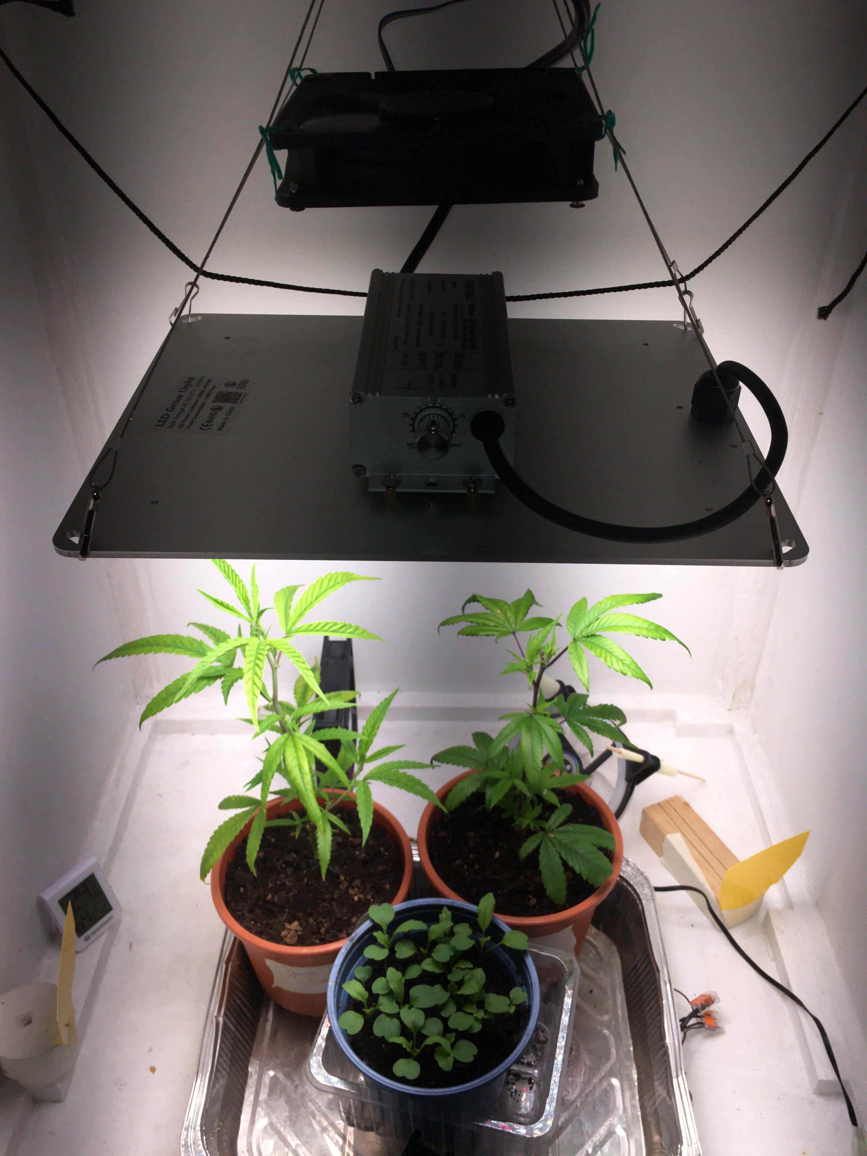 Die zwei Stecklinge sind eingezogen, erstmal ohne Abluftsystem wegen Lieferschwierigkeiten. Also Tür auf und hoffen, dass sie nicht zu früh duften.
