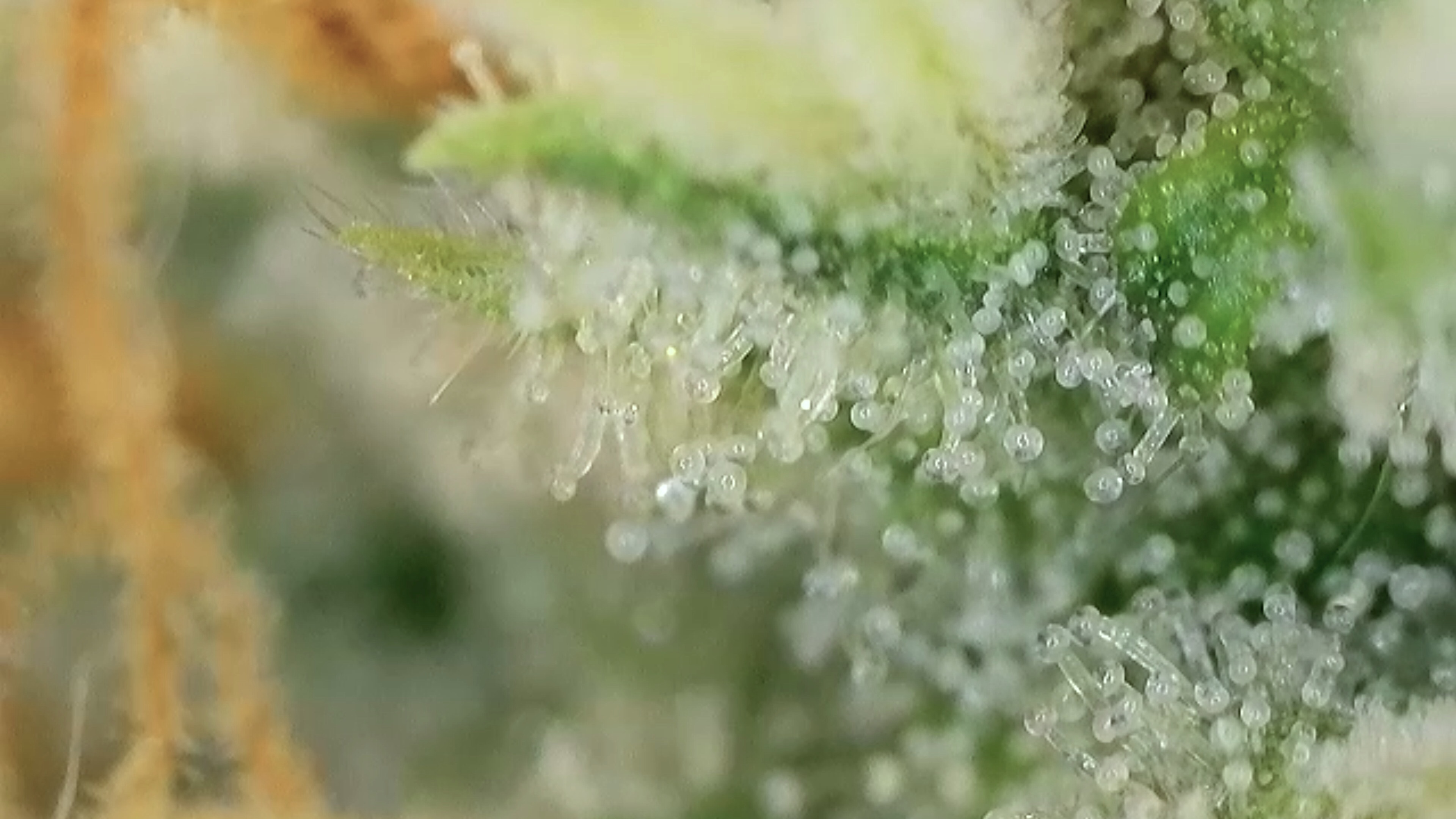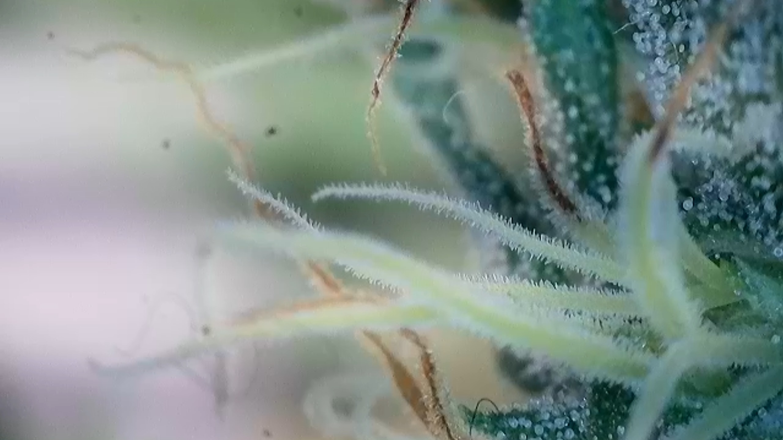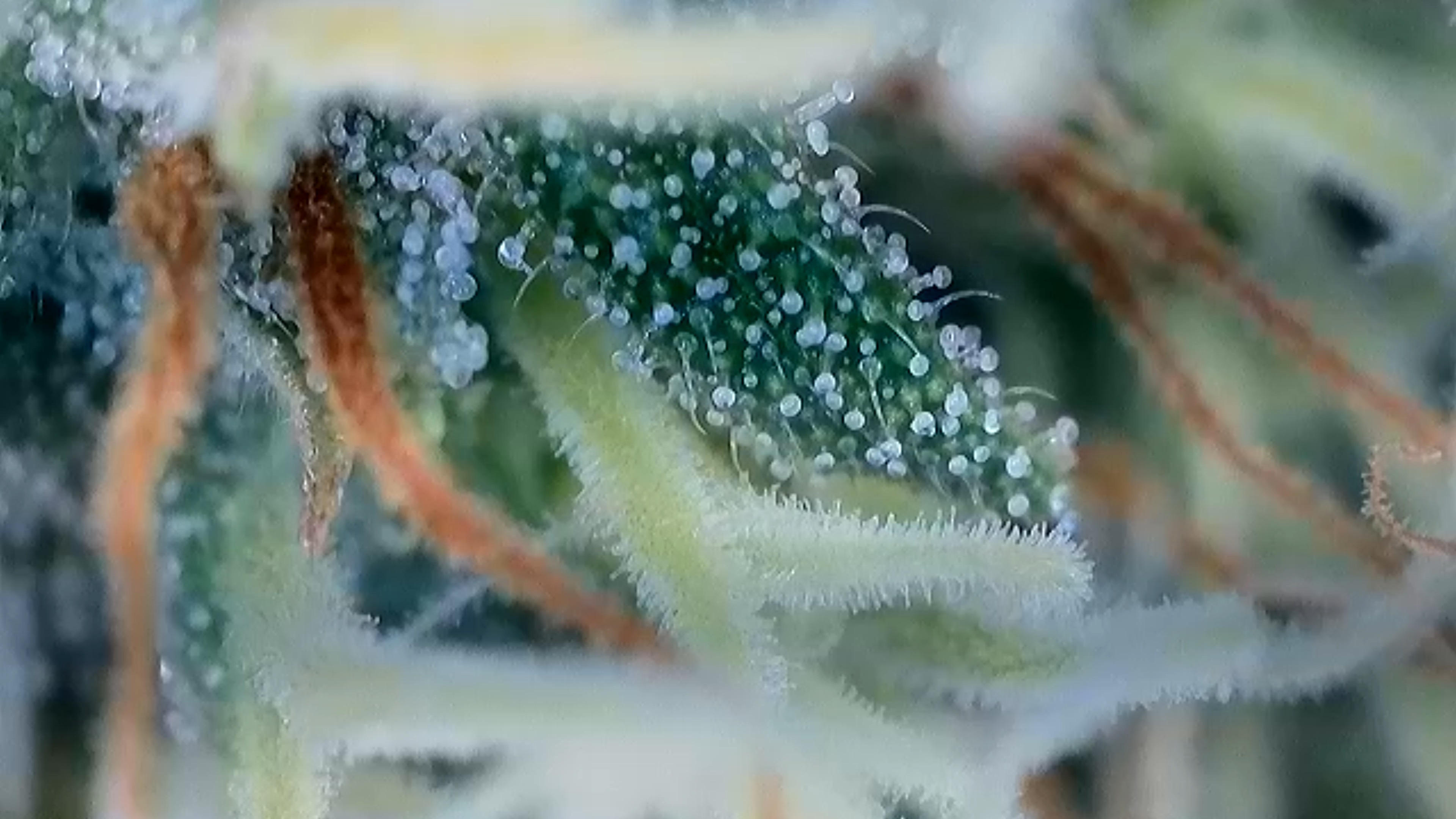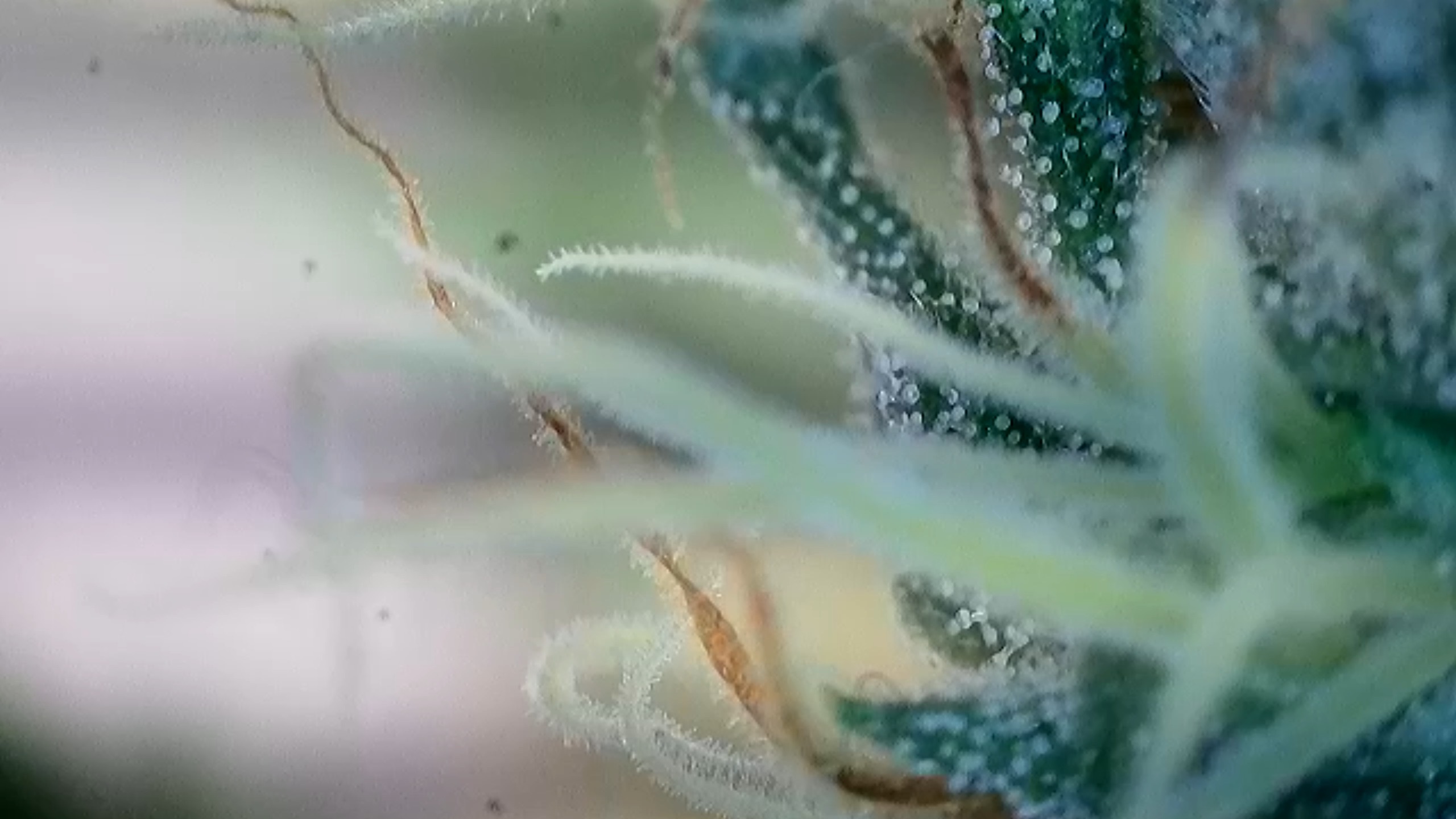 Da war ich schon so nah dran dass ich sie fast berührt habe. Bei so einer Vergrößerung ist es wirklich schwierig, richtig zu zielen und vor allem nicht zu verwackeln. Auch das Scharfstellen ist nicht so einfach, weil vergößerungsbedingt die Schärfentiefe kleiner ist als ein Trichom. So nah ist aber für die Reifebestimmung wahrscheinlich gar nicht nötig. Trotzdem geil dass es geht