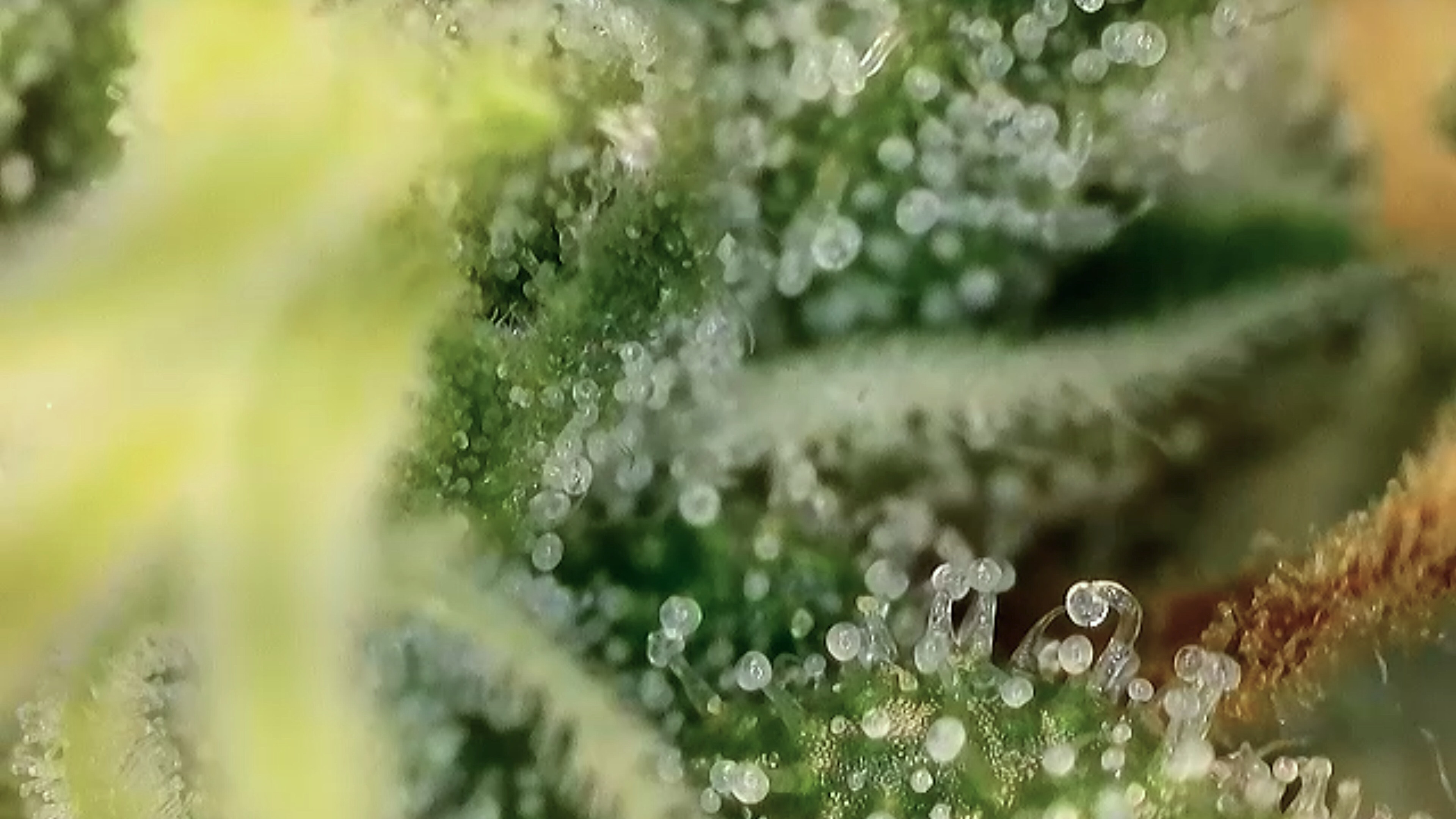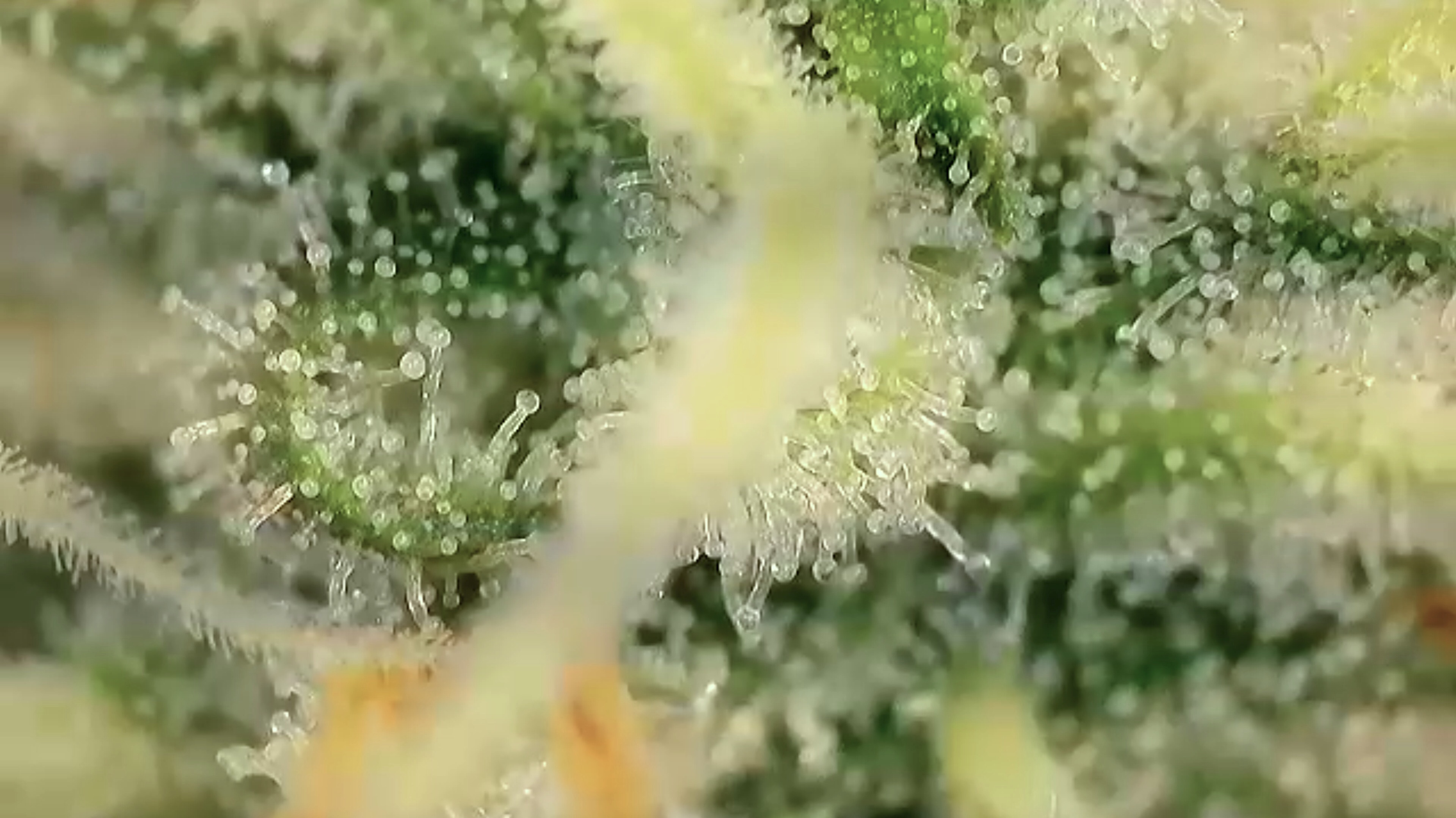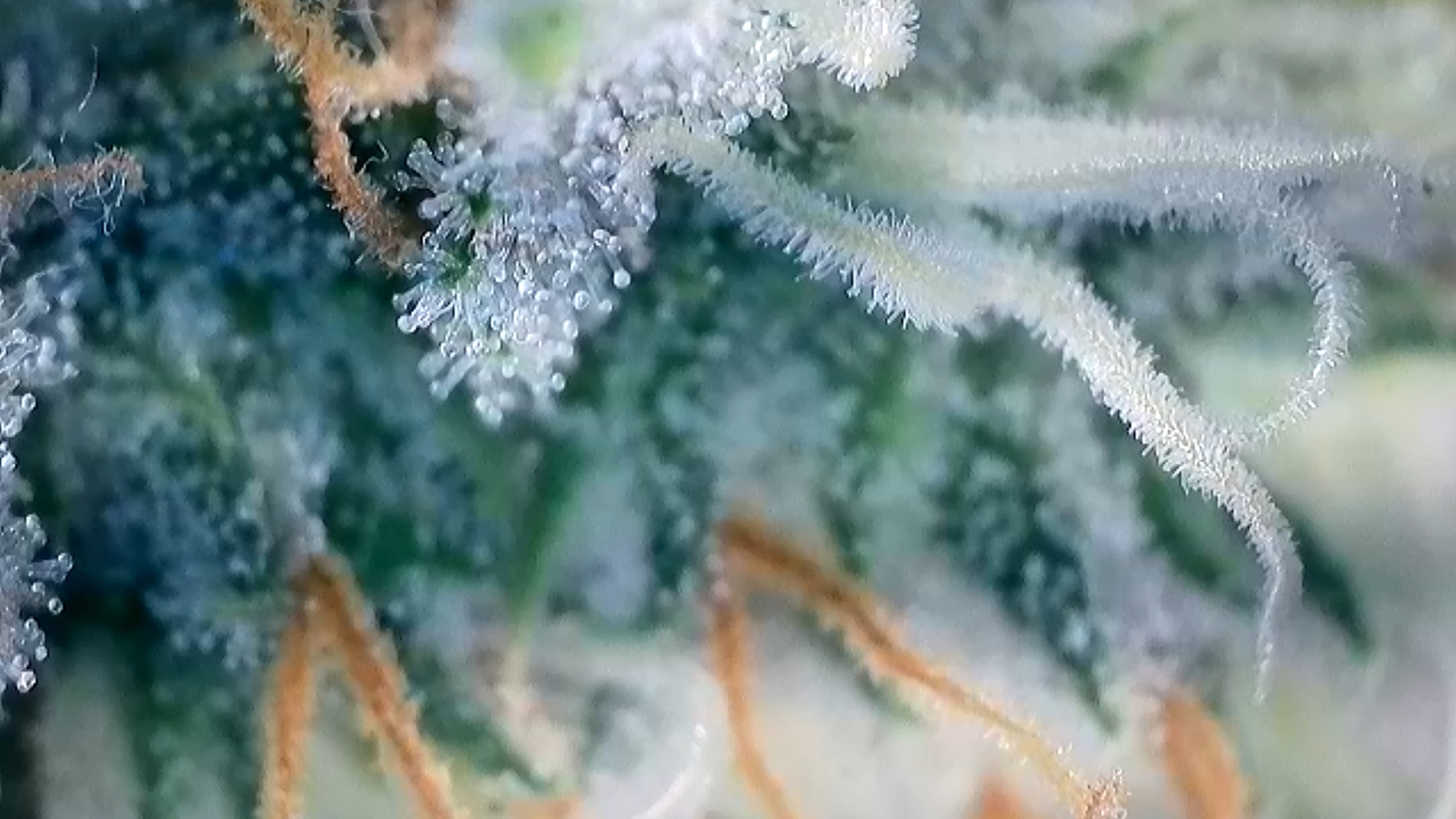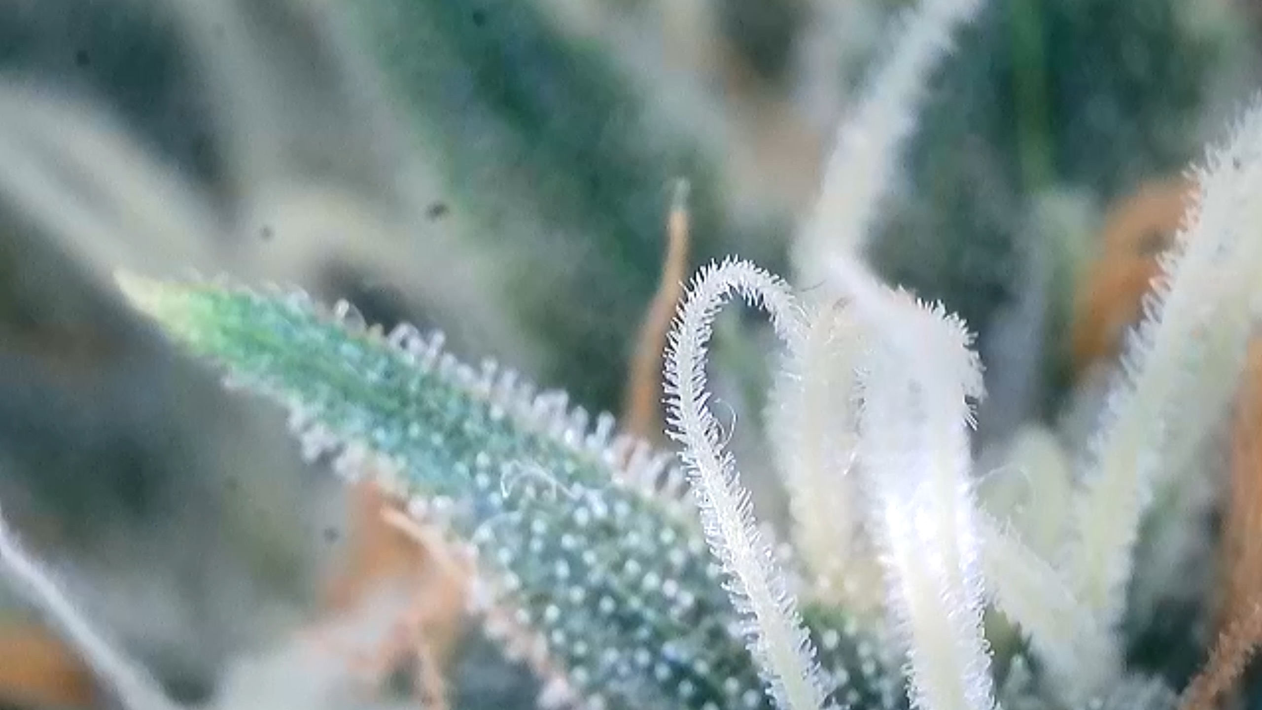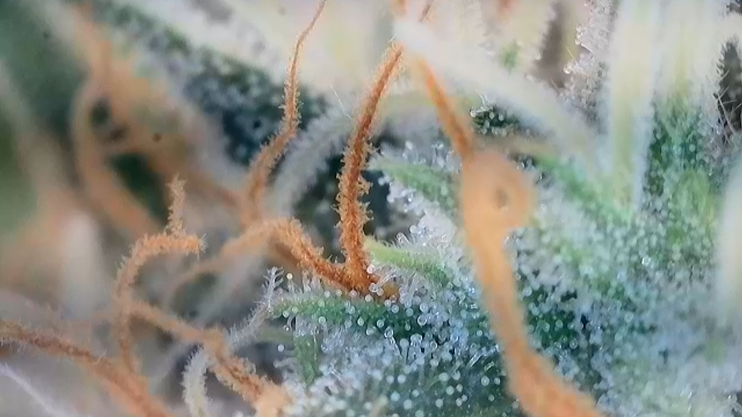 Da war ich schon so nah dran dass ich sie fast berührt habe. Bei so einer Vergrößerung ist es wirklich schwierig, richtig zu zielen und vor allem nicht zu verwackeln. Auch das Scharfstellen ist nicht so einfach, weil vergößerungsbedingt die Schärfentiefe kleiner ist als ein Trichom. So nah ist aber für die Reifebestimmung wahrscheinlich gar nicht nötig. Trotzdem geil dass es geht