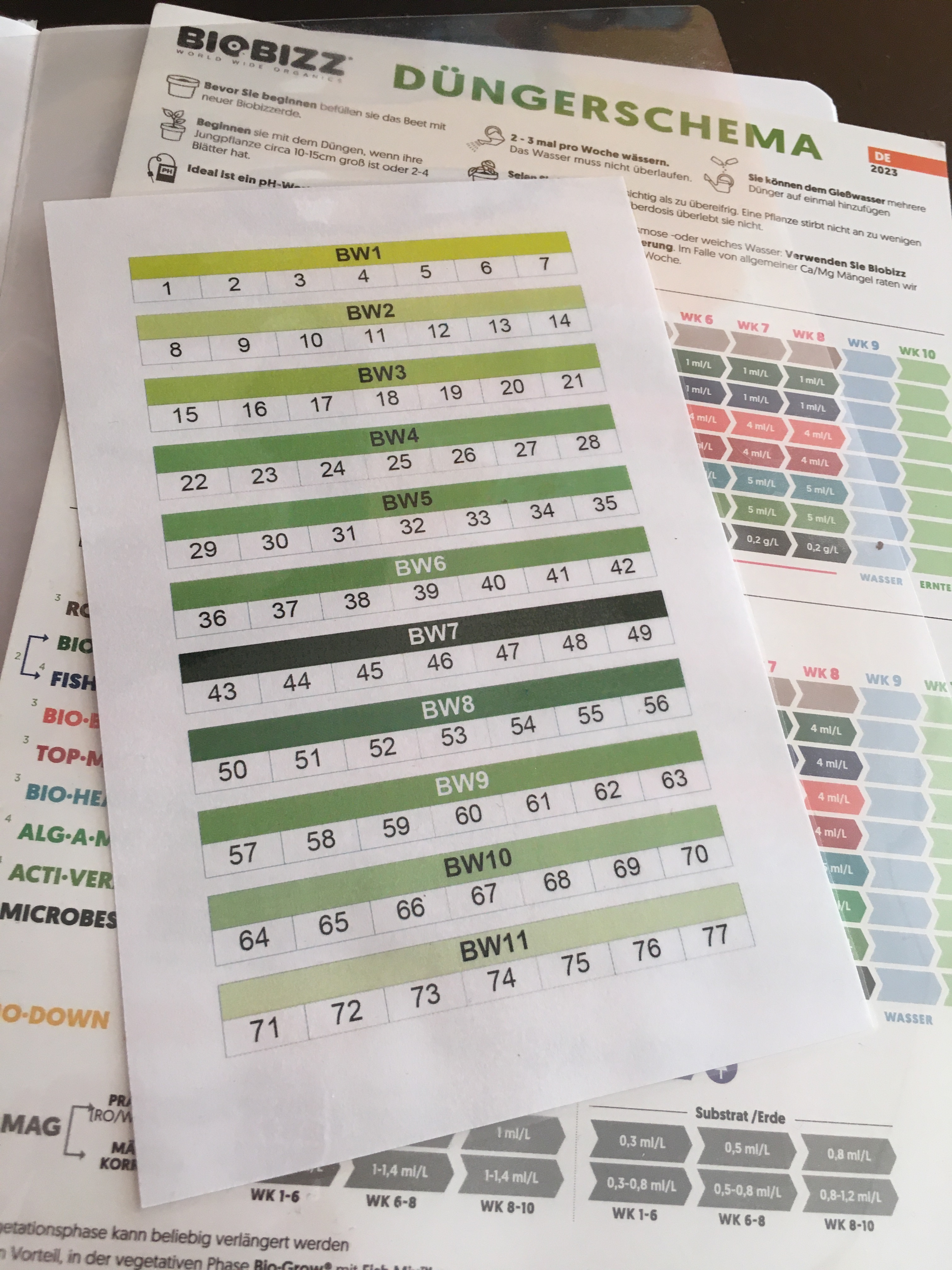 Bei dem Düngeschema ist auch so eine Sache. Für Anfänger einfach 100% vom Schema und nach dem Plan von Biobizz ist voll ok und führt zum Ziel.
