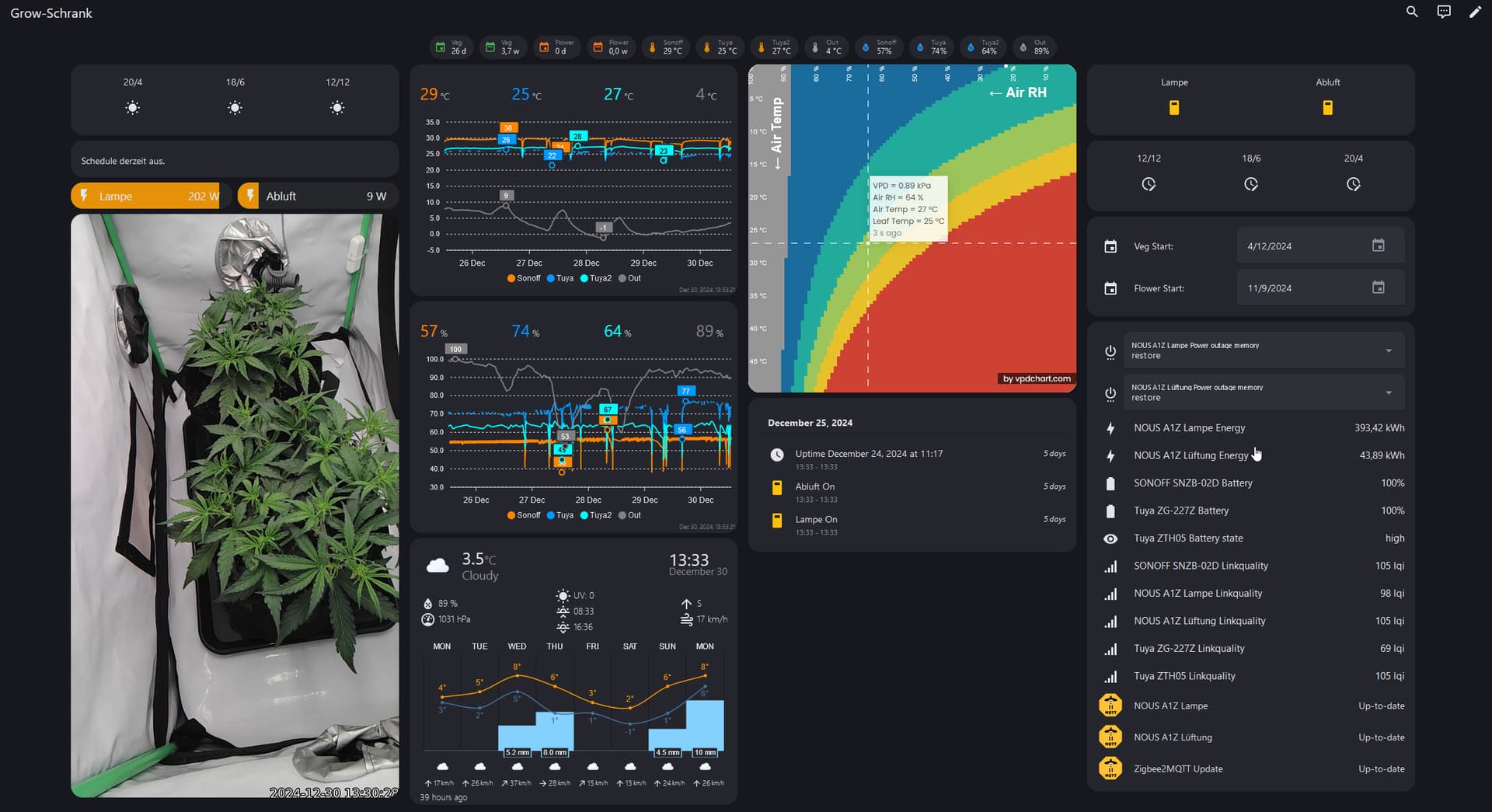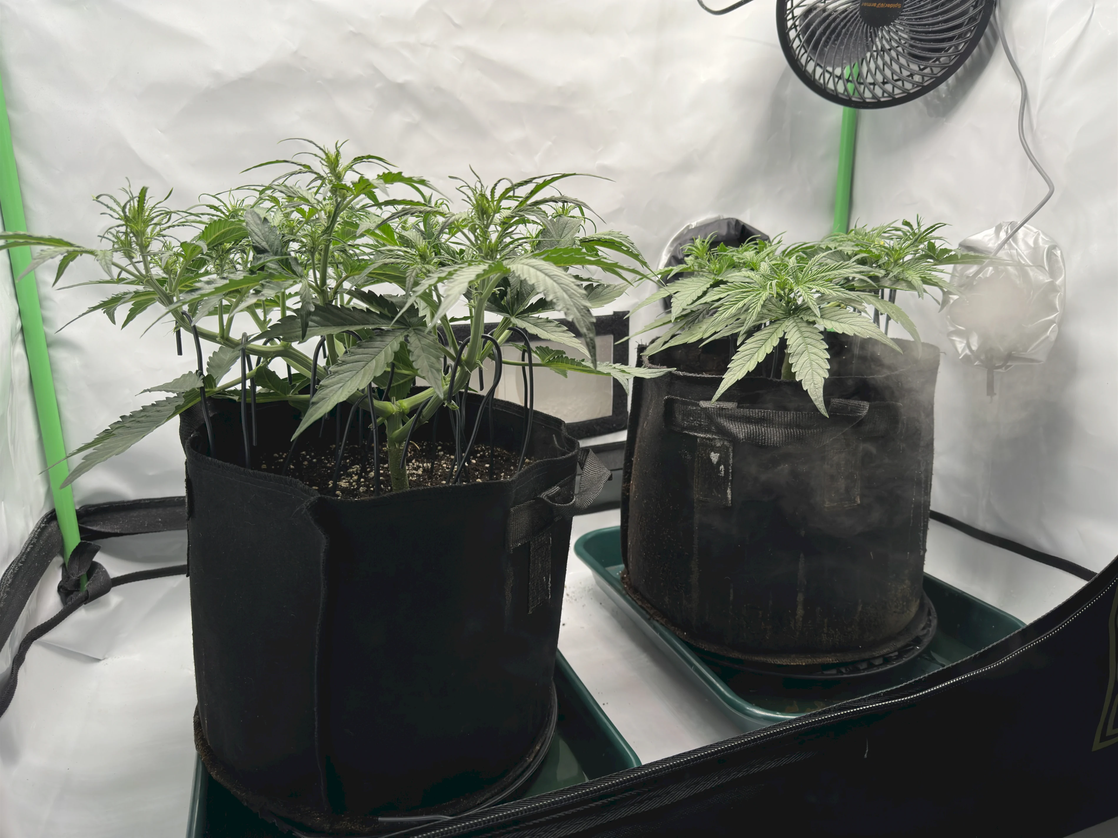 Location: Indoor, UndrCovrLab M – V4, ca 95x60cm im Ikea Pax Schrank. Beleuchtung: SpiderFarmer SF2000, 24H bei ca 300-700PPFD (langsam gesteigert). Damit bin ich ab ca Woche 3 bei meinen DLI Werten weit über den typischen 40-45 - habe damit aber gute Erfahrungen gemacht, solange man den VPD-Wert auch schön konstant hält. Belüftung: SpiderFarmer 150mm Setup, läuft permanent auf ca 9W, 2 Umluftventilatoren. Außerdem ein Humidifier von MarsHydro, mit welchem ich den VPD-Wert permanent konstant halte. Zu Beginn so 0,6 und derzeit (Tag 26) so 0,8. Growmedium: Eigene Mischung aus Plagron Light, Perlit, Wurmhumus und etwas BioBizz Premix. Außerdem etwas Mycorrhiza Pilze. Ca 13L Stofftöpfe auf Risern mit Abtropfschale. Dünger: Die ersten 4-5 Wochen nix, danach BioBizz nach Bedarf. Update: Am Ende wurde es für die linke Pflanze dann nach einigen Wochen doch mineralischer Dünger (Plagron Terra Bloom). Sie war in der Blüte einfach zu hungrig für organischen Dünger in diesen relativ kleinen Töpfen Die rechte Pflanze hat aber durchgehend Biobizz erhalten. Bewässerung: Leitungswasser, ca 4-5L, alle 2-4 Tage, je nachdem wie schnell sie trocknen.