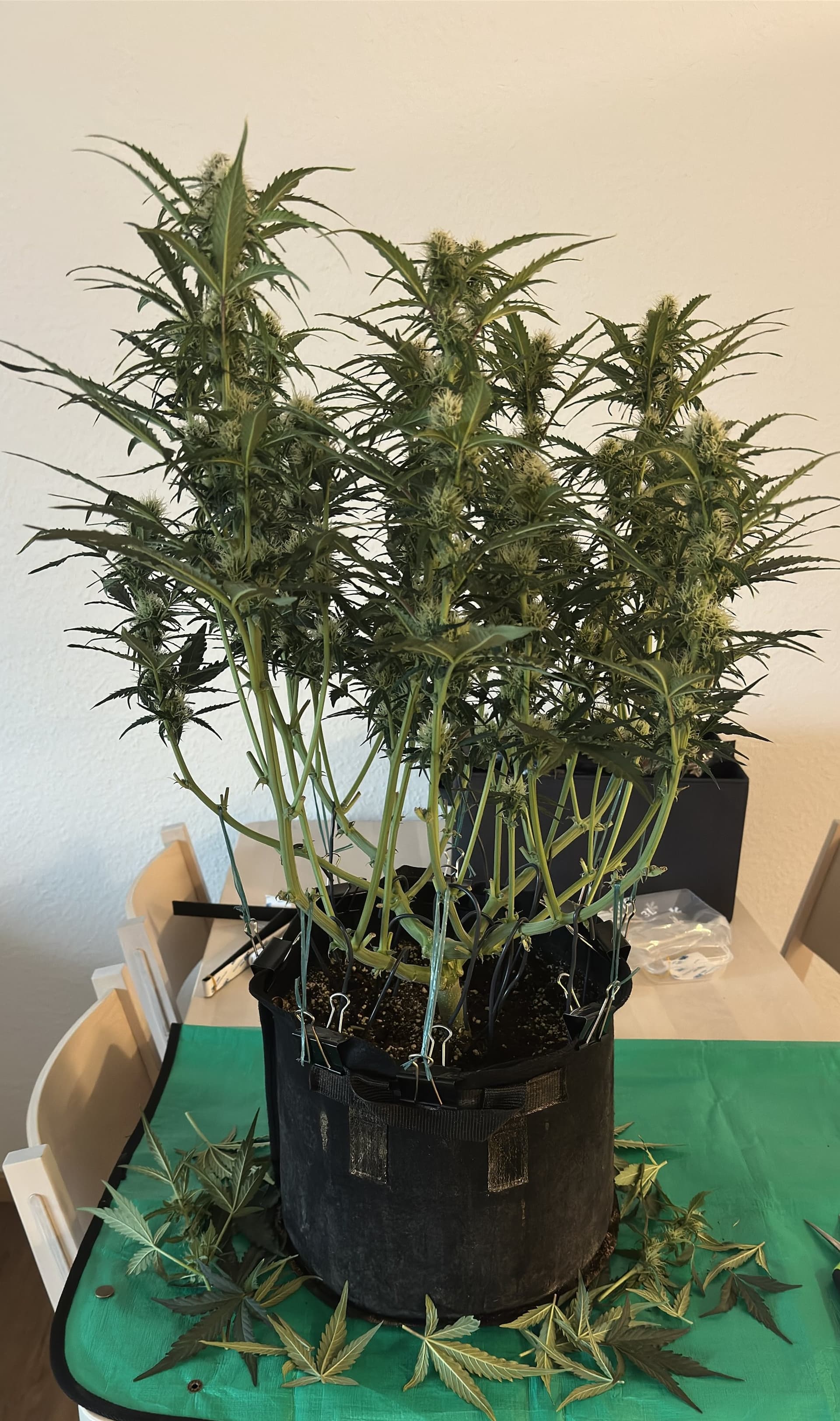 Es ist Tag 29, und heute hat die linke Pflanze ihr finales Training erhalten. Dazu haben wir Triebe am Topfrand mittels Papierklammern und Gartenschnur weiter nach außen ausgebreitet, so dass alle Triebe möglichst gleich viel Platz haben, und auf der gleichen Höhe sind. So nutzen wir auch den Platz im Zelt bestmöglich aus. Die untersten 4 Blätter haben wir alle entfernt. Sie sind inzwischen nahezu komplett überdeckt. Außerdem wollen wir, dass die Pflanze ihre Energie lieber in neue Blätter weiter oben steckt, anstatt die alten Blätter zu erhalten. Zusätzlich wurde noch das ein oder andere Blatt entfernt, welches zur Mitte wächst und einen benachbarten Nebenstamm etwas überdeckt.