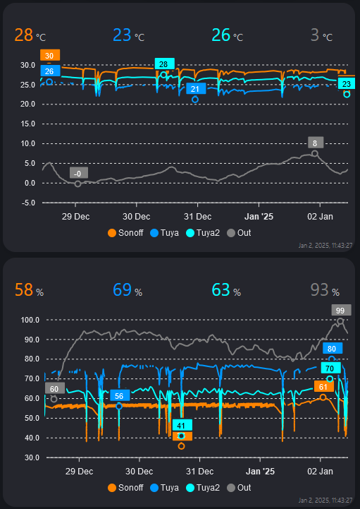 Das sieht man auch hier schön. Die Ausreißer nach unten zeigen, wann ich das Zelt geöffnet habe