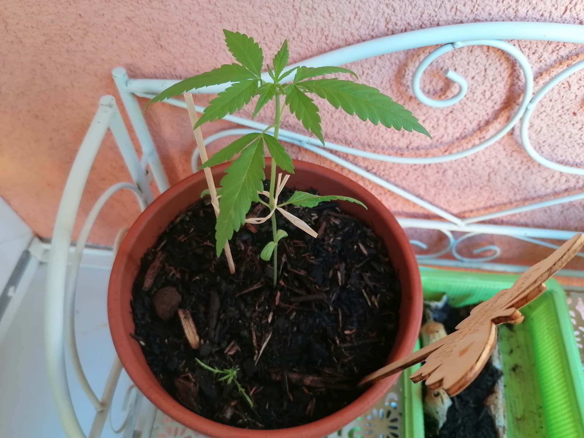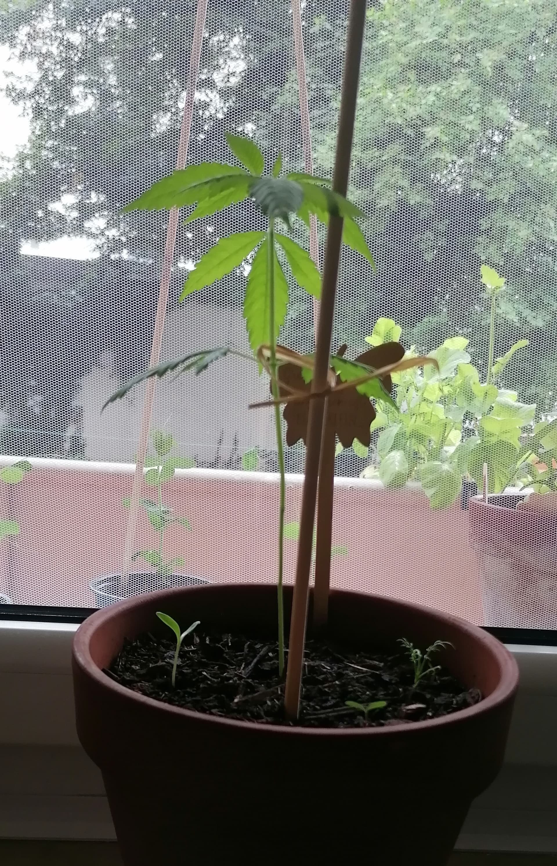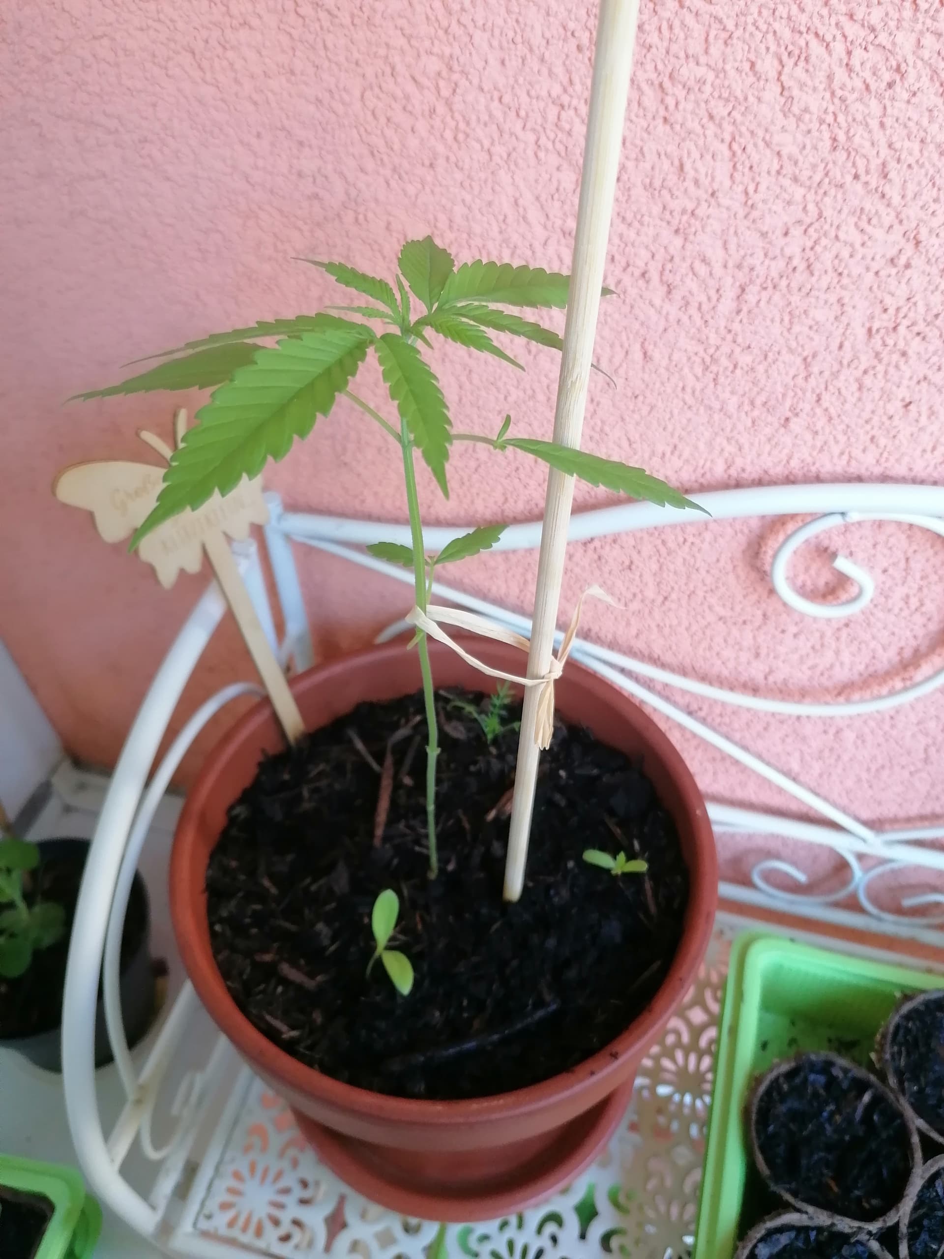 Außerdem neige ich dazu meinen Pflanzen zu viel Wasser zu geben, daher ist unten immer ein Steinchen und eine Schicht Blähton. So kann das Wasser wieder abfließen und es entsteht keine Staunässe. Zum Stabilisieren gibt es einen Bambusstab und Bast. Nix aus Plastik, alles nachhaltig und schön grün wie das Weed selbst, was da wächst