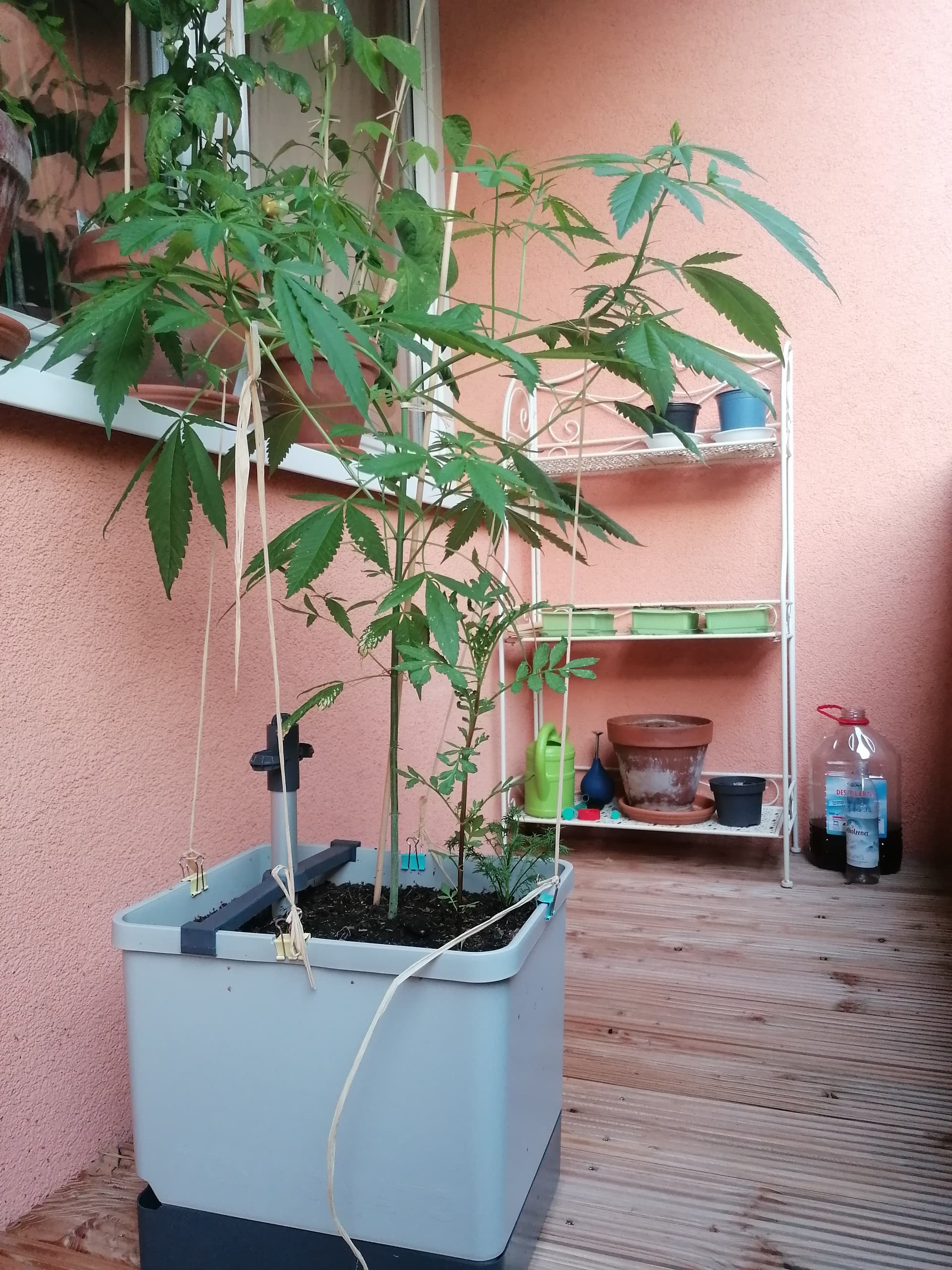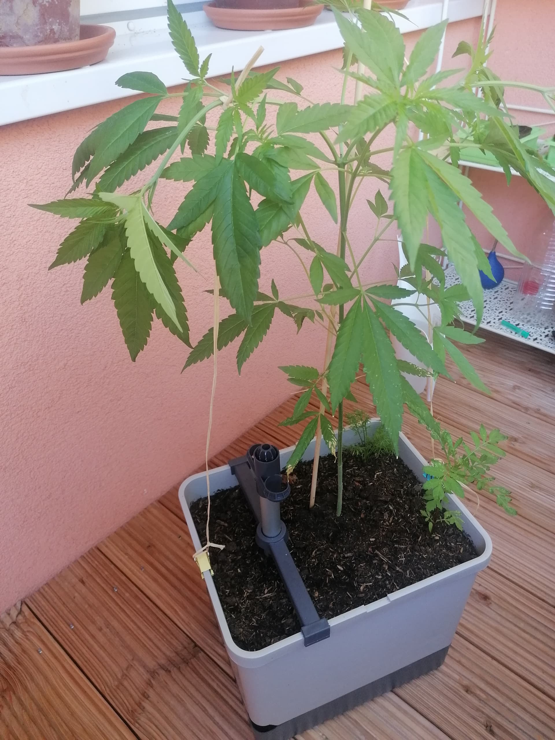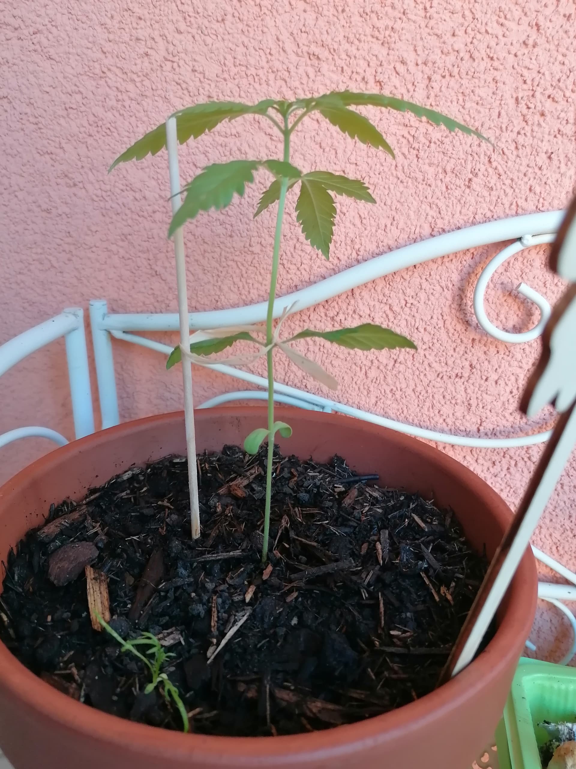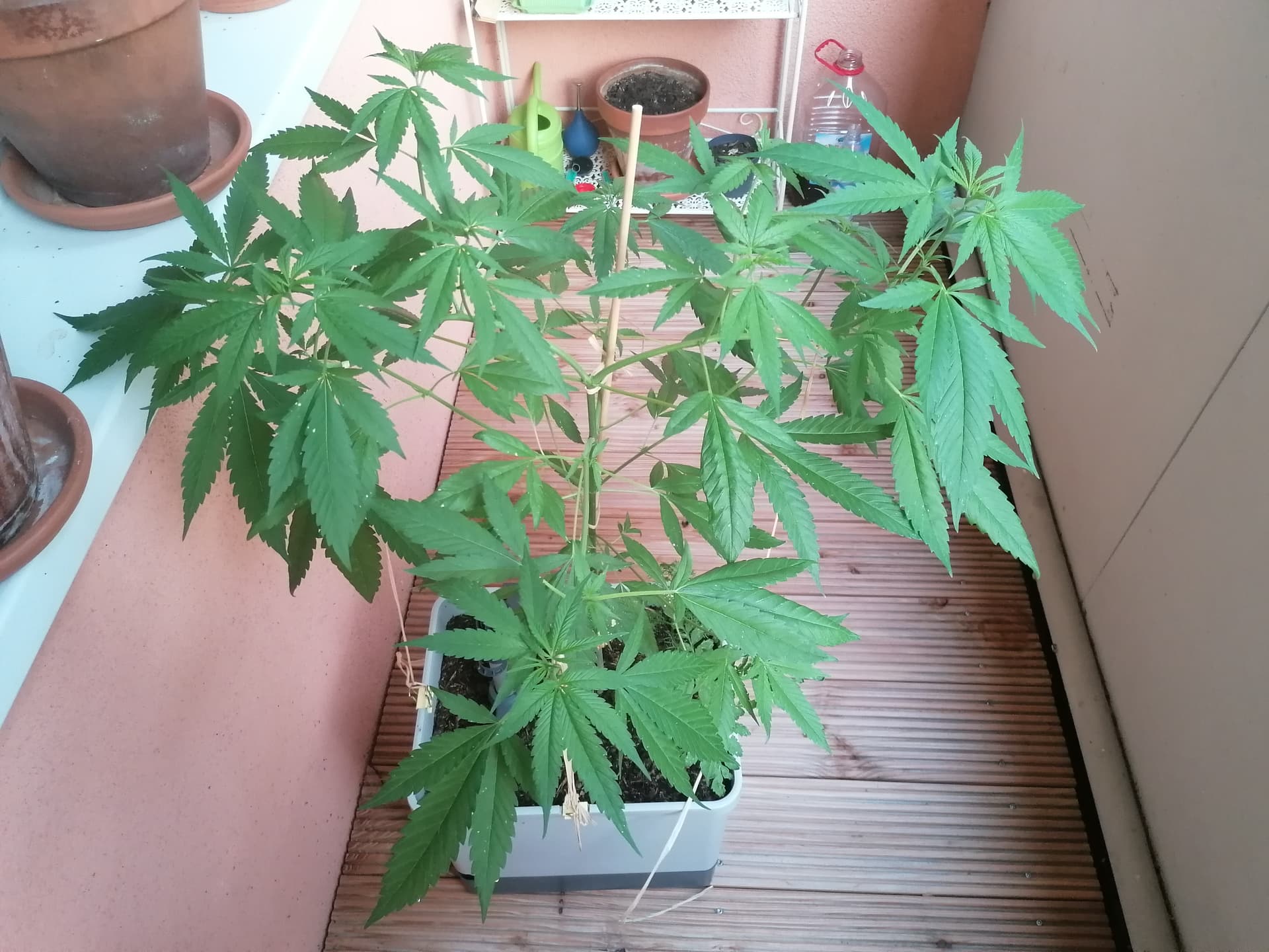 Außerdem neige ich dazu meinen Pflanzen zu viel Wasser zu geben, daher ist unten immer ein Steinchen und eine Schicht Blähton. So kann das Wasser wieder abfließen und es entsteht keine Staunässe. Zum Stabilisieren gibt es einen Bambusstab und Bast. Nix aus Plastik, alles nachhaltig und schön grün wie das Weed selbst, was da wächst