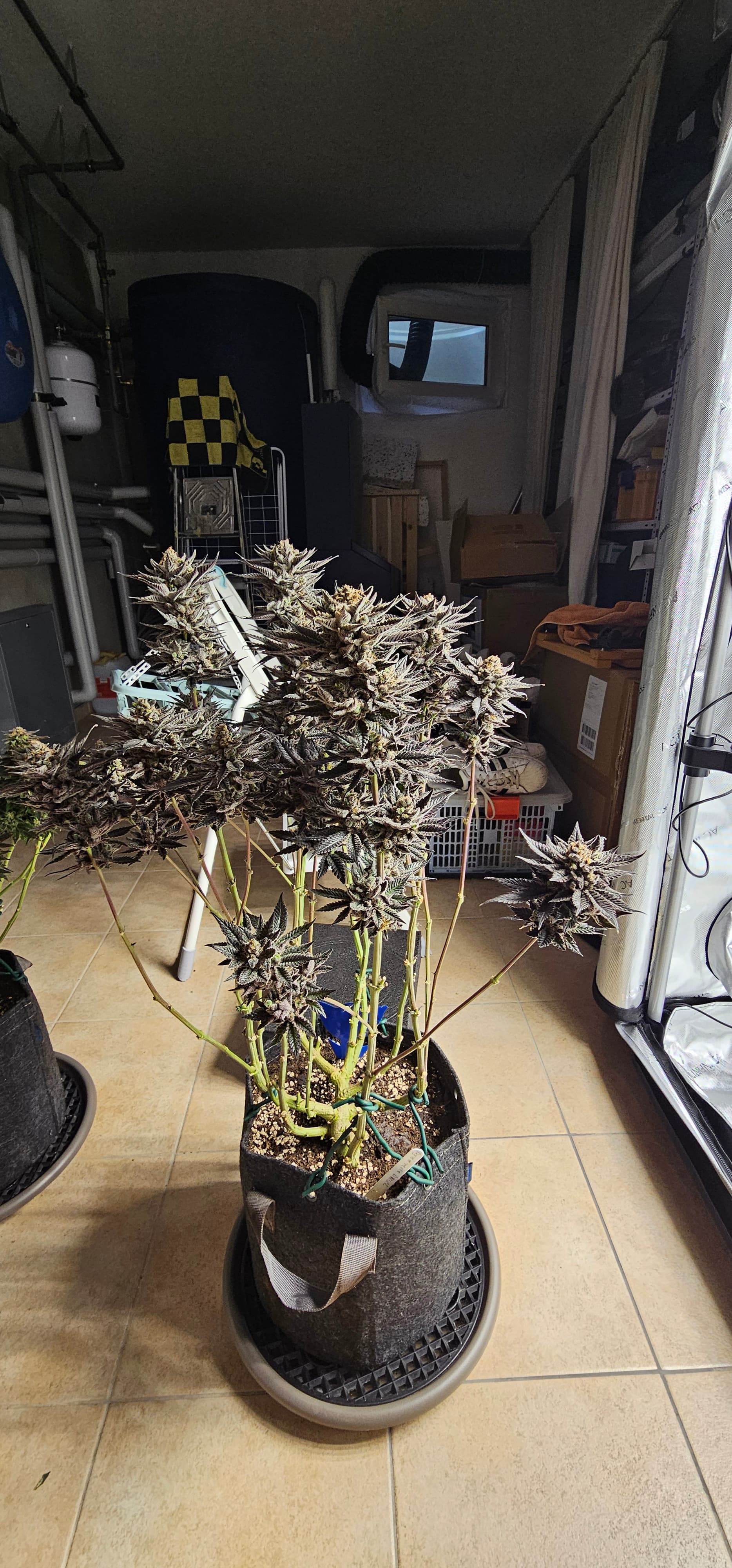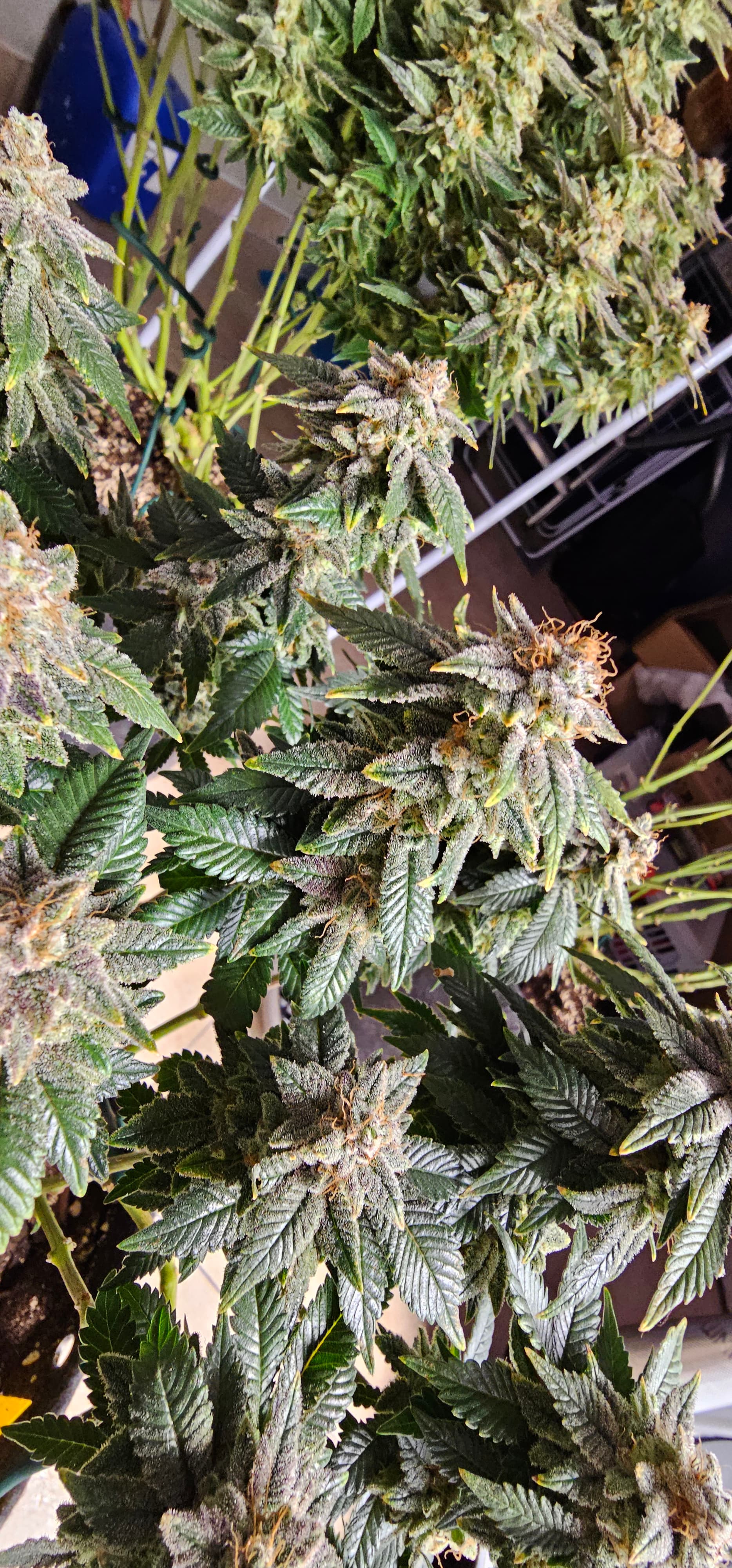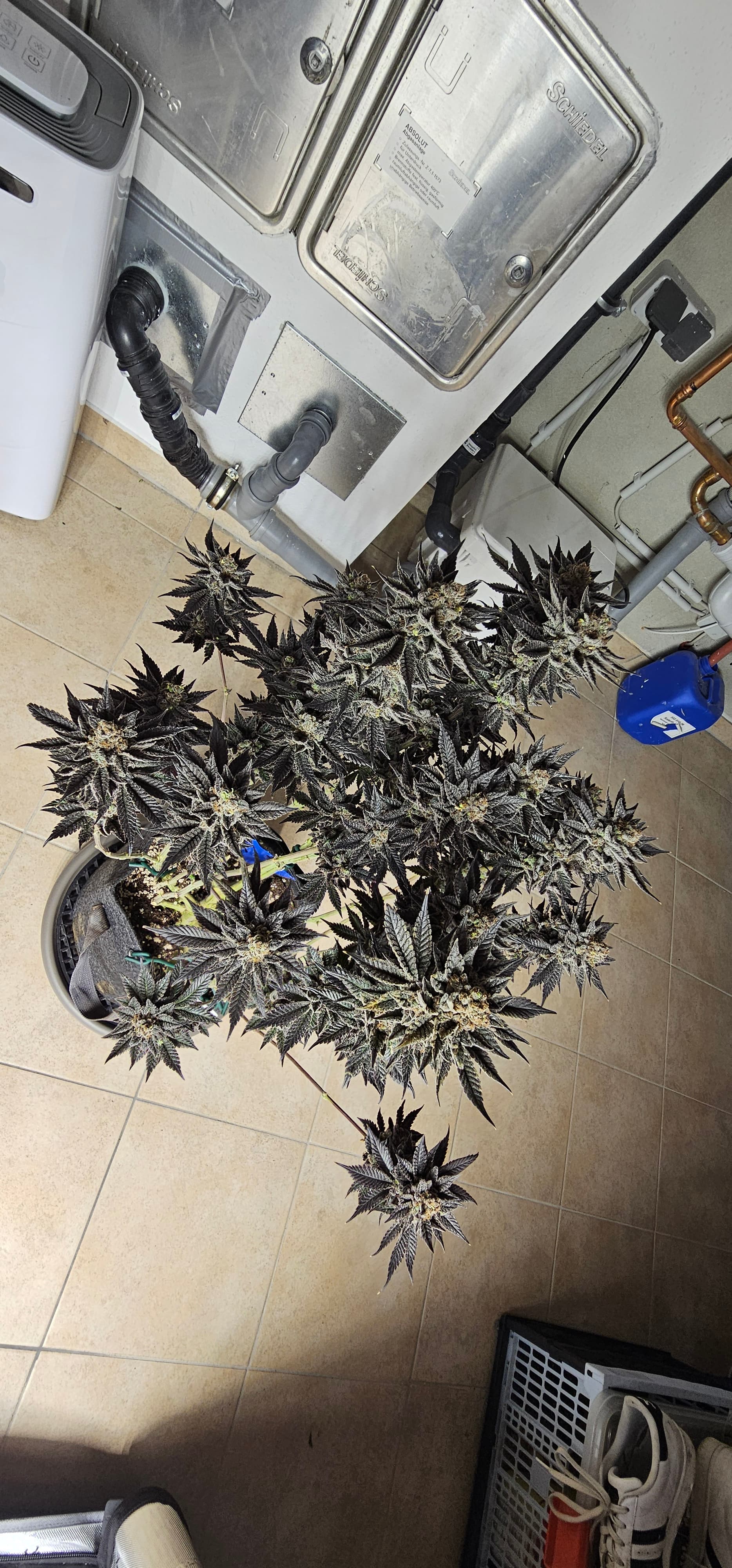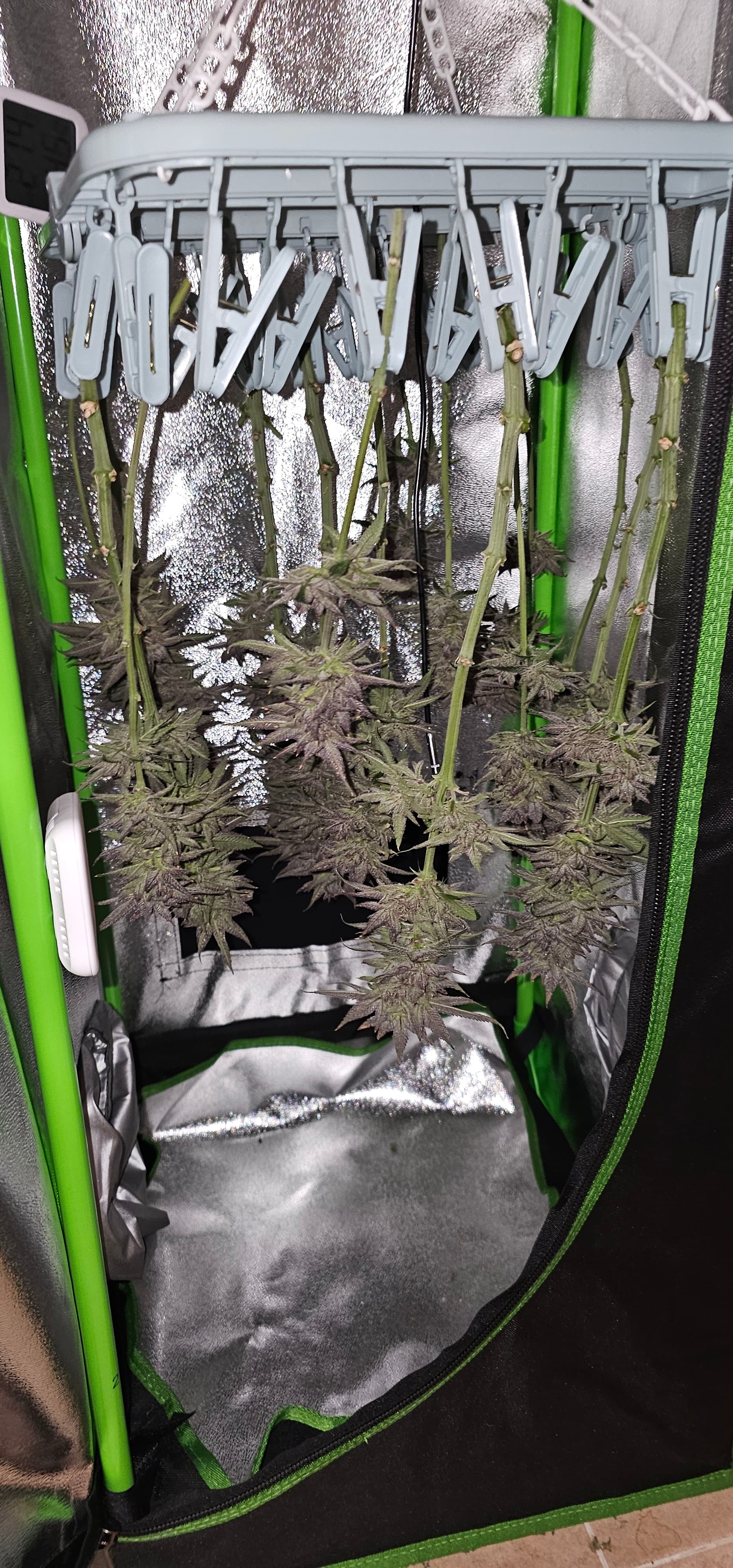 Ein neues Update aus dem Keller. Die Queen trocknet im 40*40 Zelt vor sich hin. Die Zahlen Temp etc. Hänge ich als Screenshot an. Da hat der alte Controller erhalten müssen um denn Trocknungsprozess zu überwachen. Die anderen drei werden nicht fetter, aber sie reifen ab . Die HulkBerry und die DynamiteDiesel bekommen noch Dünger, aber ich überlege schon damit auf zu hören. Die DynamiteDiesel hat ganz schon die Farbe gewechselt. Und die HulkBerry fängt auch schon an.