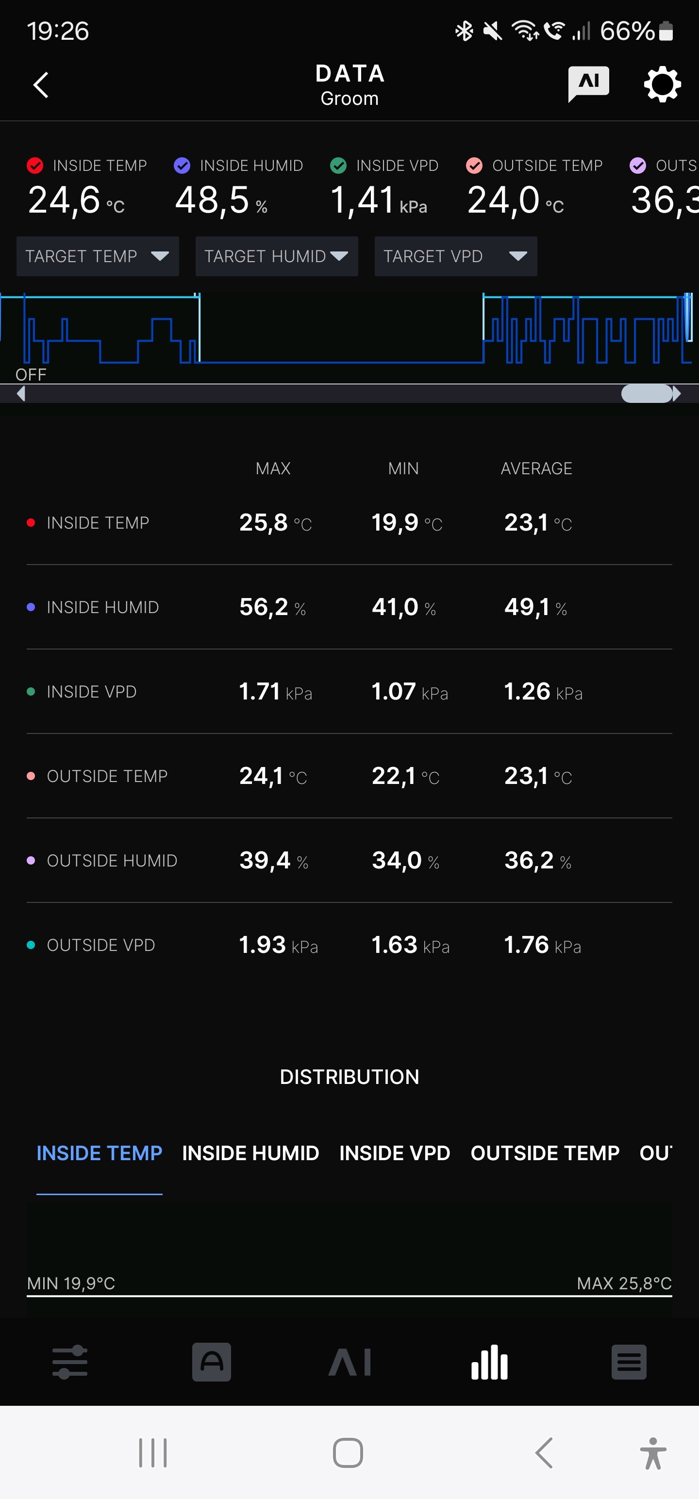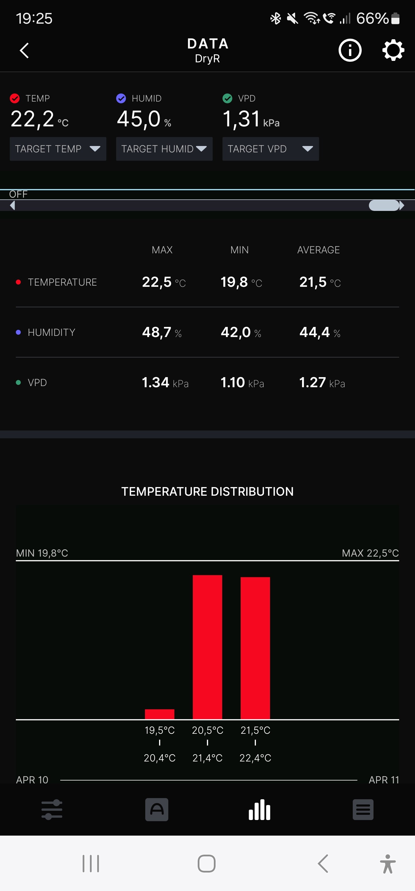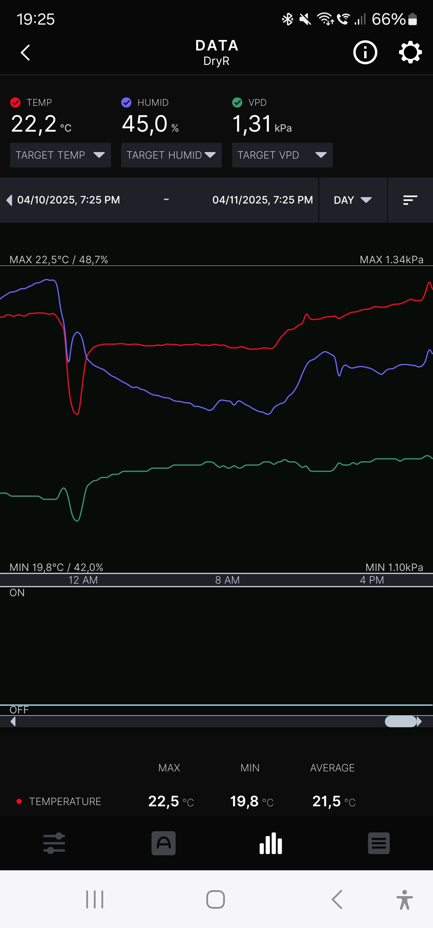 Nun die Werte aus dem Trockenzelt, ich hätte die Temperatur gerne etwas niedriger. Aber wenn ich die Kellertür auf lasse, gibt es Ärger mit der Regierung.