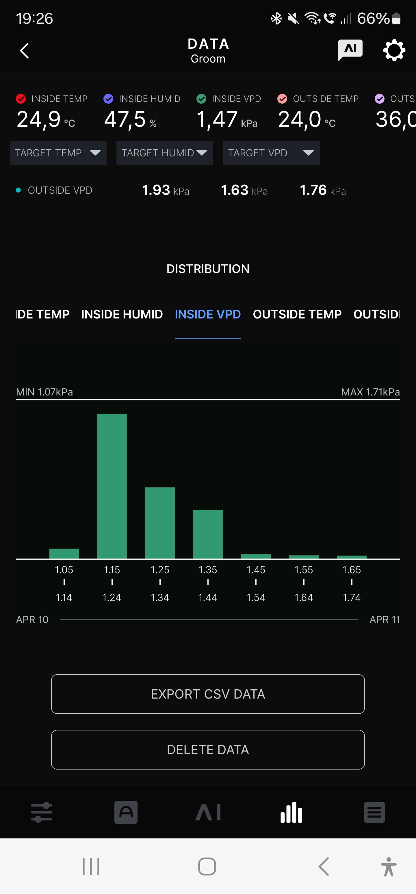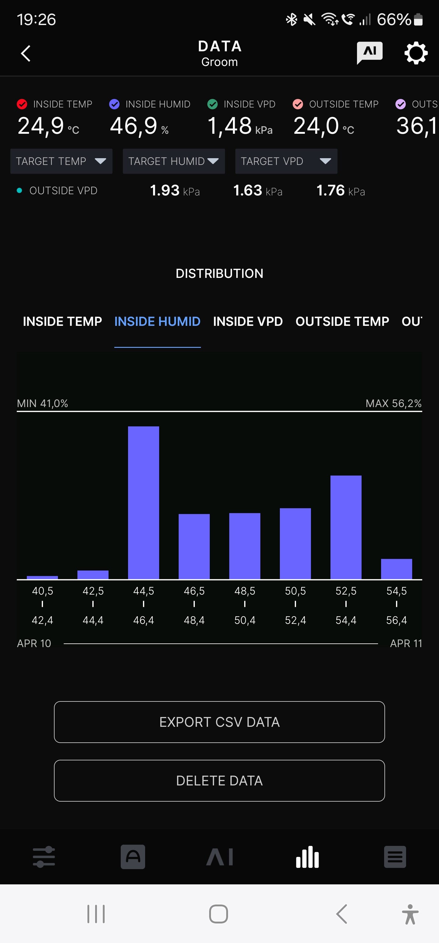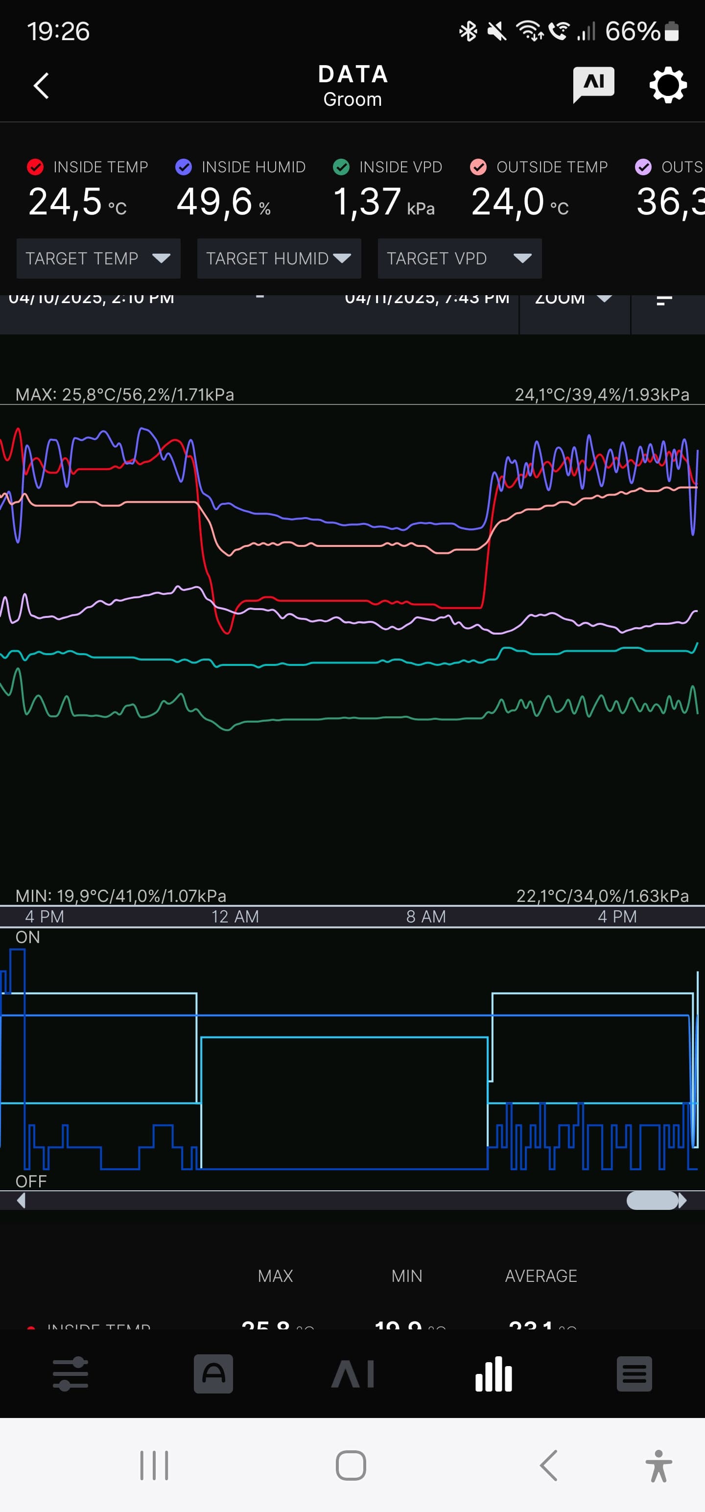 Nun die Werte aus dem Trockenzelt, ich hätte die Temperatur gerne etwas niedriger. Aber wenn ich die Kellertür auf lasse, gibt es Ärger mit der Regierung.