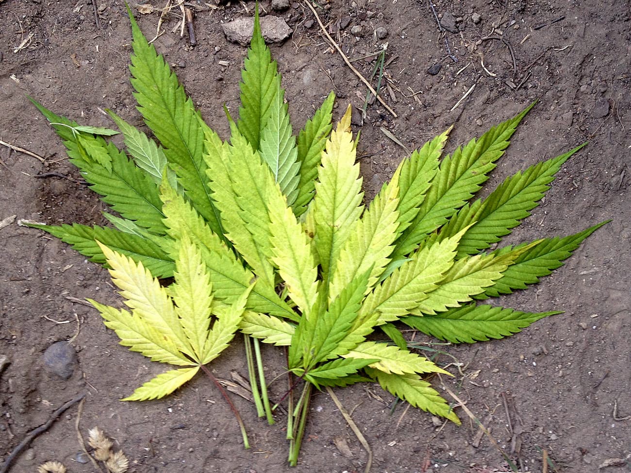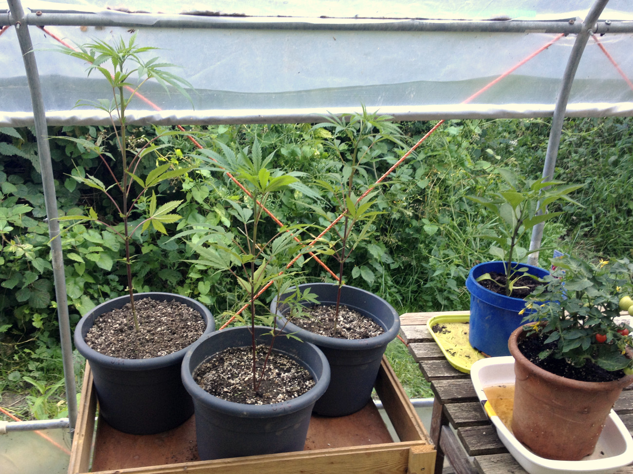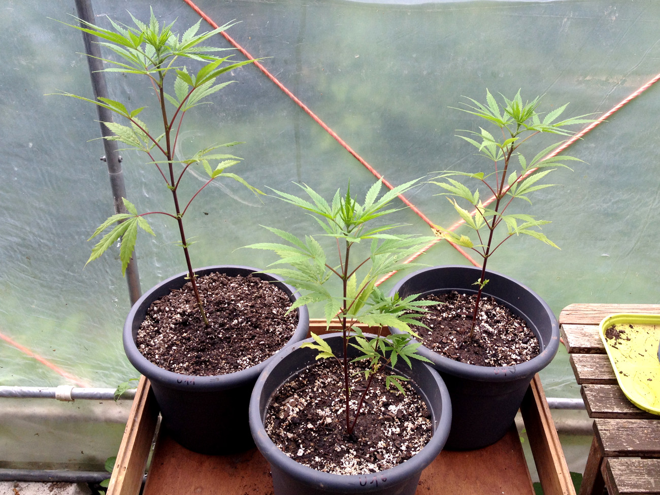 AuĂerdem gab es fĂŒr alle 3 Eimerpflanzen (U1-3, 11 Liter) eine standesgemĂ€Ăe, langsame GieĂung mit nem ordentlichen Schuss Brennesseljauche. Die anderen beiden haben auch helle BlĂ€tter untenrum (heute keine Fotos).