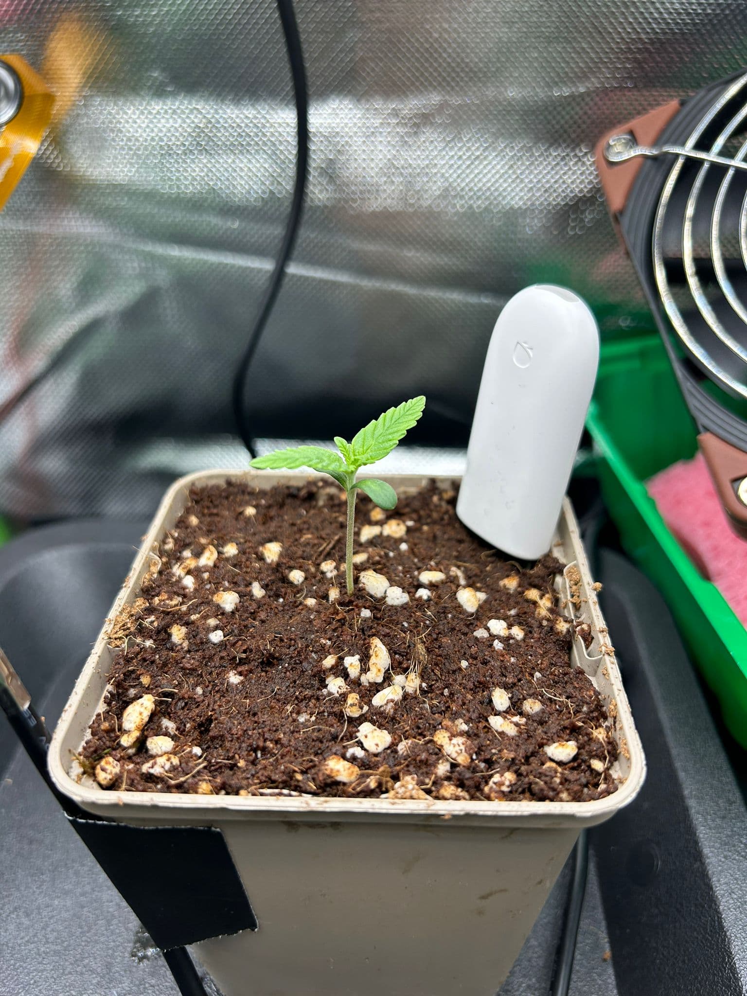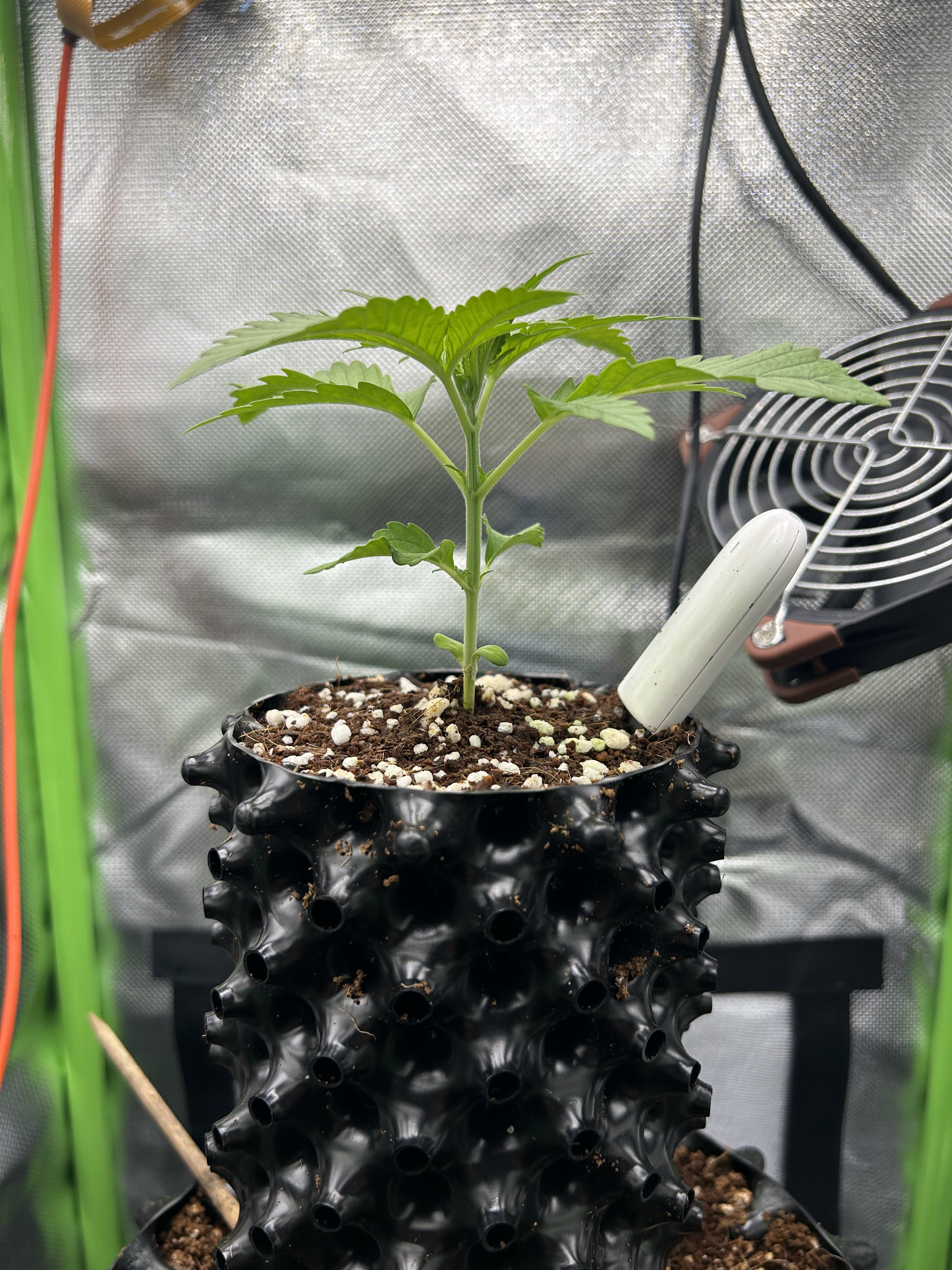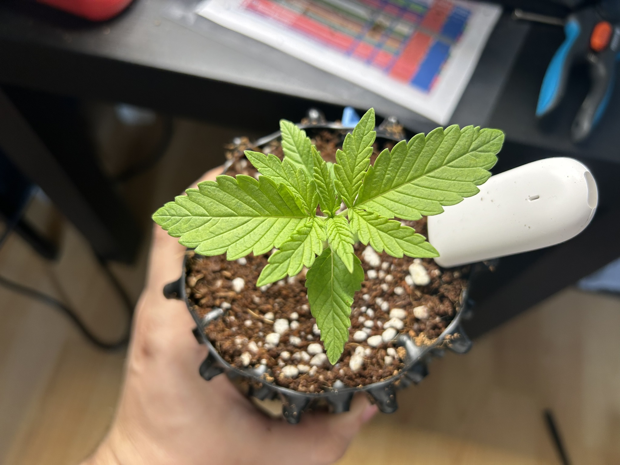 Es wird! 14 Tage nachdem ich den Samen ins lauwarme Wasser geschmissen habe wurde gestern in den 1. 1 Liter Air-Pot umgezogen, die 3-Finger-Blätter sind solide ausgebildet und die ersten 5-Finger-Blätter zeigen sich, so dass ich den gestrigen Tag als VT1 definiere.