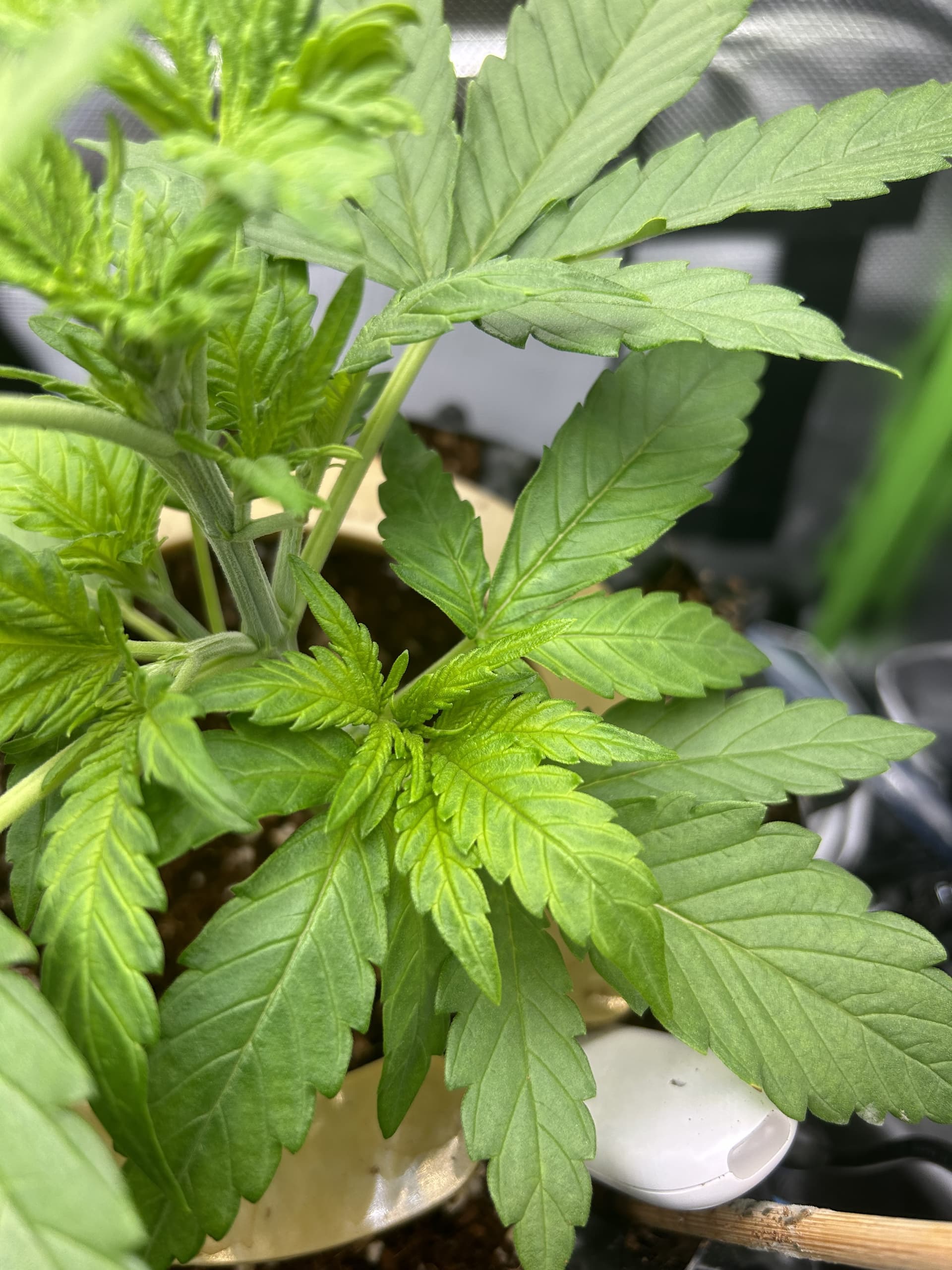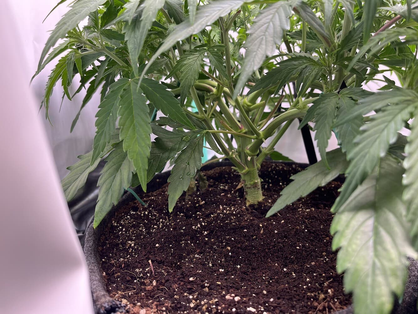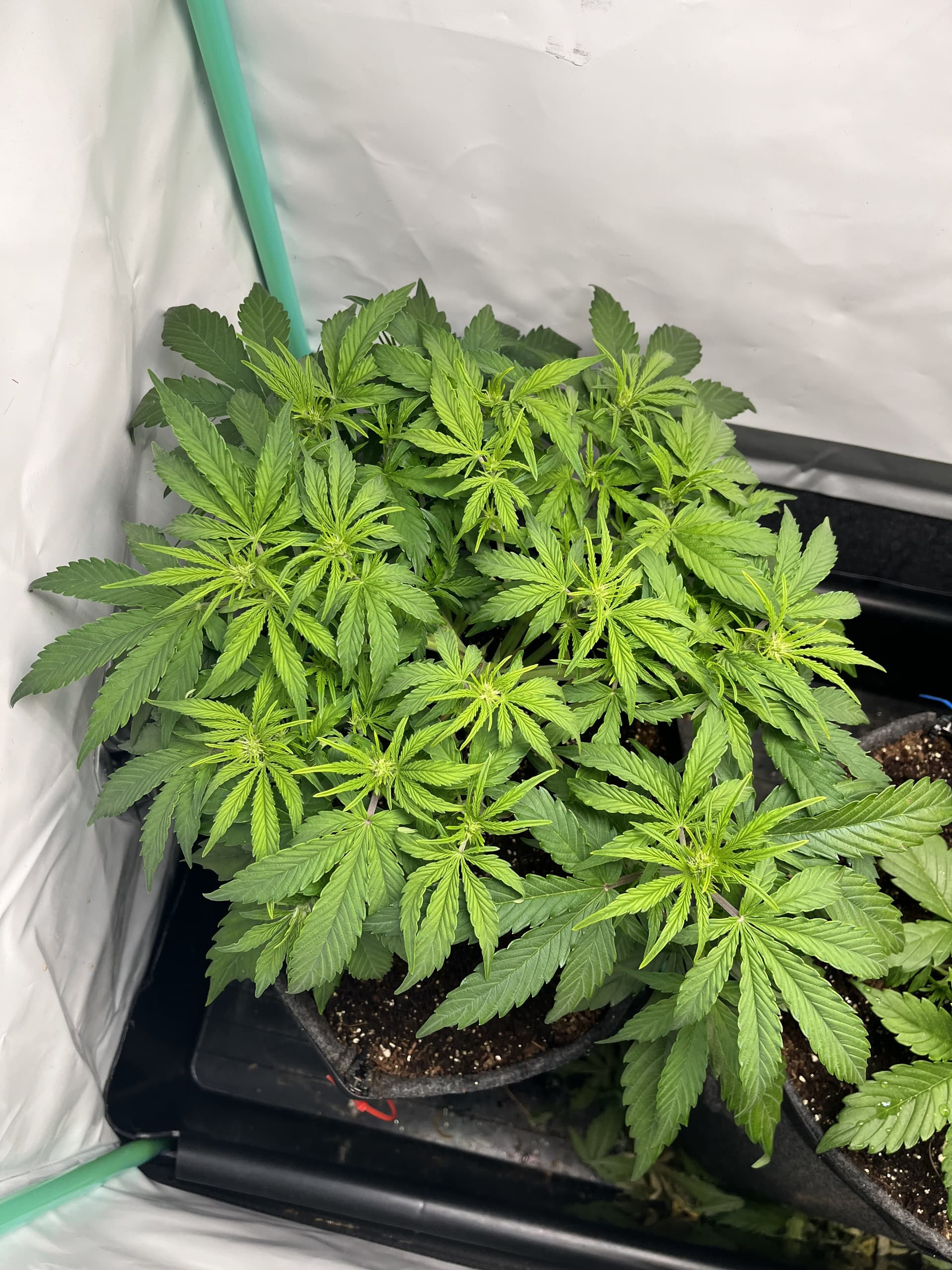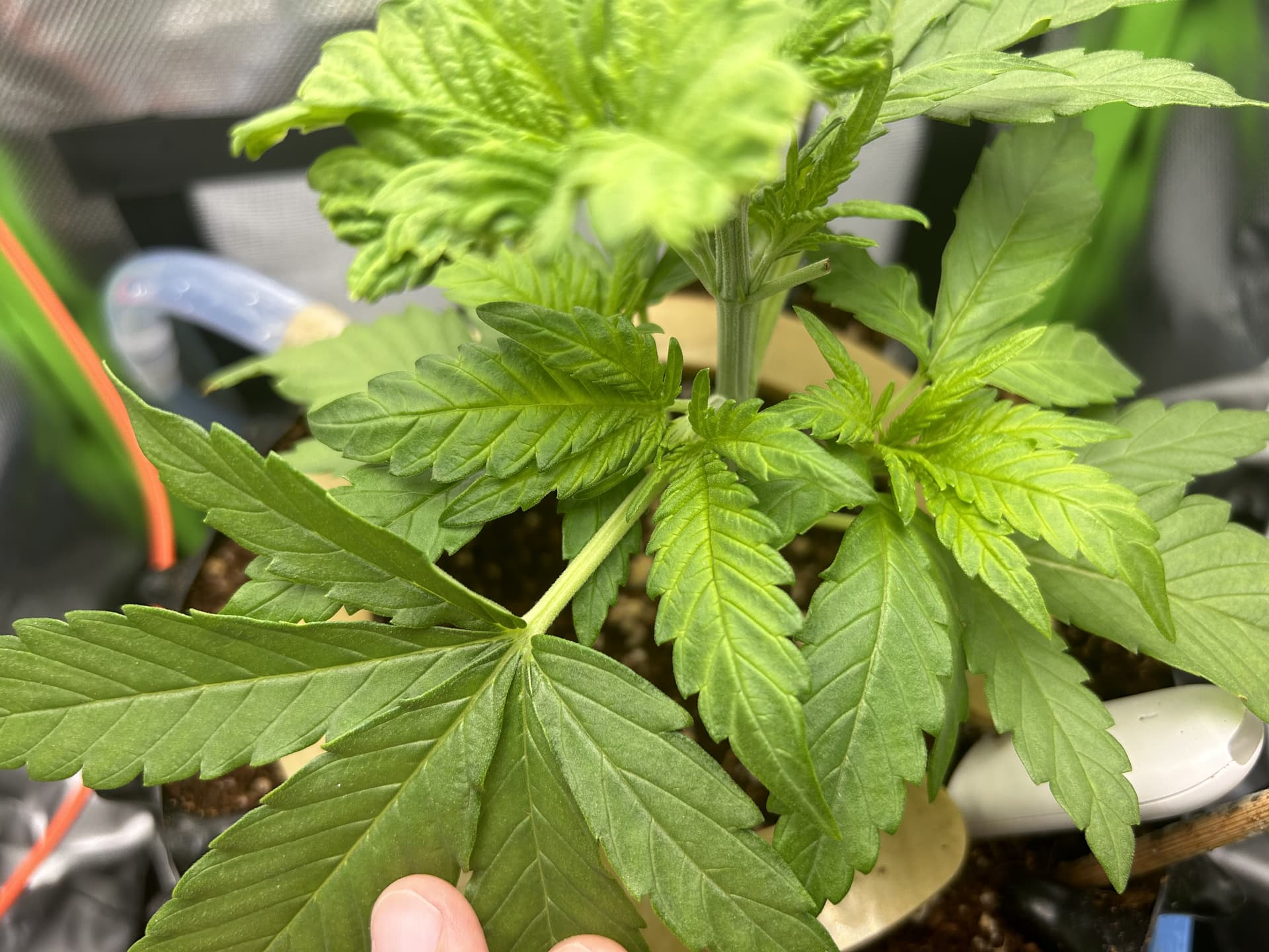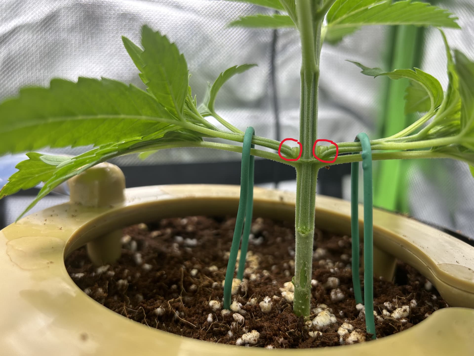mehr Licht…deine Nodienabstände sind sehr lang im foto siehst du das bei mir die nodienabstände sehr eng sind (gewollt)… das erreiche ich am anfang mit 24/7 beleuchtung 10-14 Tage 6500K (hoher blauanteil) und wenn ich die blütelampe rein hänge (ich oldschool auch mit led) bekommt sie auch erst mal mehr licht…so das die nodienabstände kurz bleiben… dann toppen und LST …dann lampe wieder höher und wachsen lassen…dadurch bleiben die Pflanzen schön gedrungen…