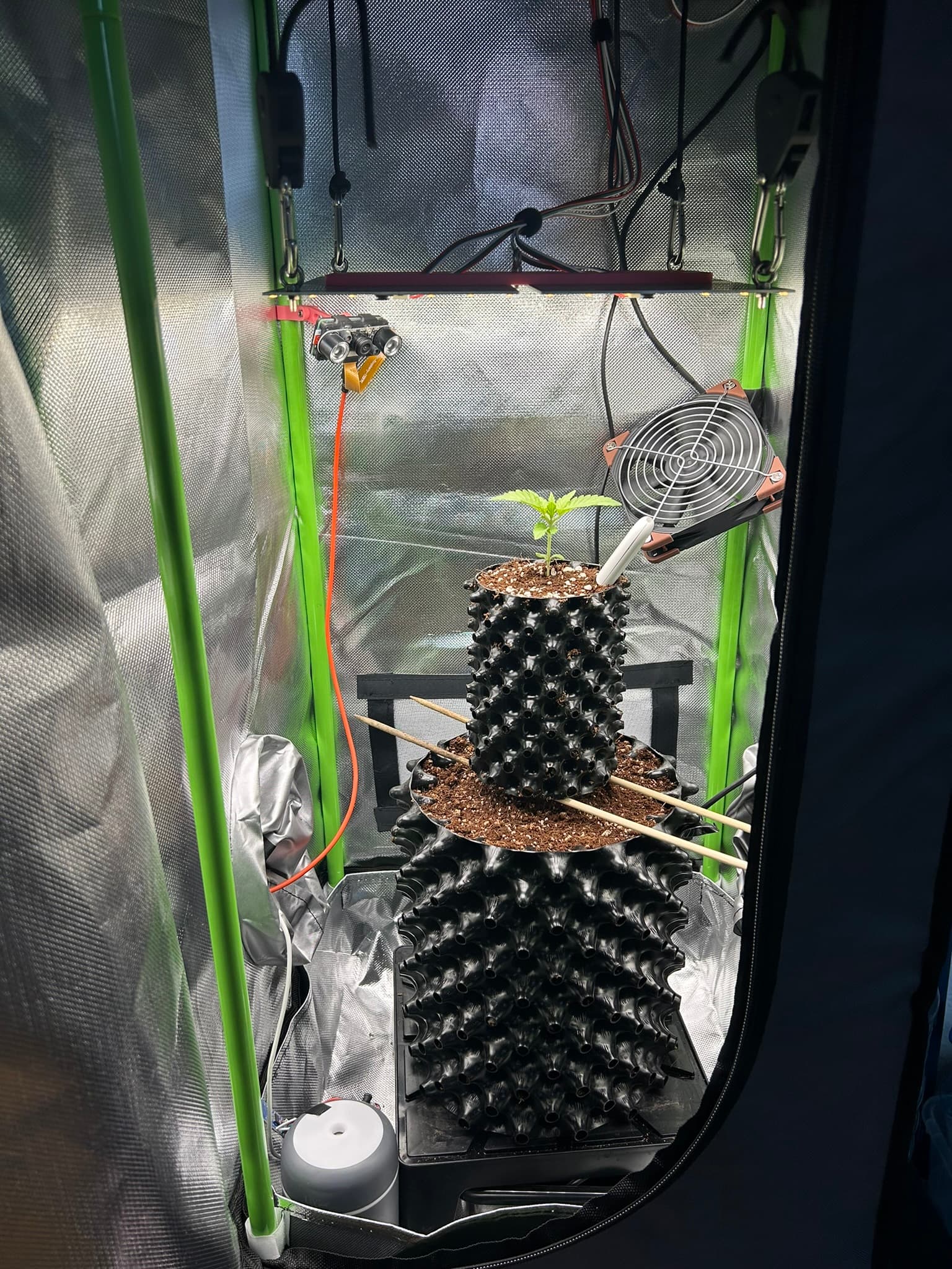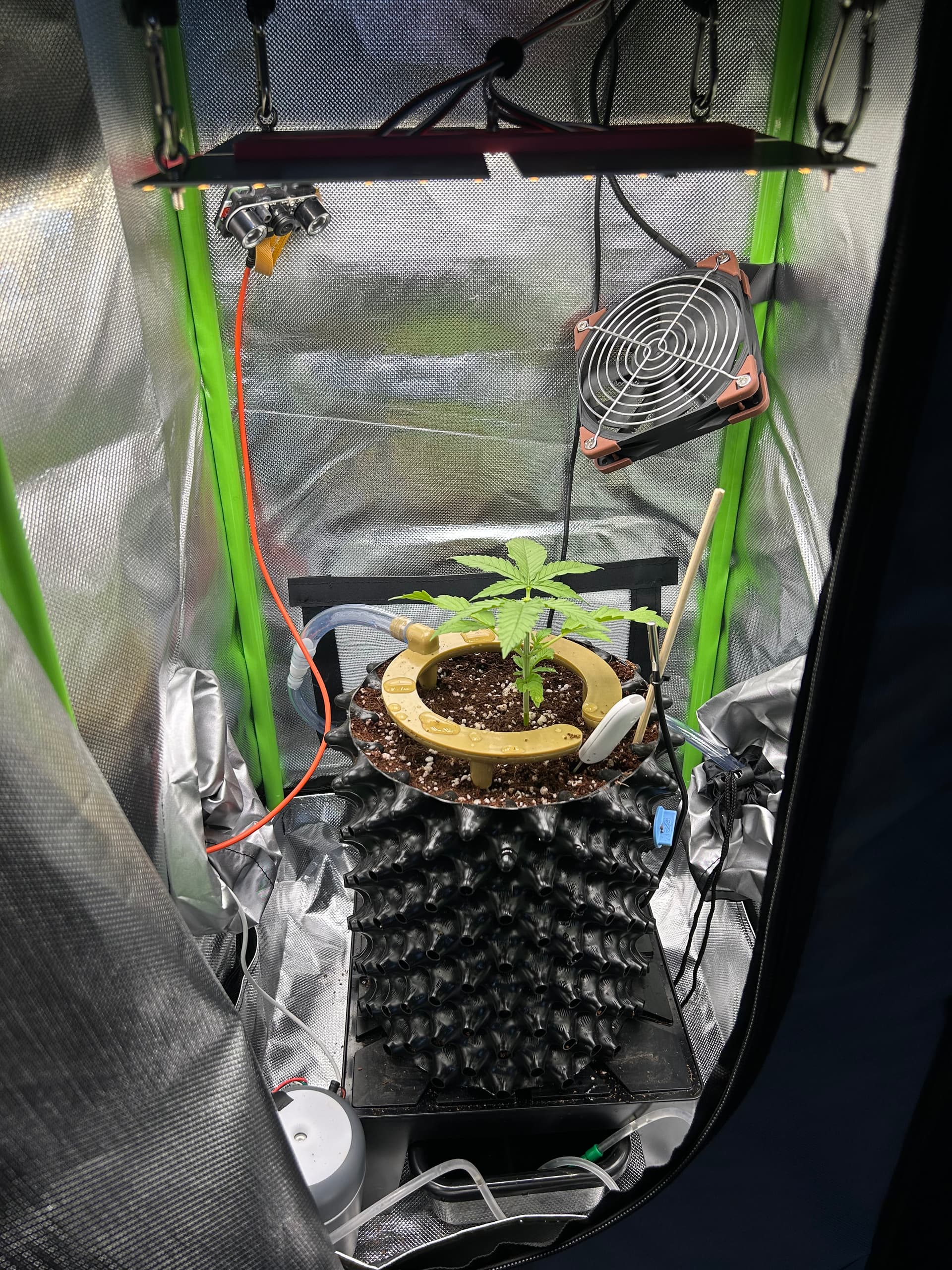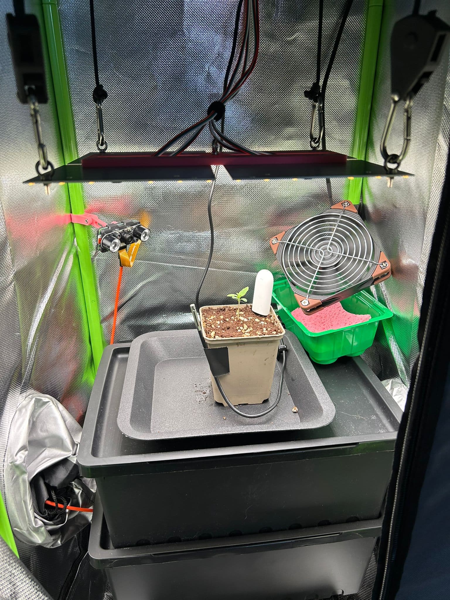 Mit dem Umzug in den Air-Pot gestern bin ich auch einen Schritt im Düngeschema weiter gegangen, es gibt nun 0.6ml/l TriPart grow und micro, und 0.2ml/l bloom, auf 1.1mS/cm EC und pH von etwa 6.1. Tagsüber hats im Zelt jetzt etwa 27-28 Grad Celsius, Nachts kühlt es auf 23 Grad herunter. Zur Regulierung der RLF habe ich noch einen Jeff-Bezos-Spezial-Mini-Luftbefeuchter im Zelt stehen, welcher professionell smartifiziert wurde.